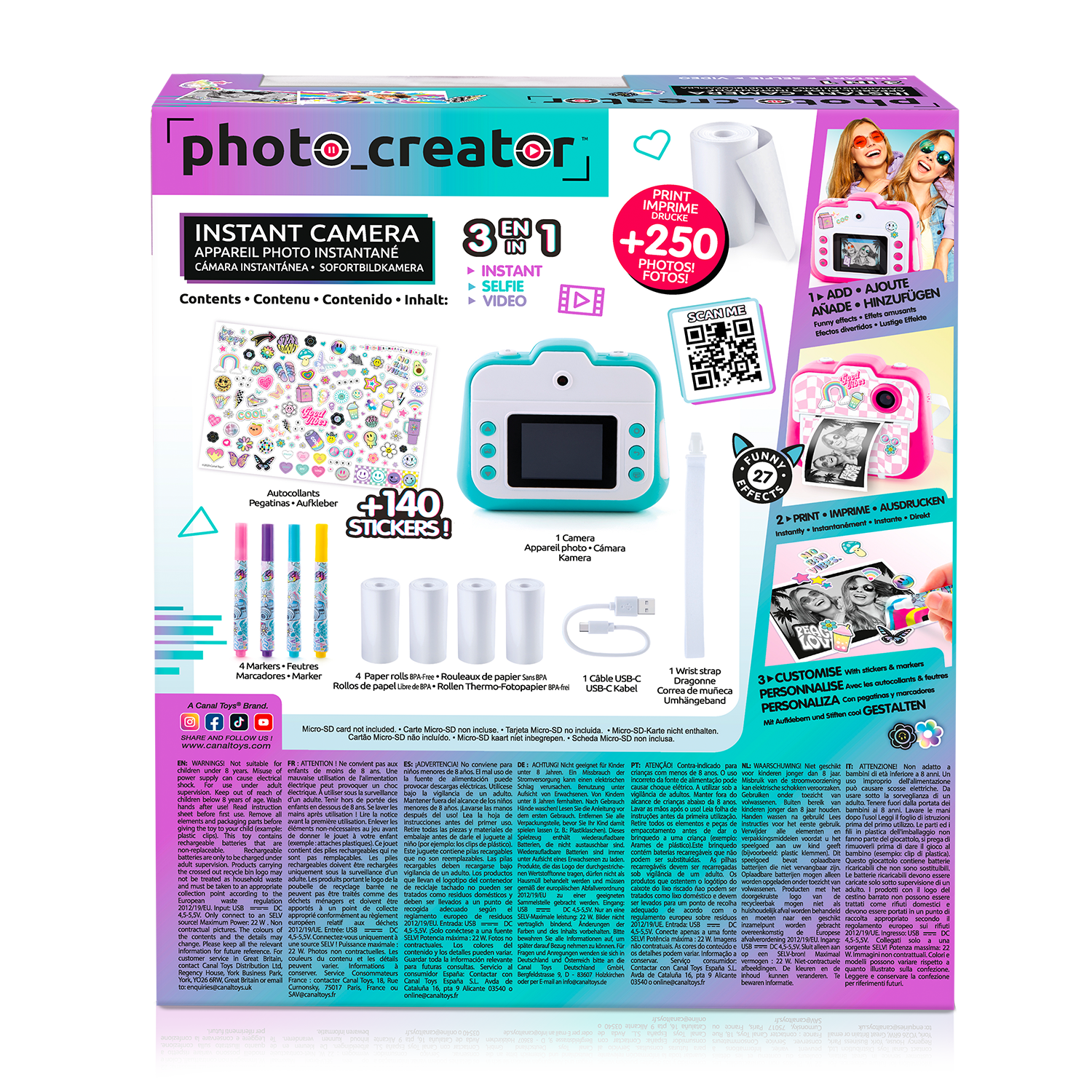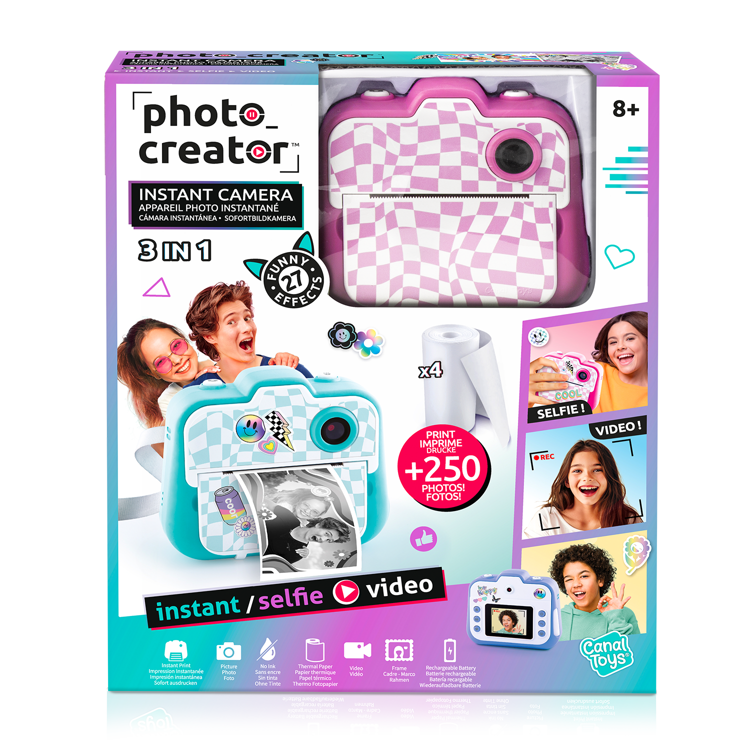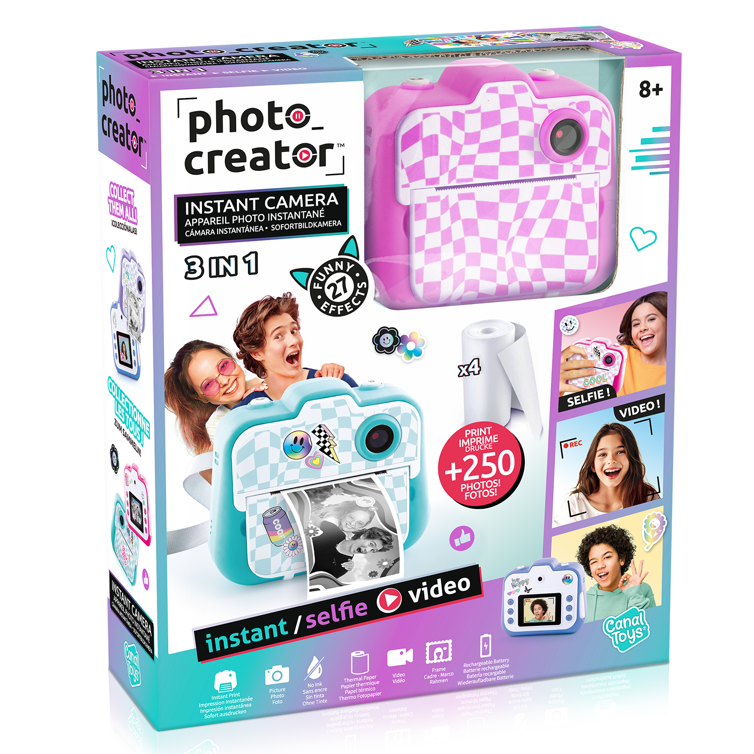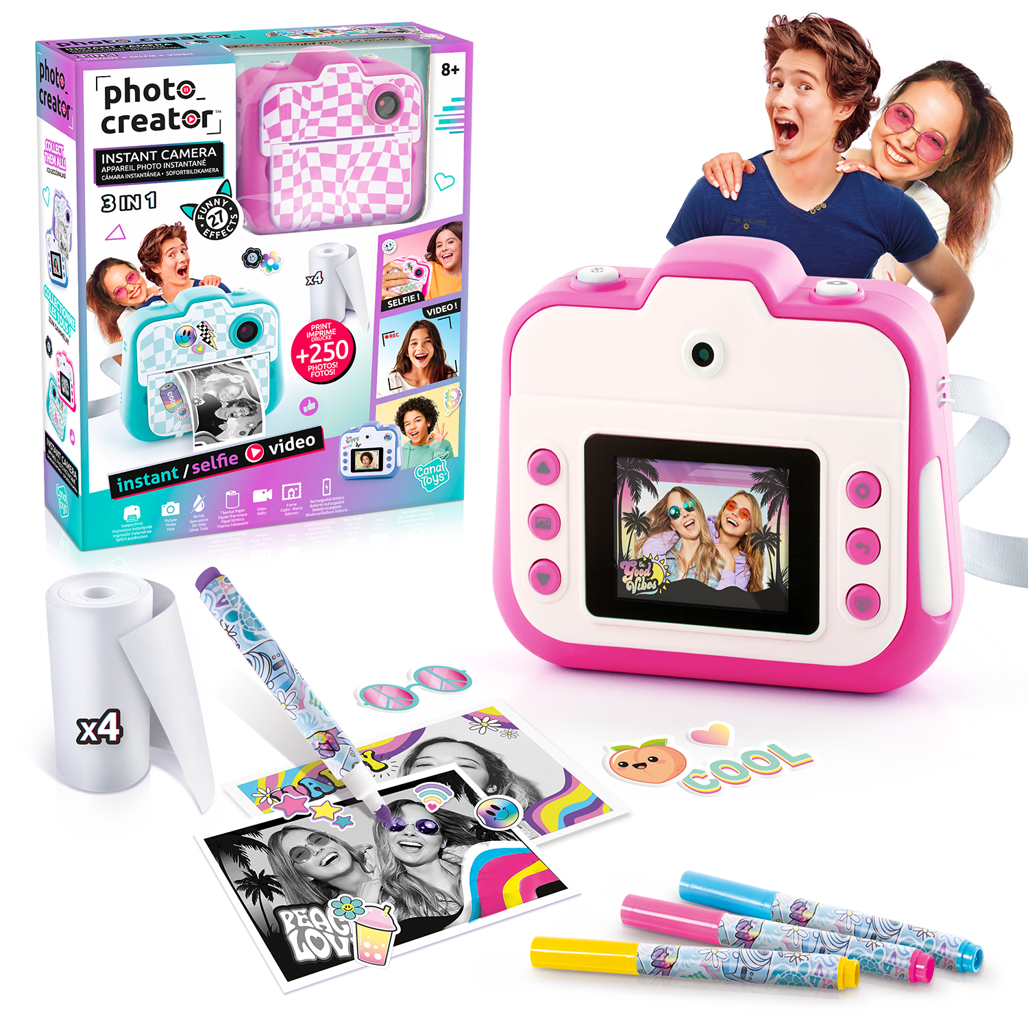 Diviértete durante horas y da rienda suelta a tu creatividad con esta cámara. Captura tus vídeos o fotos. ¡Añade divertidos efectos e imprime las fotos al instante! ¡Puedes personalizarlas con rotuladores y pegatinas! Imprime más de 250 fotos. ¡4 colores para coleccionar!
