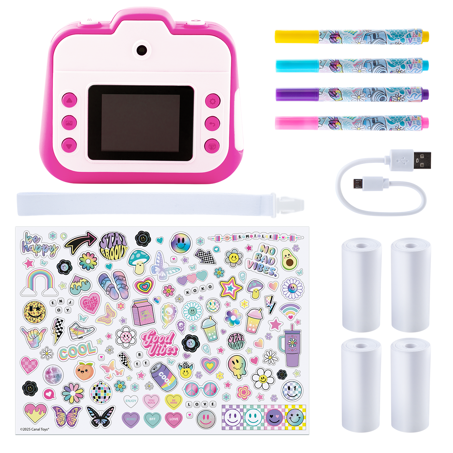 - 1 Cámara - 1 Cable USB-C - 1 Correa de muñeca - 4 Rollos de papel - 1 Hoja de pegatinas - 4 Rotuladores - 1 Manual
