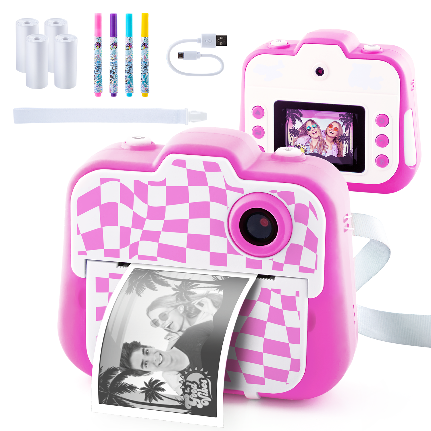 - CONTENIDO: 1 cámara digital, 1 cable de carga USB, 1 correa para la muñeca, 4 rollos de papel térmico, 4 rotuladores, 1 hoja de pegatinas. Este kit permite imprimir más de 250 fotos.
