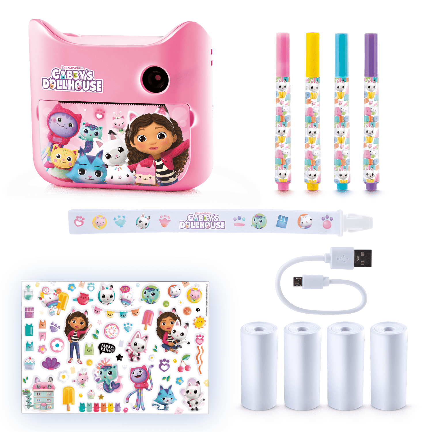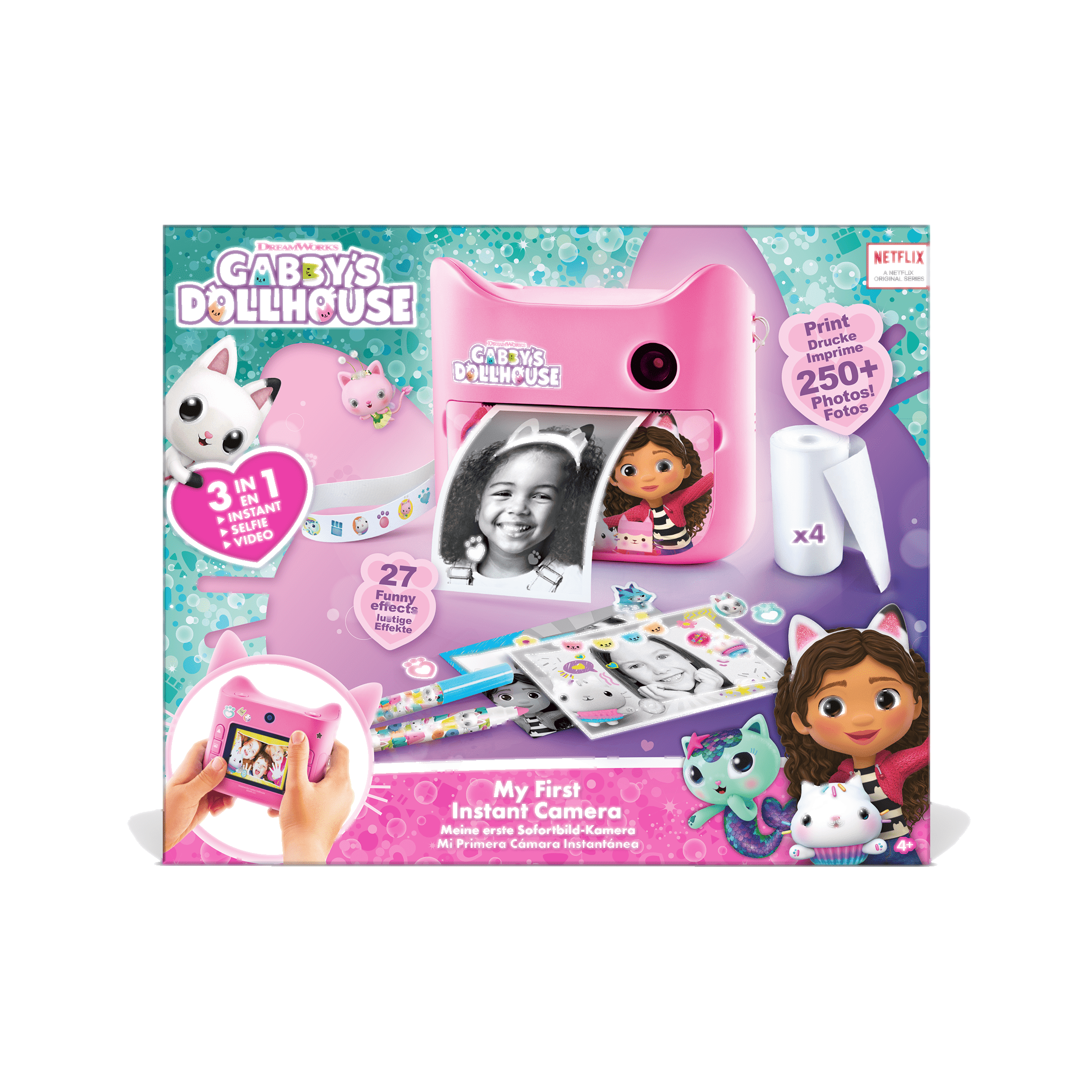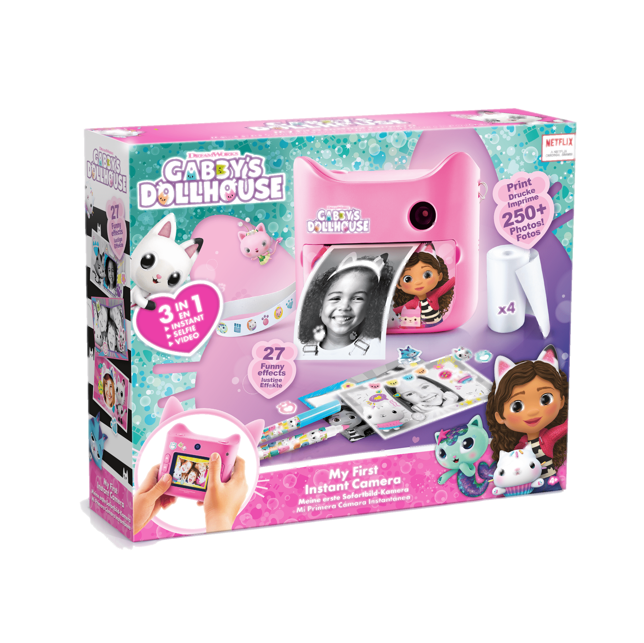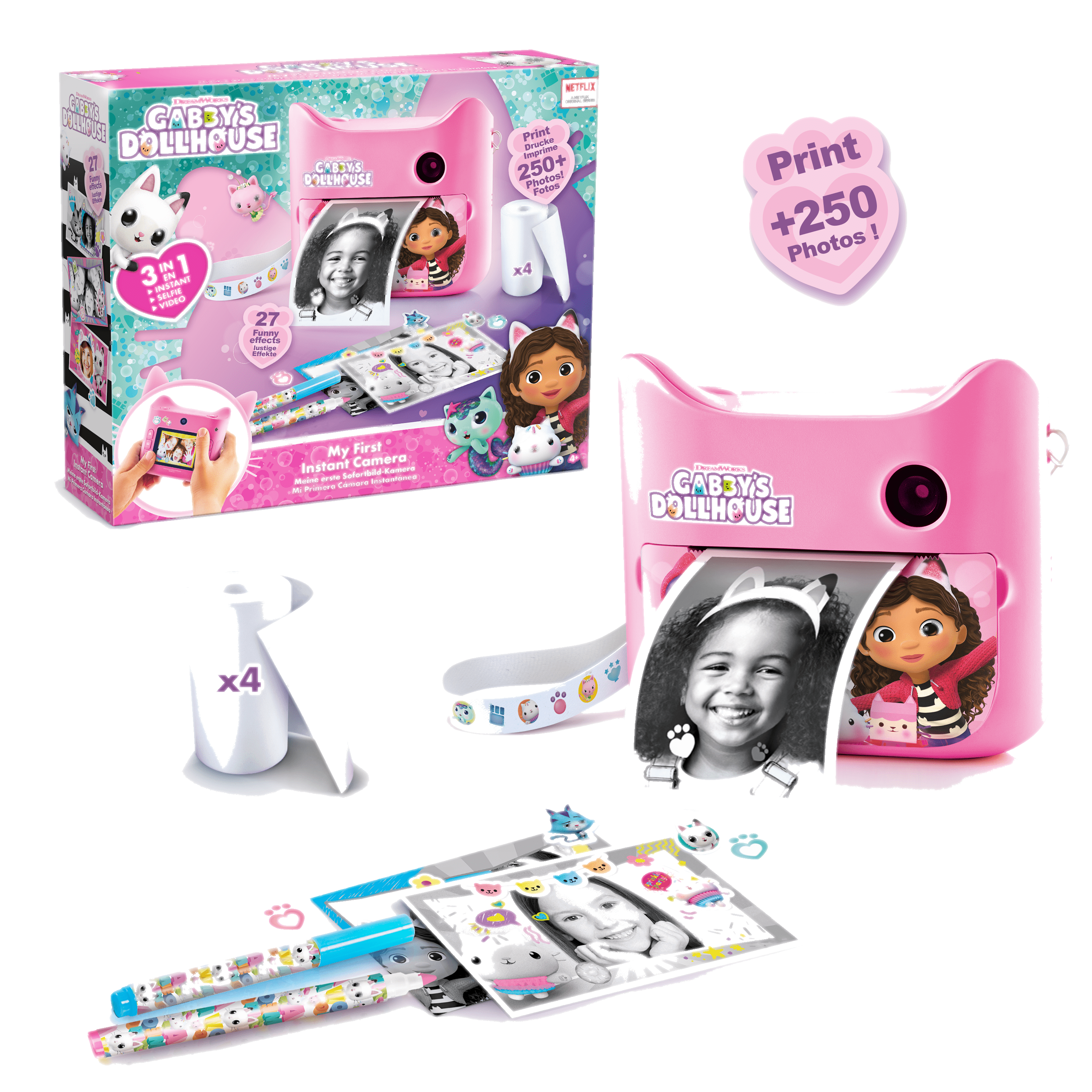DISEÑO DE GABBY Y LA CASA DE MUÑECAS DE GABBY: ¡Una cámara con un diseño único de Gabby y todos sus amigos! Los filtros y pegatinas suministrados también son del dibujo animado, ¡para que puedas personalizar tus fotos! Haz fotos en modo retrato, paisaje o selfie con la doble lente. Después, con un solo clic, imprímelas al instante en blanco y negro y crea tu propio estilo personalizándolas con los rotuladores y pegatinas incluidos.