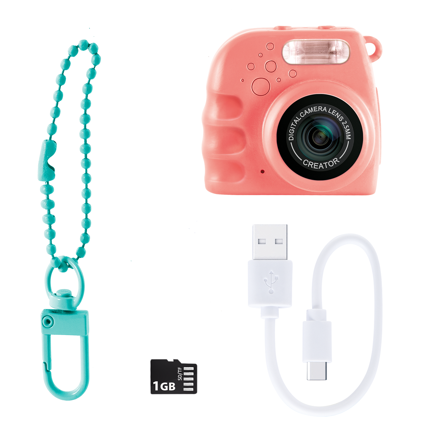 - 1 mini cámara digital - 1 llavero - 1 tarjeta micro-SD de 1 GB - 1 cable de carga USB-C
