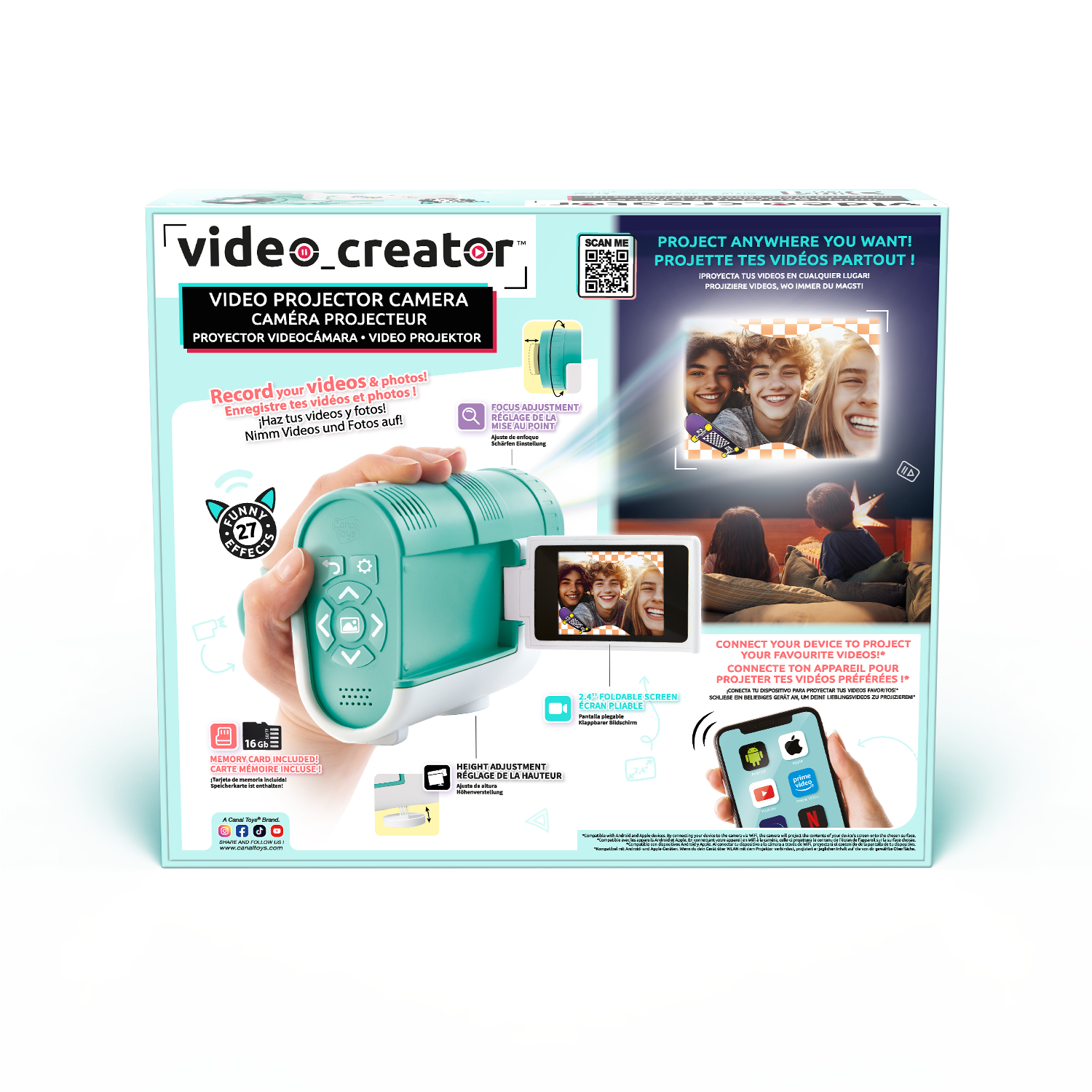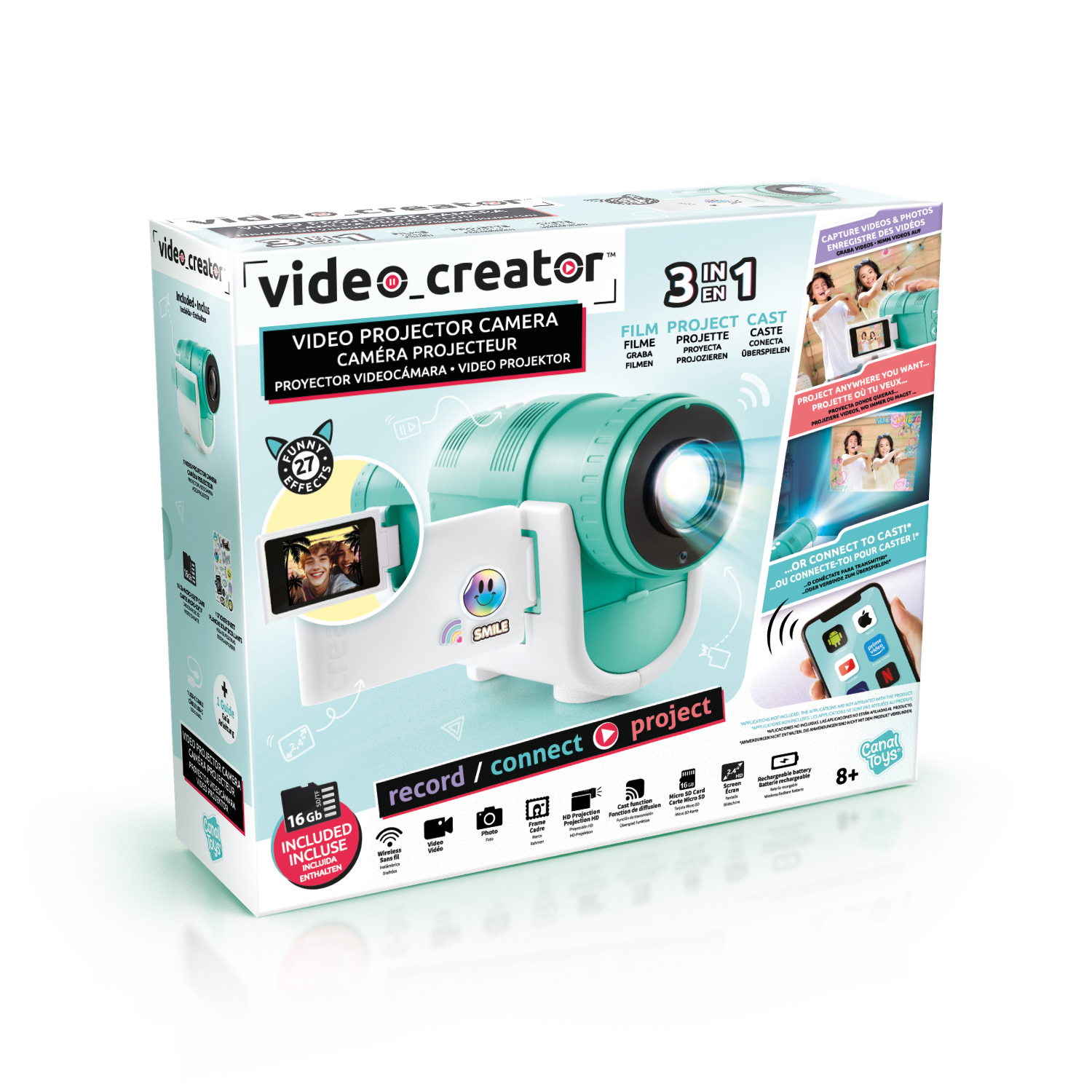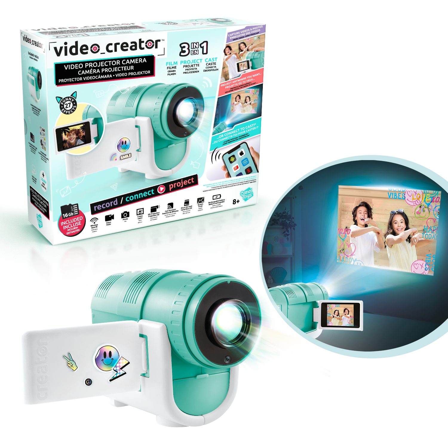 ¡Una videocámara única con proyector para grabar vídeos, hacer fotos y proyectarlas al instante en cualquier superficie de forma muy sencilla! ¡Conecta tu smartphone o tablet y proyecta la pantalla del dispositivo en cualquier lugar! Tarjeta SD y hoja de pegatinas incluidas.