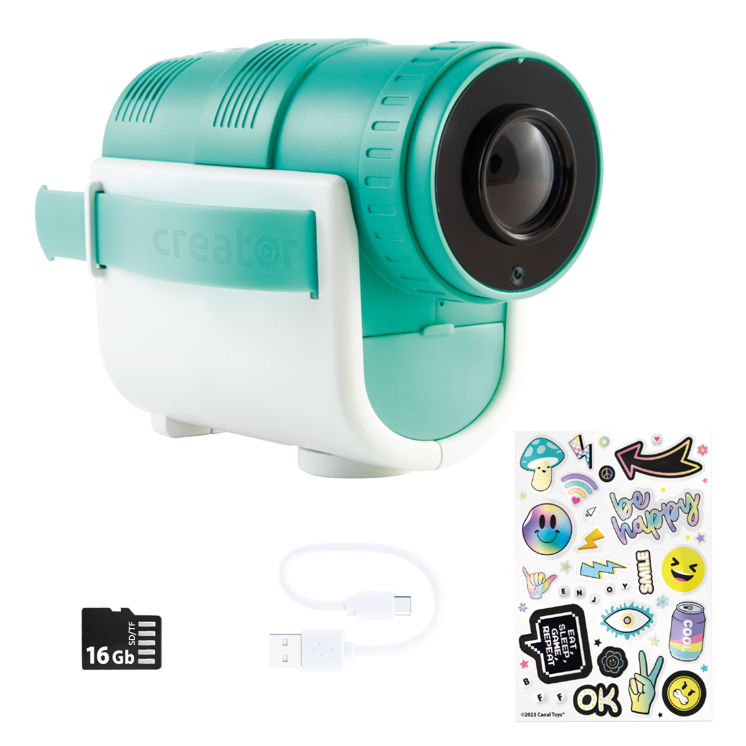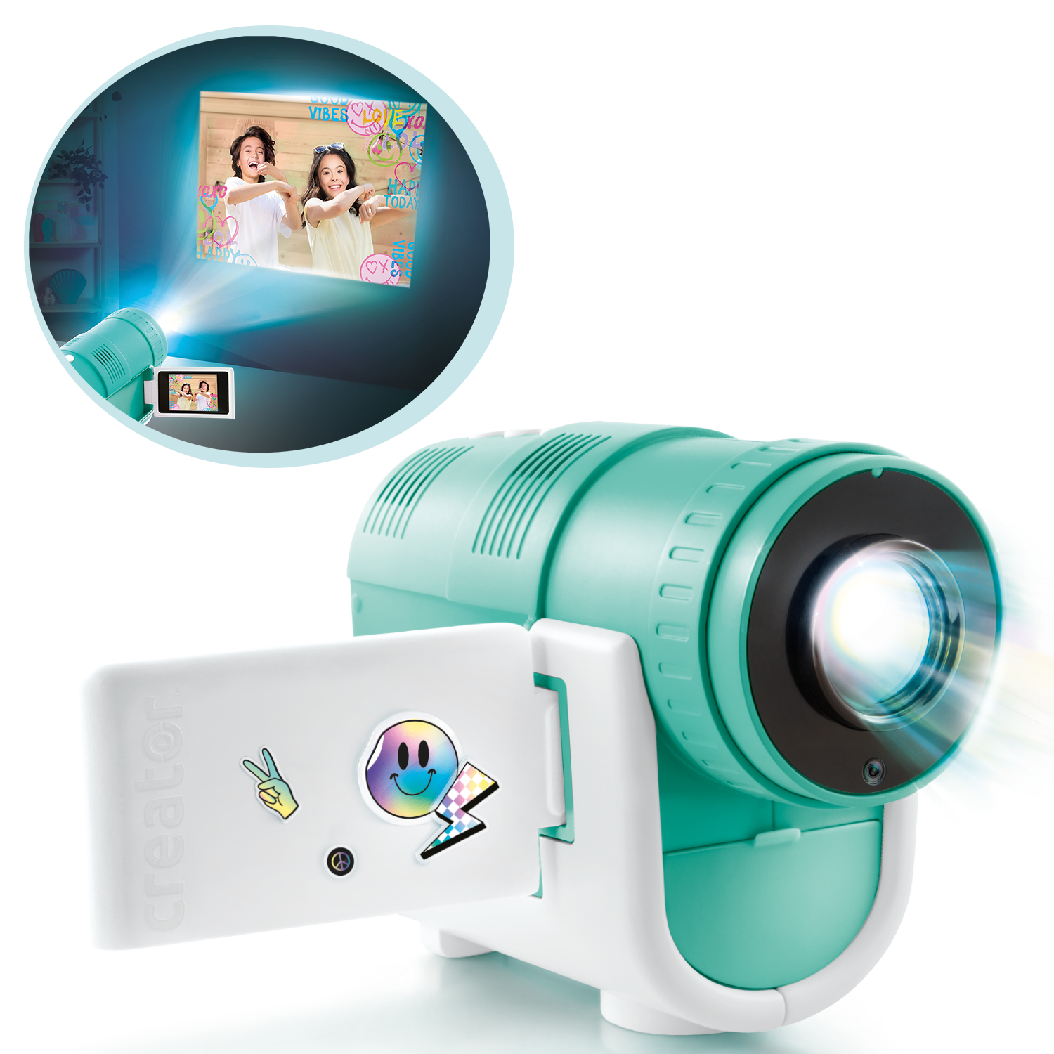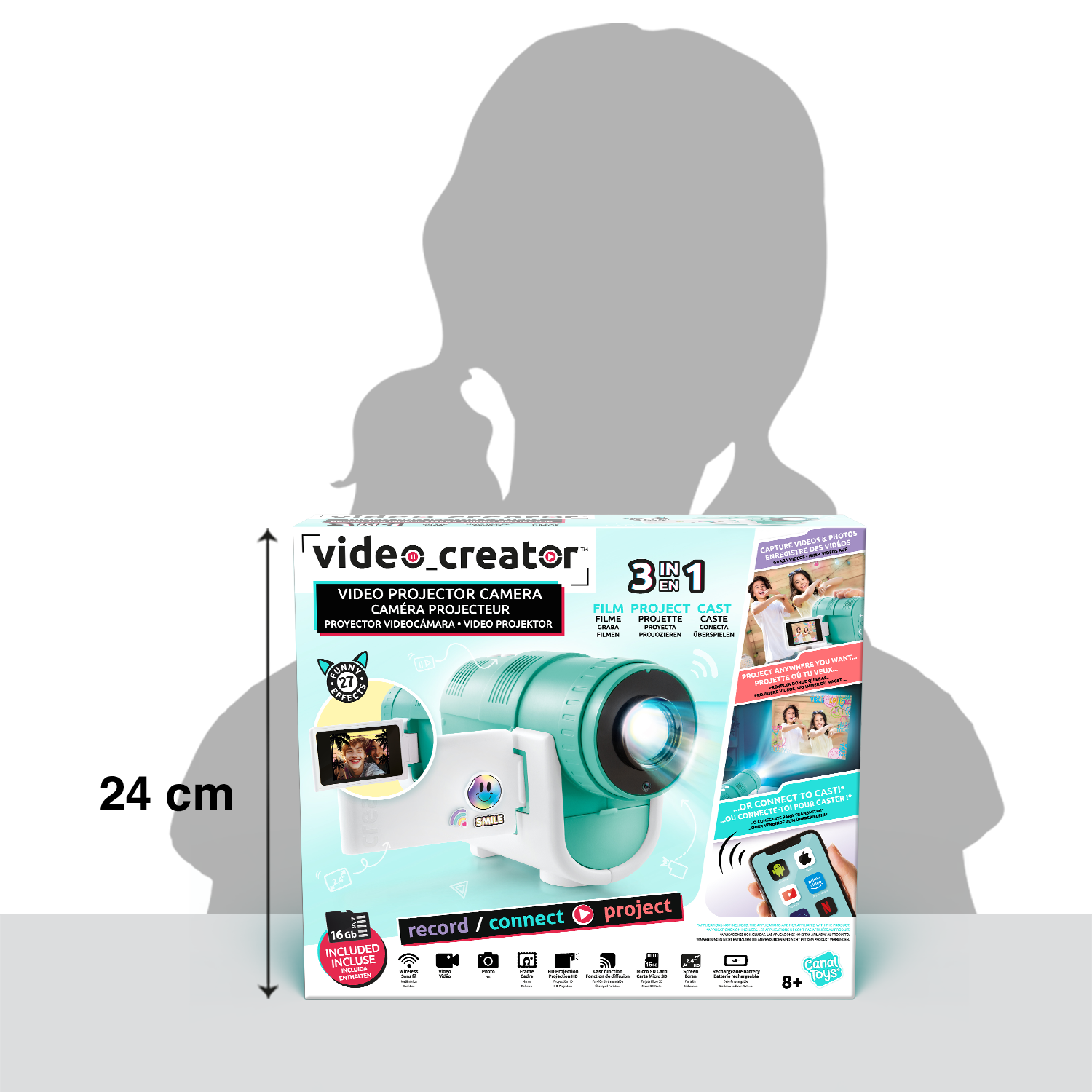 ¡Una videocámara única con proyector para grabar vídeos, hacer fotos y proyectarlas al instante en cualquier superficie de forma muy sencilla! ¡Conecta tu smartphone o tablet y proyecta la pantalla del dispositivo en cualquier lugar! Tarjeta SD y hoja de pegatinas incluidas.