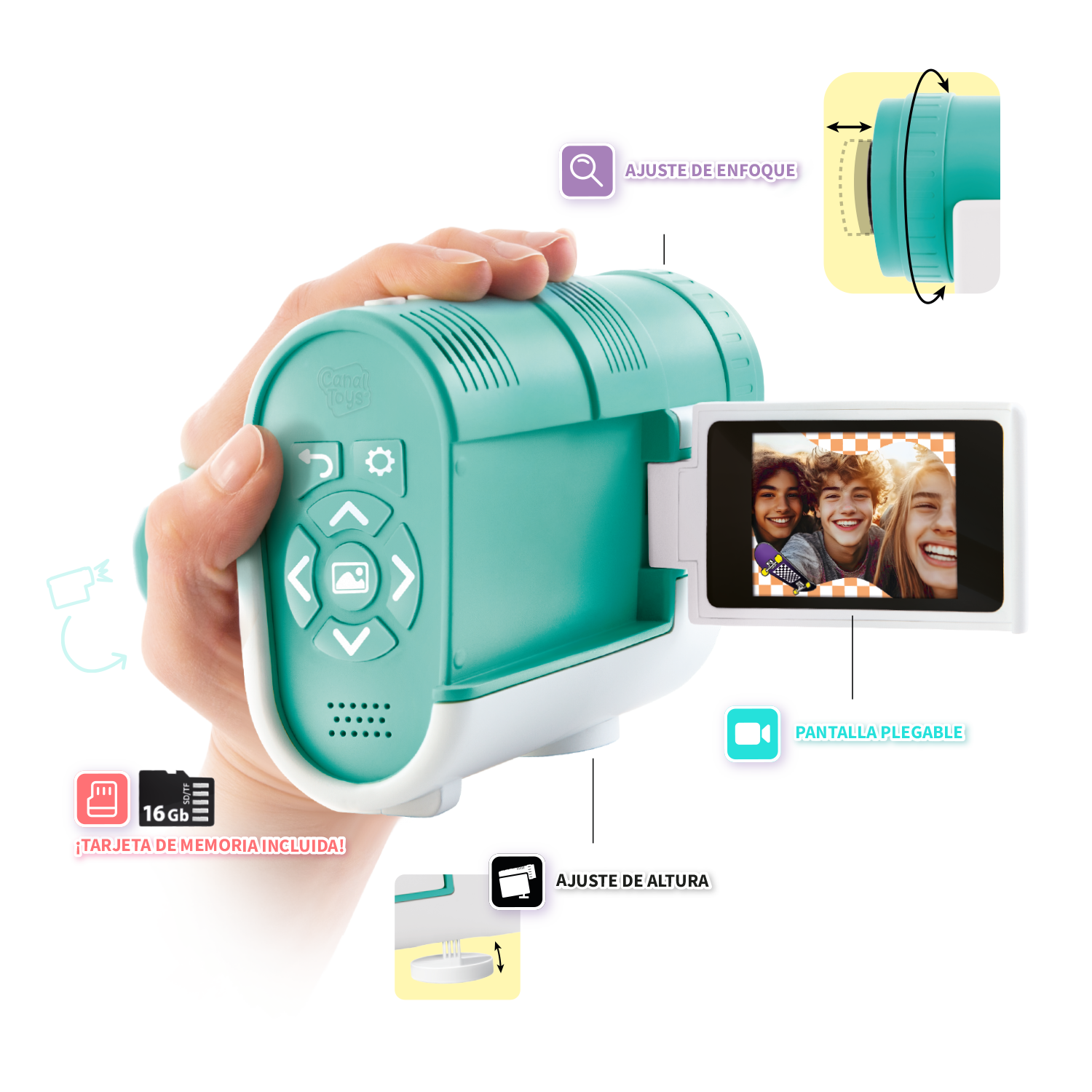 CÁMARA Y PROYECTOR: Captura tus mejores momentos en fotos o vídeos, ya sean cotidianos, de tus seres queridos o recuerdos inolvidables. Gracias a la pantalla LCD en color plegable, podrás ver todas tus grabaciones como en una auténtica videocámara. Active el modo de proyección para mostrar sus recuerdos directamente en la pared o en cualquier superficie plana, como un auténtico proyector de vídeo. Para una comodidad óptima, el dispositivo cuenta con una correa lateral, que proporciona un agarre seguro mientras graba. Se incluye una tarjeta micro-SD, que le permite guardar fácilmente todos sus vídeos y fotos, verlos en cualquier momento o transferirlos para compartirlos con su familia y amigos.