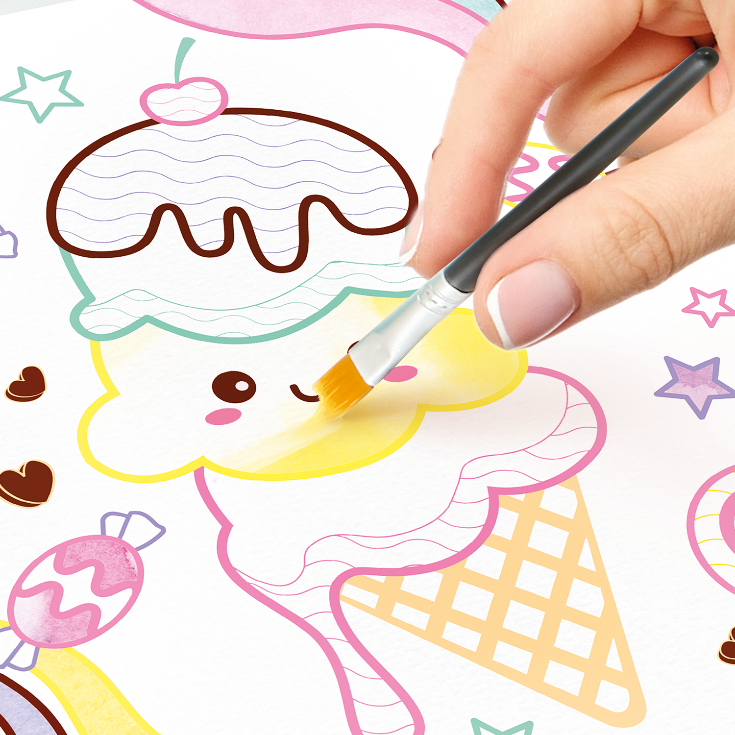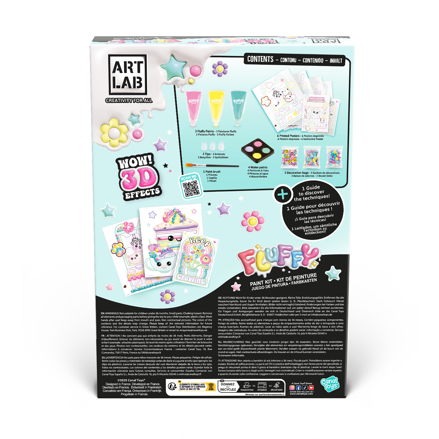 • INCLUYE: 3 pinturas Fluffy, 4 pinturas acuarela, 6 pósters, 3 sobres de decoración, 1 pincel, 1 manual de instrucciones.