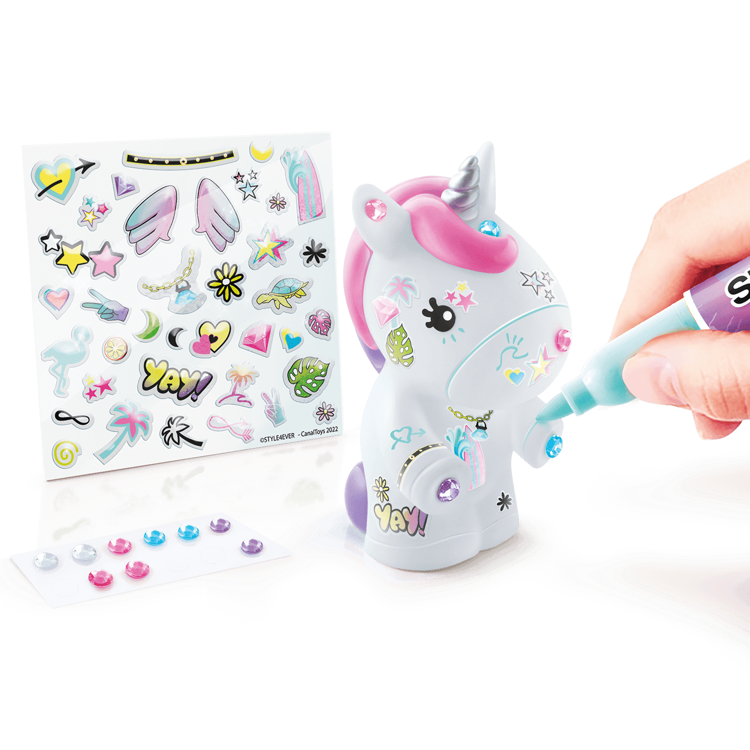 ¡Colorea y decora tu Unicornio, tu Dinosaurio y tu Gatito con más de 100 pegatinas y gemas y dale el toque final con el rotulador!
