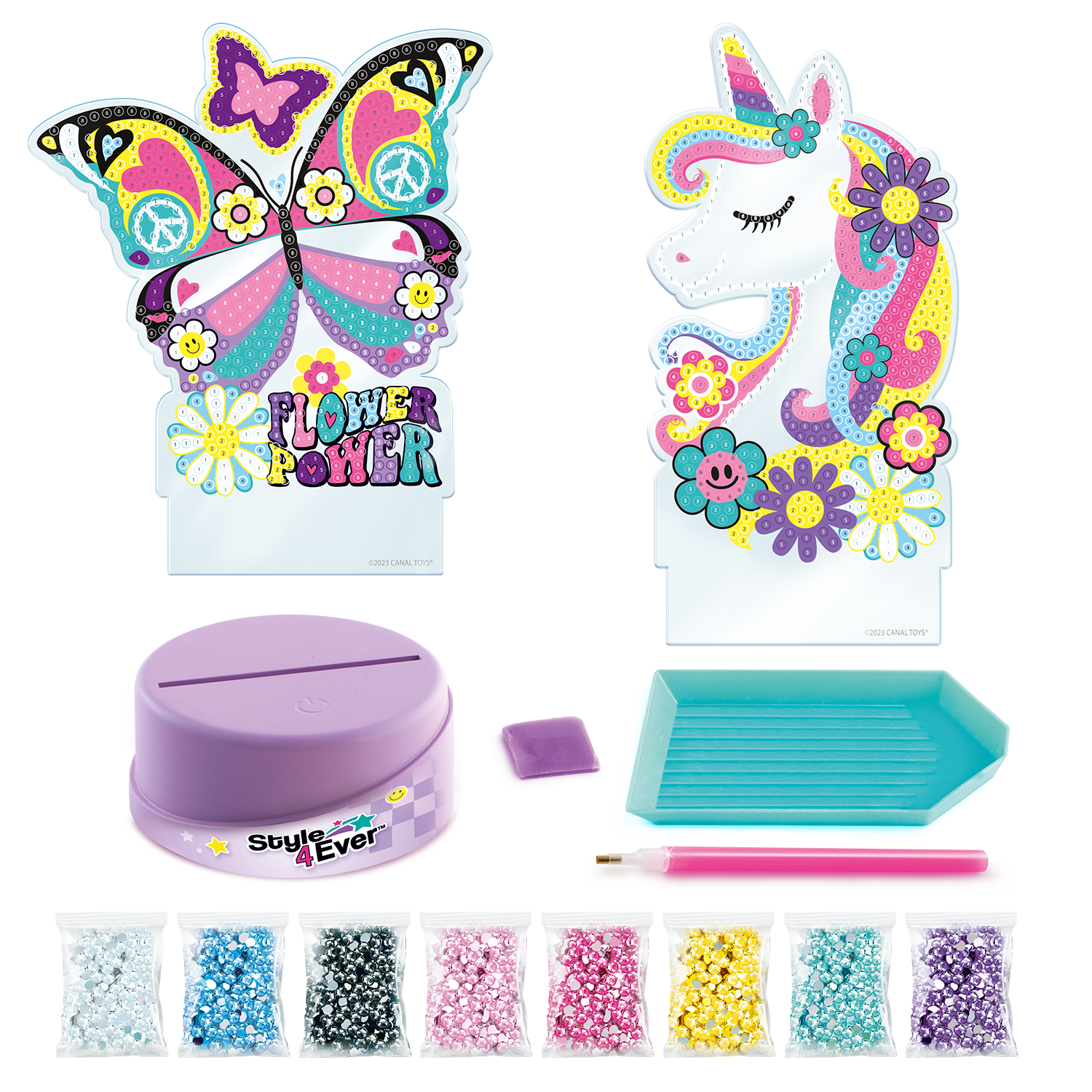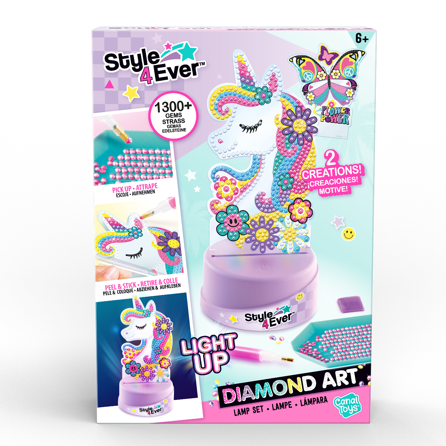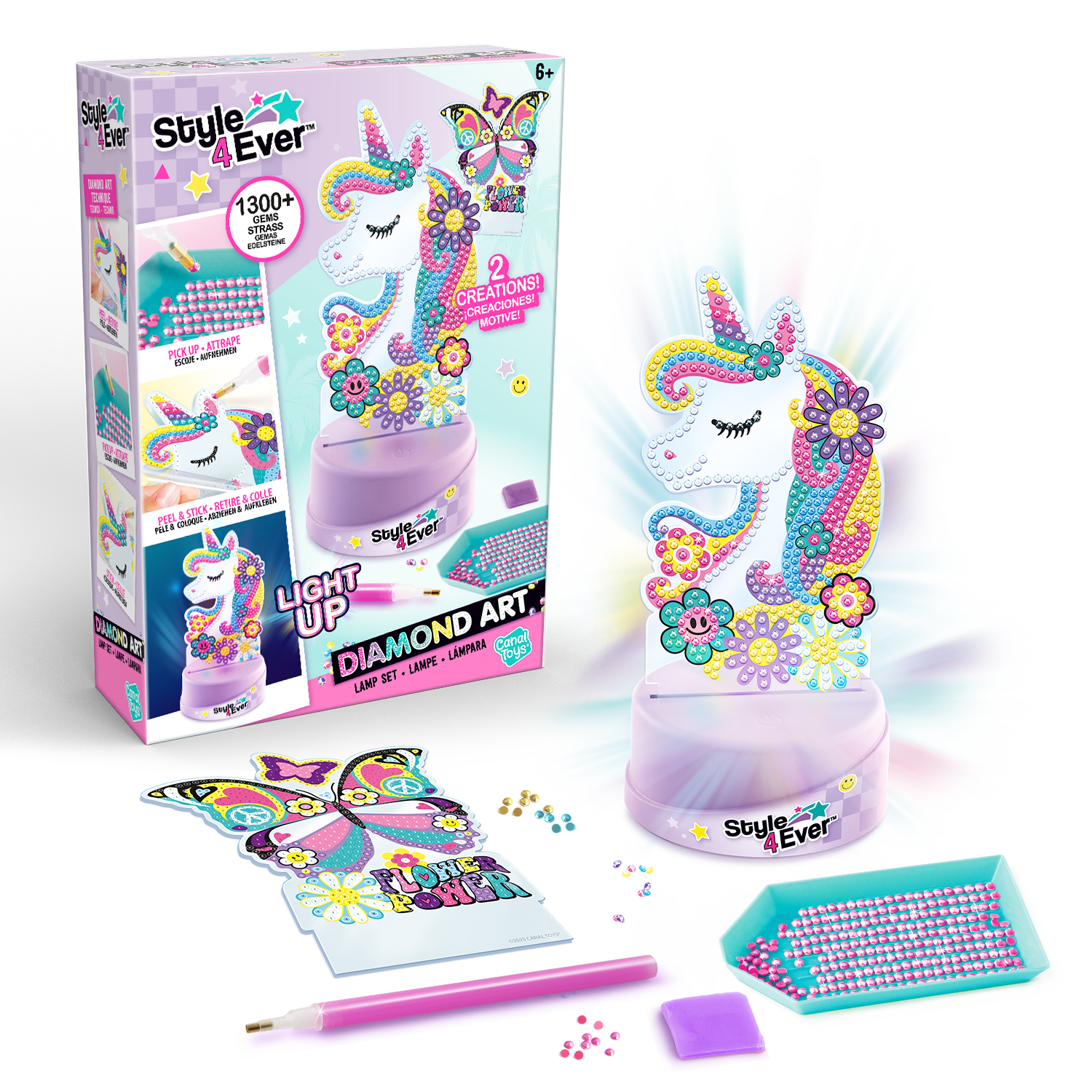 Un set con 2 personajes para decorar con la técnica de pintura de diamantes. Elige tu personaje y coloca las gemas uno a uno siguiendo el diseño. Una vez terminado, ¡colócalo en la base iluminada para que brille en la oscuridad!