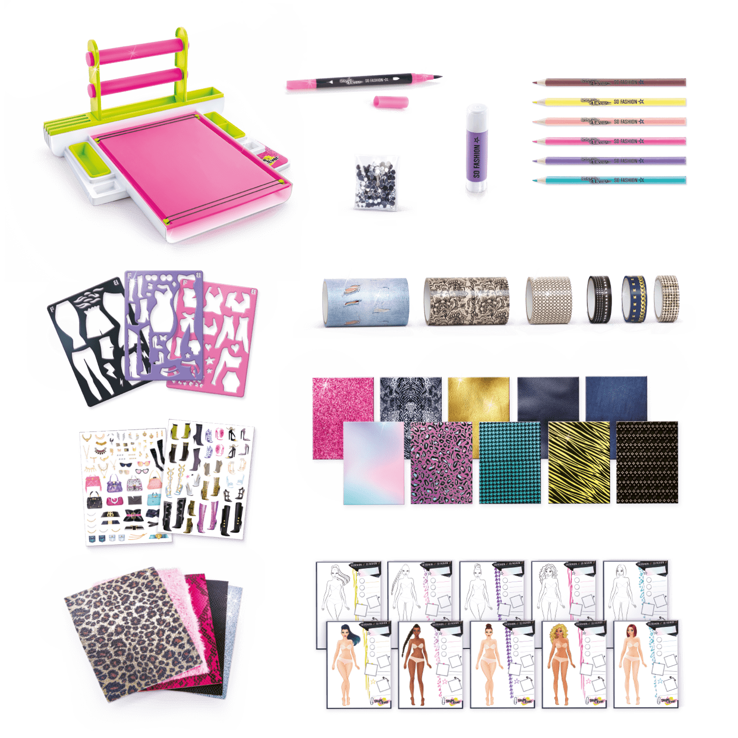 Los numerosos accesorios incluidos te permitirán hacer muchos conjuntos fácilmente. Está equipado con todo lo que el diseñador necesita: plantillas, telas, papeles impresos, cintas, pegamento, tijeras, lápices… Los modelos realmente se corresponden con la tendencia actual.