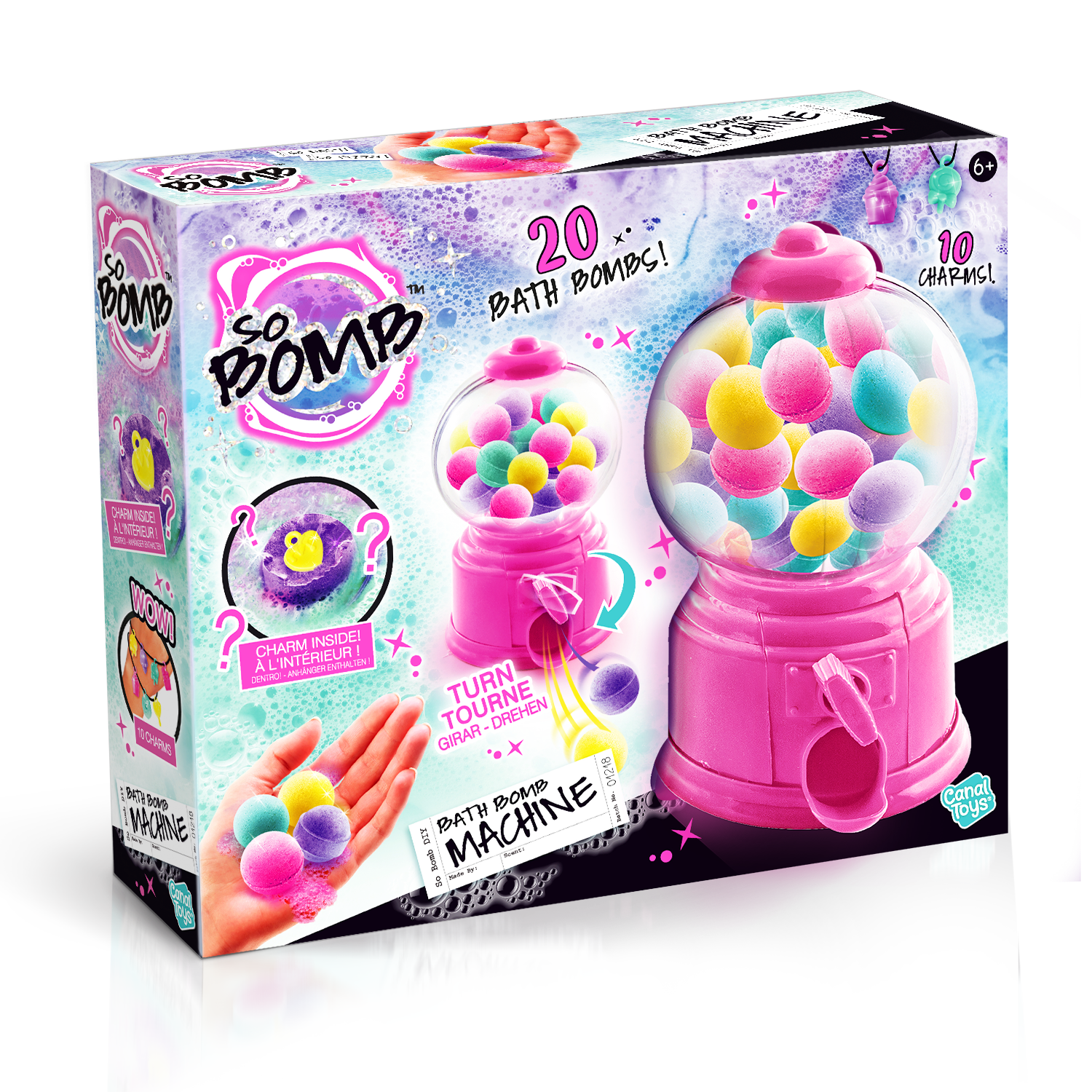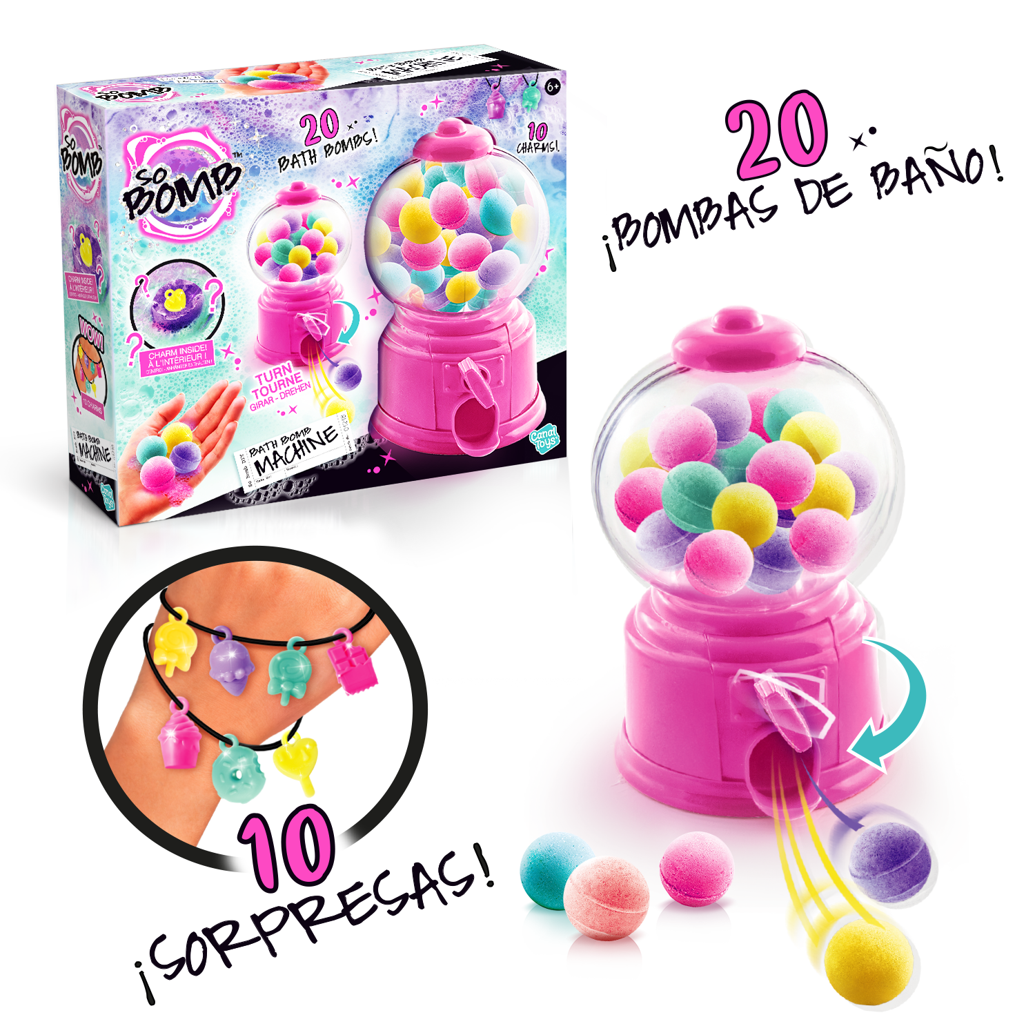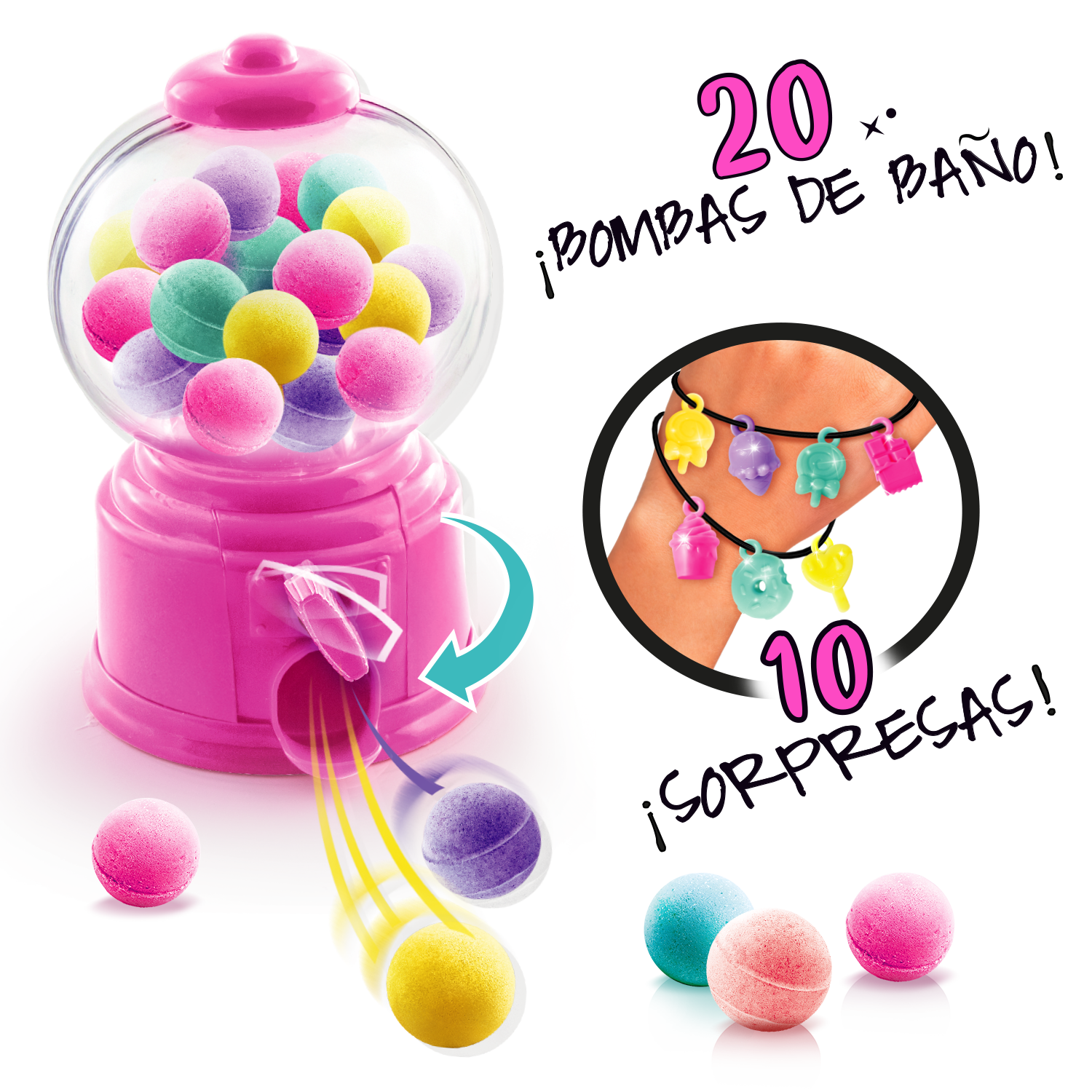 - 1 Dispensador - 20 Mini bombas de baño - 10 encantos sorpresa