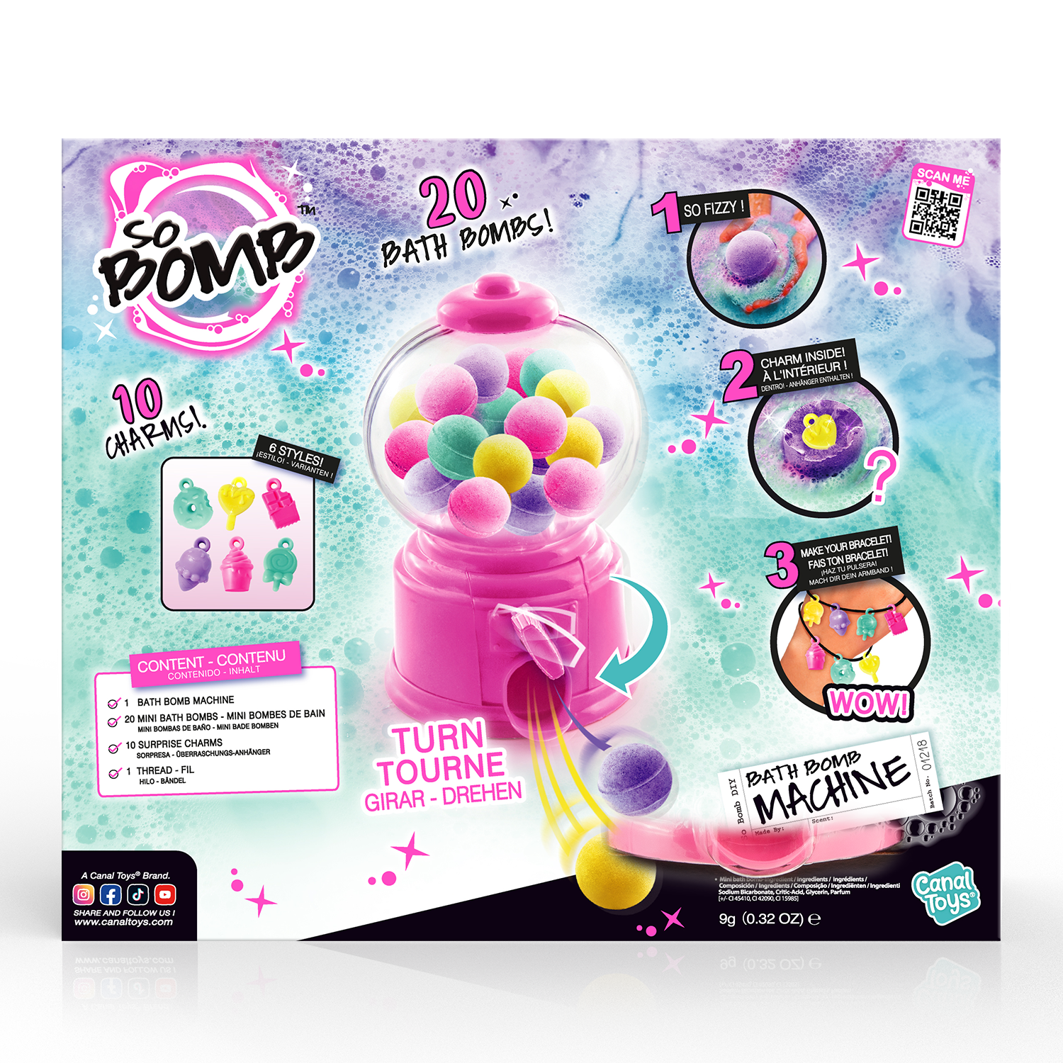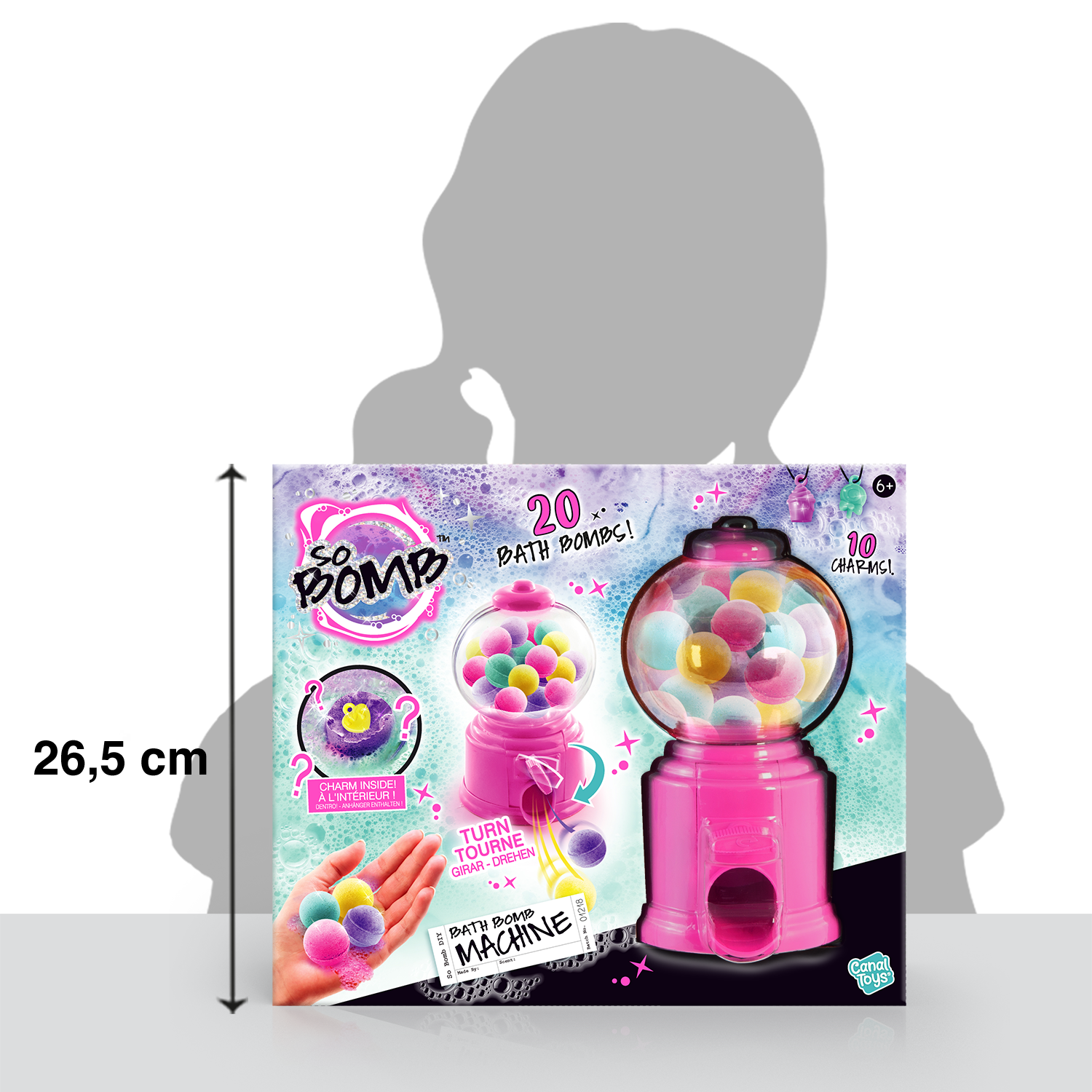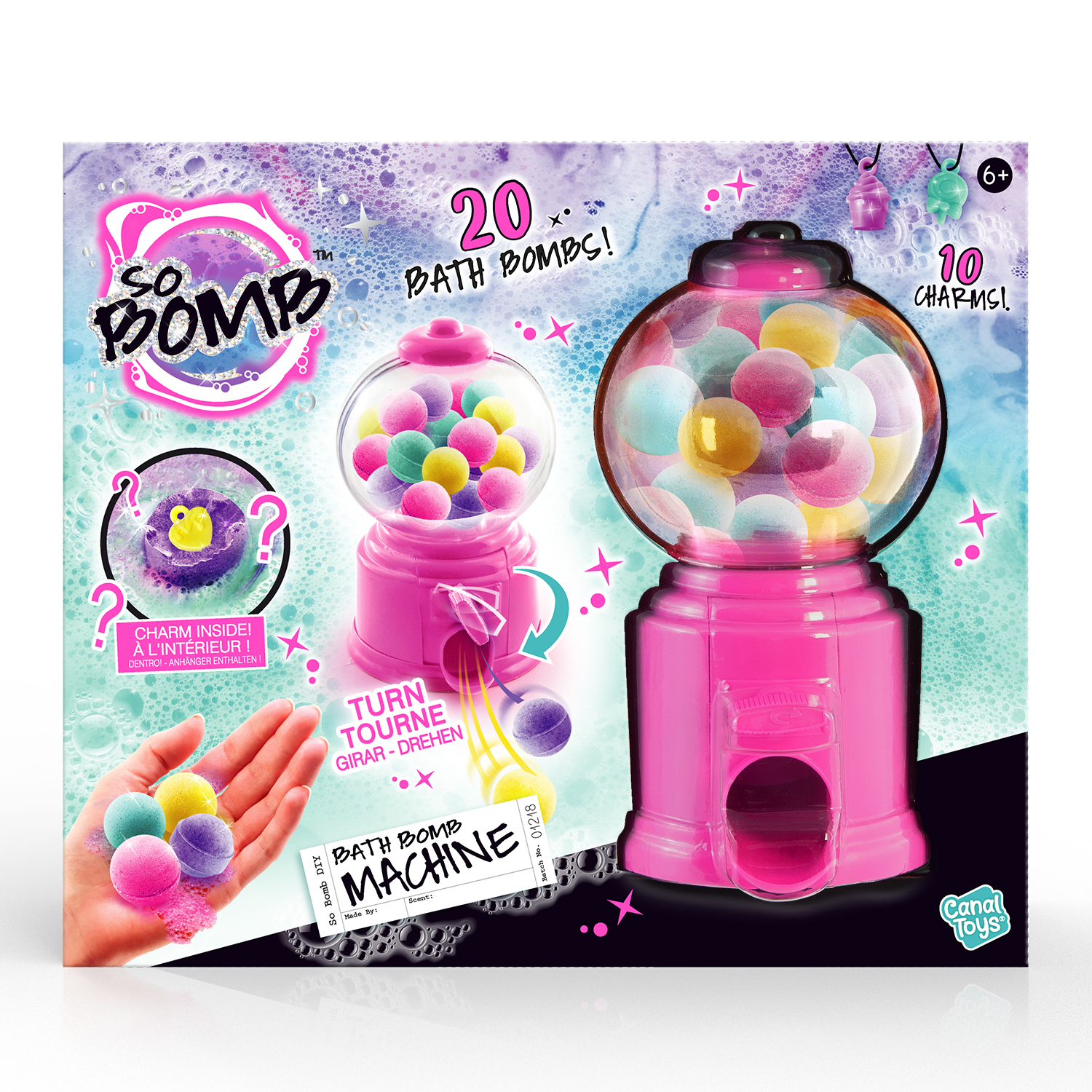 - 1 Dispensador - 20 Mini bombas de baño - 10 encantos sorpresa