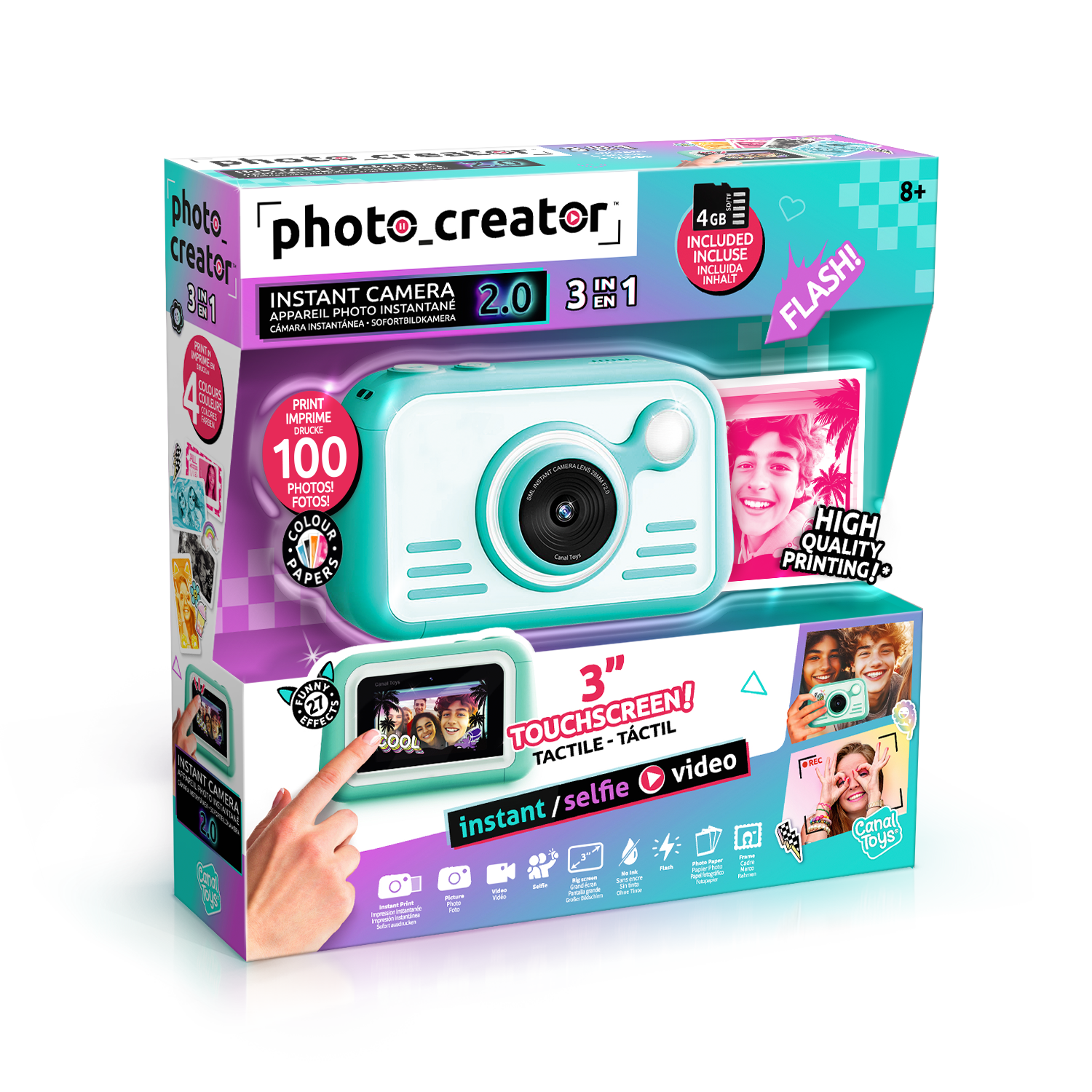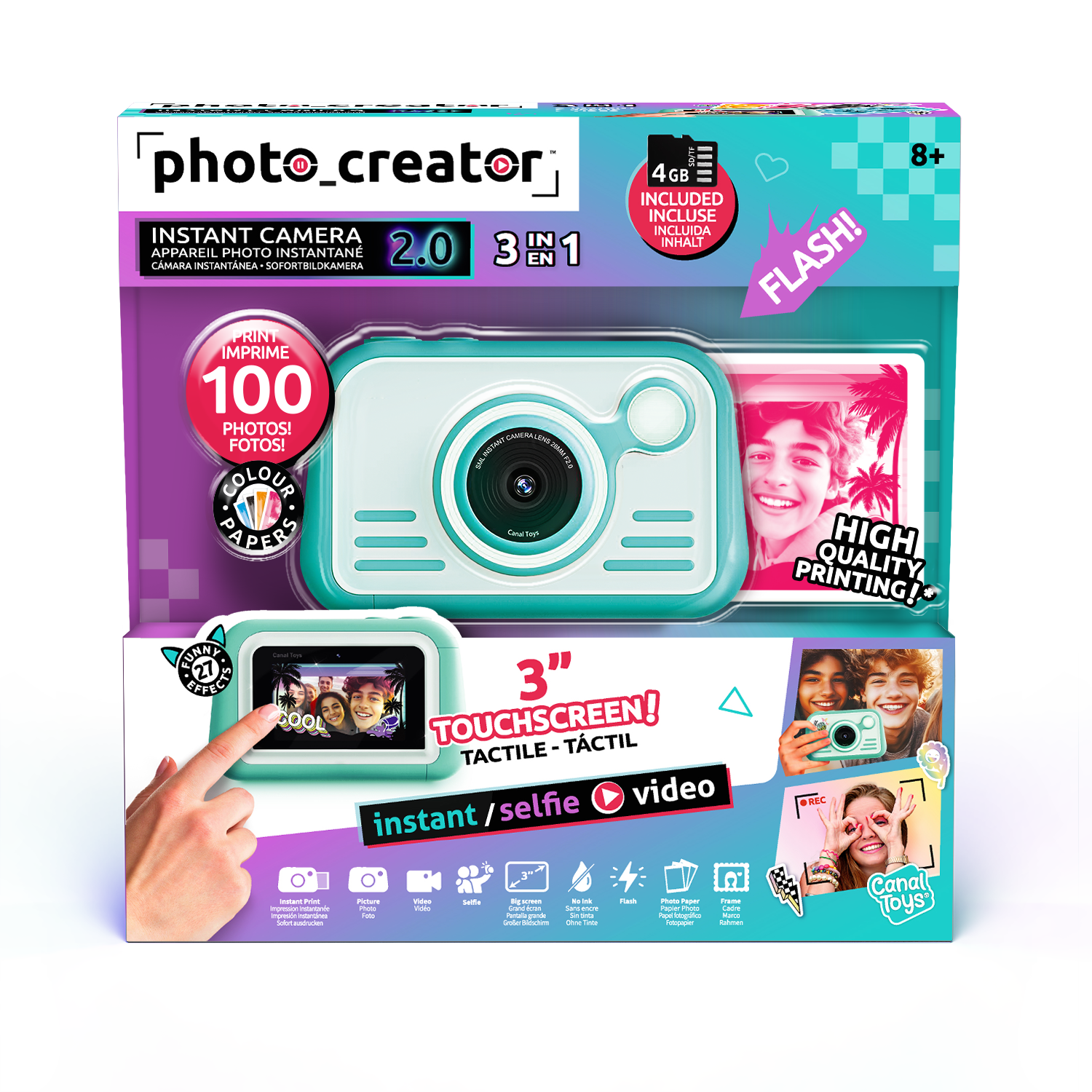 La innovadora y moderna cámara de impresión instantánea 2.0 está llena de creatividad y color. Con sus modos y controles fáciles de usar, es muy fácil tomar la foto perfectamente posicionada ya sea con la lente frontal o selfie. La exposición automática elimina la necesidad de perder el tiempo con la configuración, y una vez que hayas tomado, puedes ver tus fotos en una pantalla táctil HD de 3 pulgadas. Tu impresión de papel brillante de alta calidad se saldrá en pocos segundos y puedes elegir entre 4 colores. El flash y el anillo de luz LED son una característica genial. Personaliza tus fotos con pegatinas y marcadores. Imprime más de 100 fotos. Tarjeta Micro SD de 4 GB incluida.