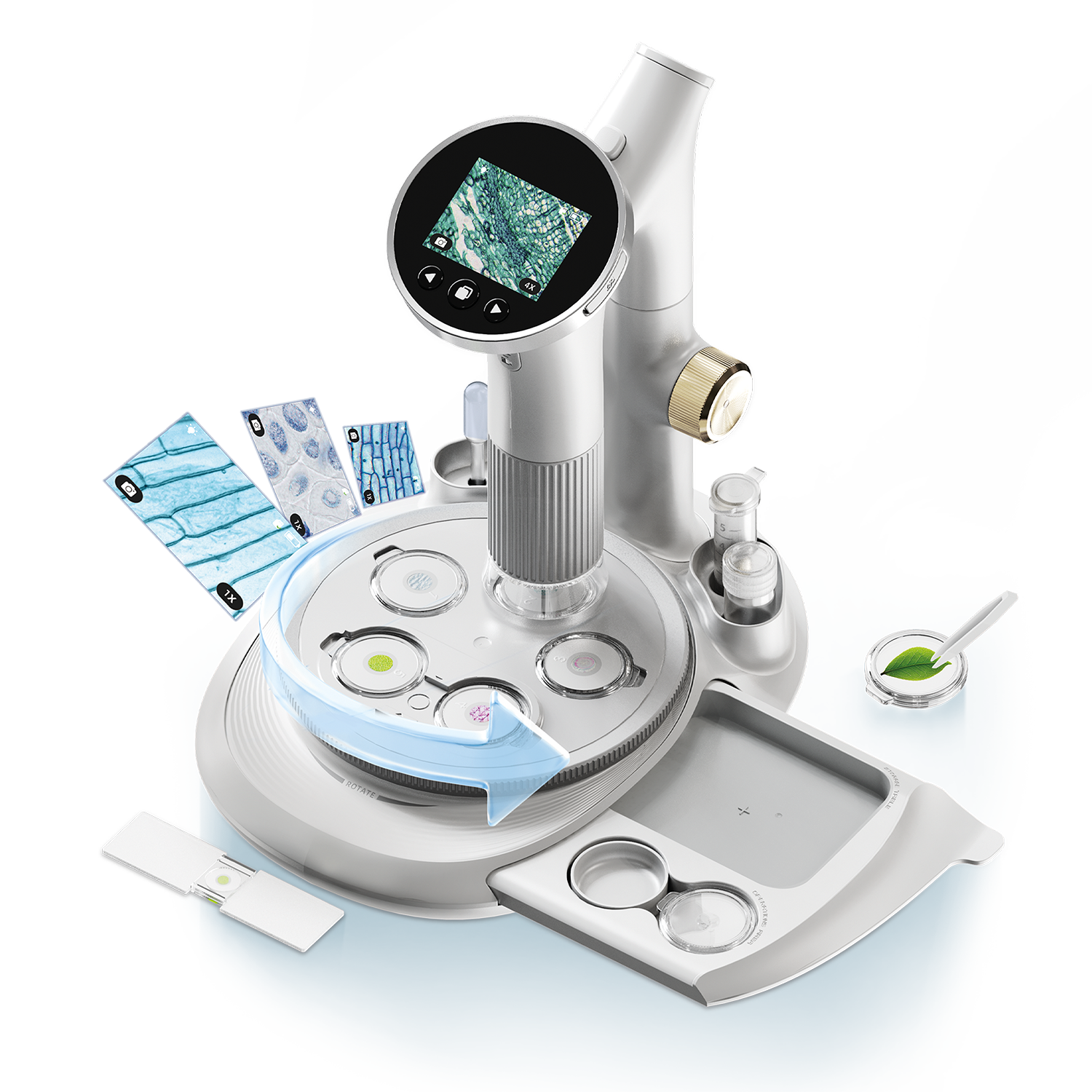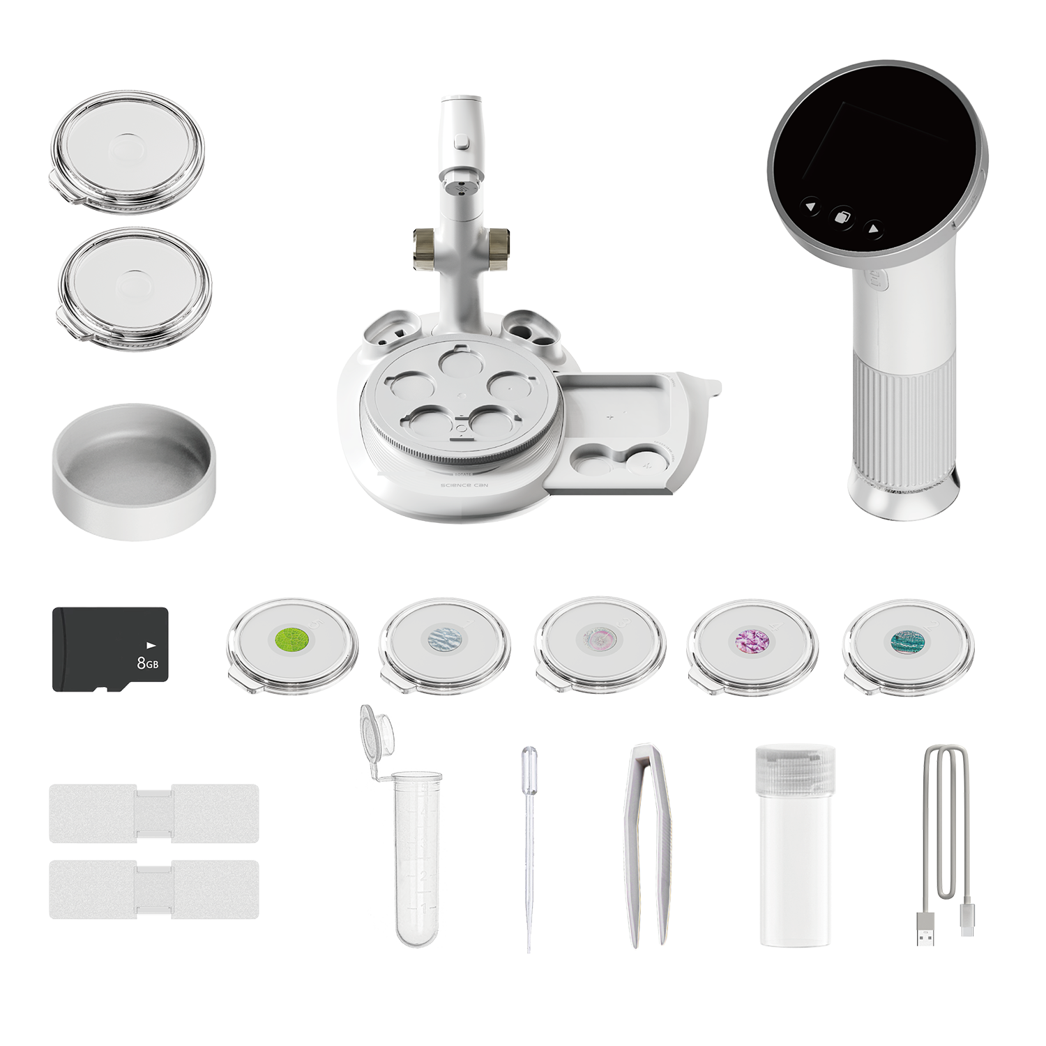 - 5 portaobjetos redondos con muestra - 2 portaobjetos vacíos - 2 portaobjetos rectangulares redondos vacíos - 1 tubo de ensayo - 1 pinza - 1 frasco de muestra - 1 pipeta - 1 placa de Petri - 1 tarjeta SD - 1 cable USB-C - 1 microscopio con pantalla - 1 base de laboratorio con platina de proyecto