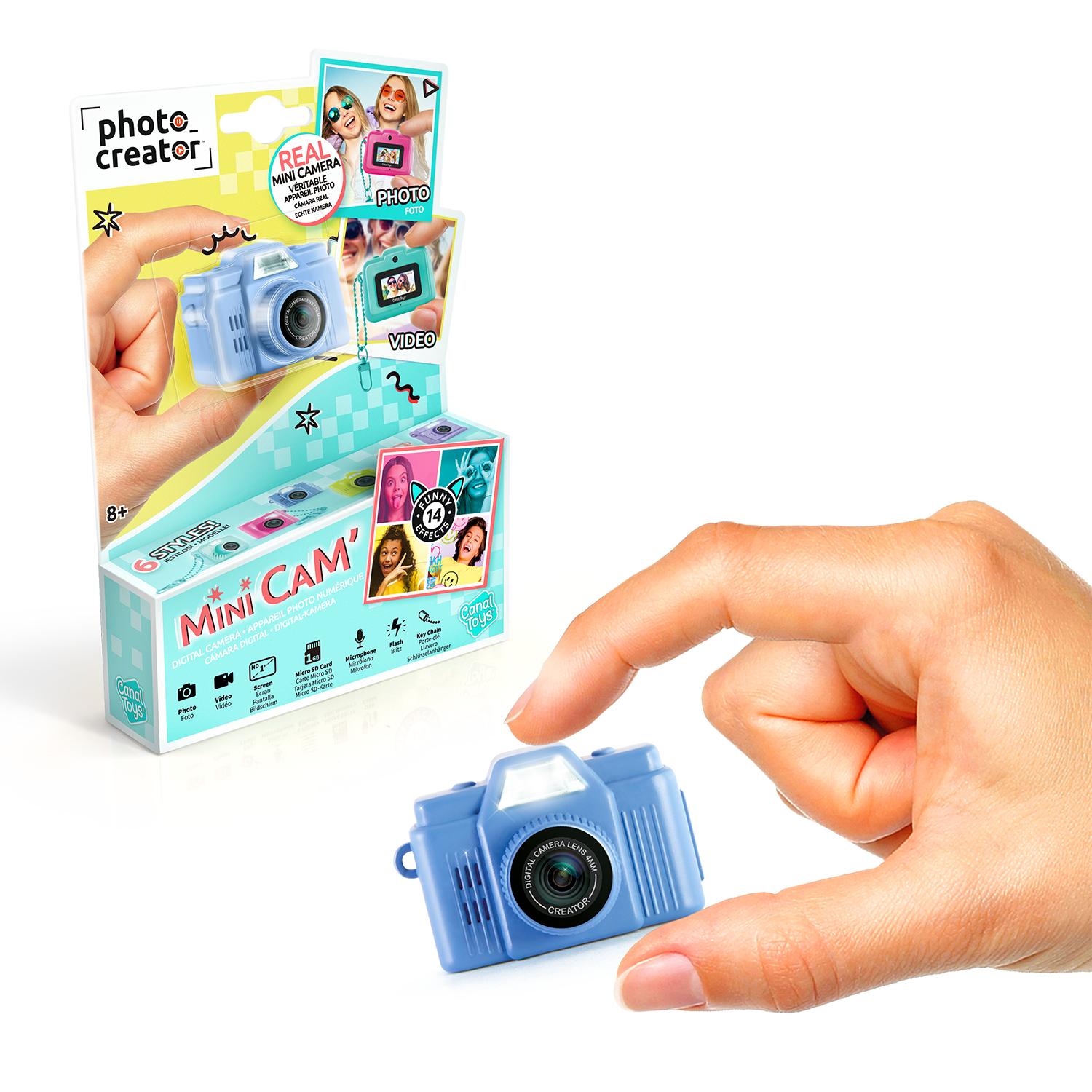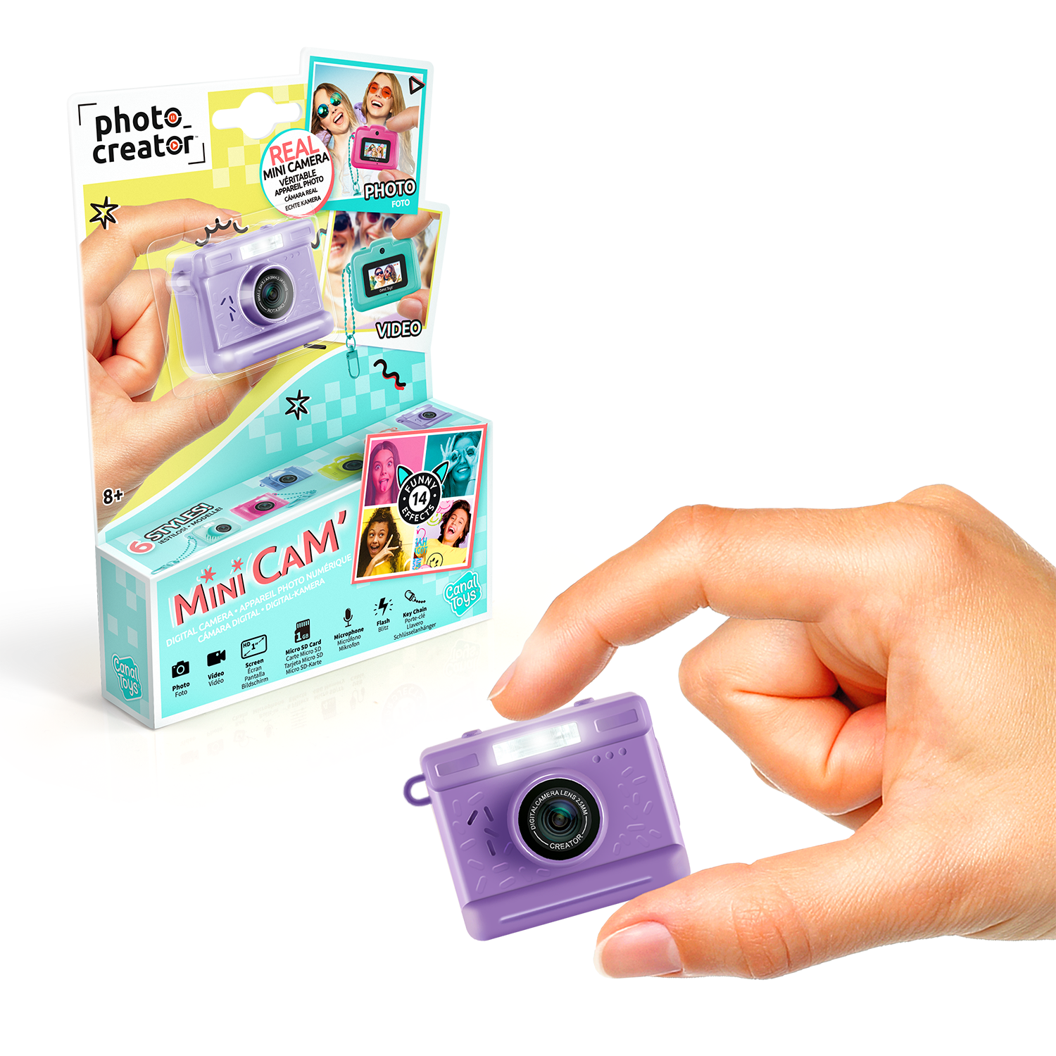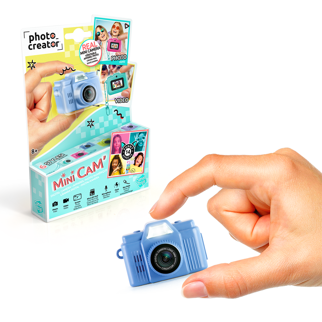 Disfruta de horas de diversión y creatividad con los 6 modernos modelos de Mini' Cam para elegir. Perfecta para capturar momentos cotidianos, esta minicámara digital te permite personalizar tus fotos y vídeos con 6 divertidos marcos y 8 coloridos filtros. Ultra compacta y ligera, cabe fácilmente en un bolsillo o se engancha al bolso gracias a su llavero incorporado. Con la tarjeta micro-SD de 1 GB incluida, podrás tener todas tus fotos y vídeos a mano y transferirlos fácilmente a tu ordenador, tableta u otro dispositivo mediante el cable USB-C. Desarrollada en Francia, esta cámara está diseñada para niños a partir de 8 años, en cumplimiento de las normas europeas de seguridad de los juguetes. La forma de la cámara y la disposición de los botones están diseñados para un uso intuitivo y un fácil manejo.