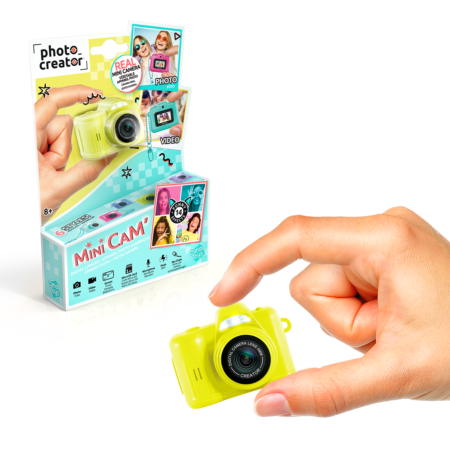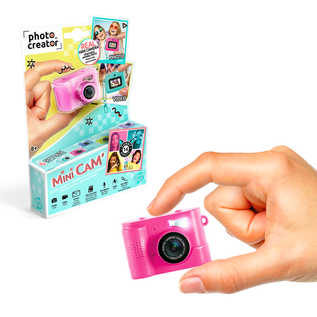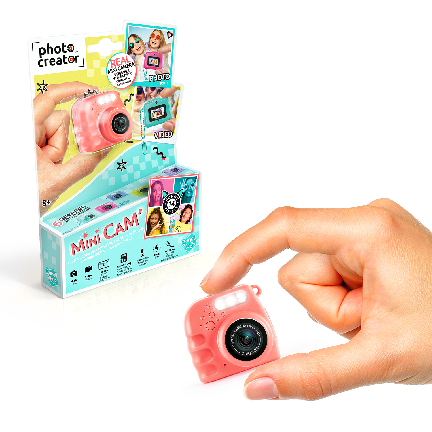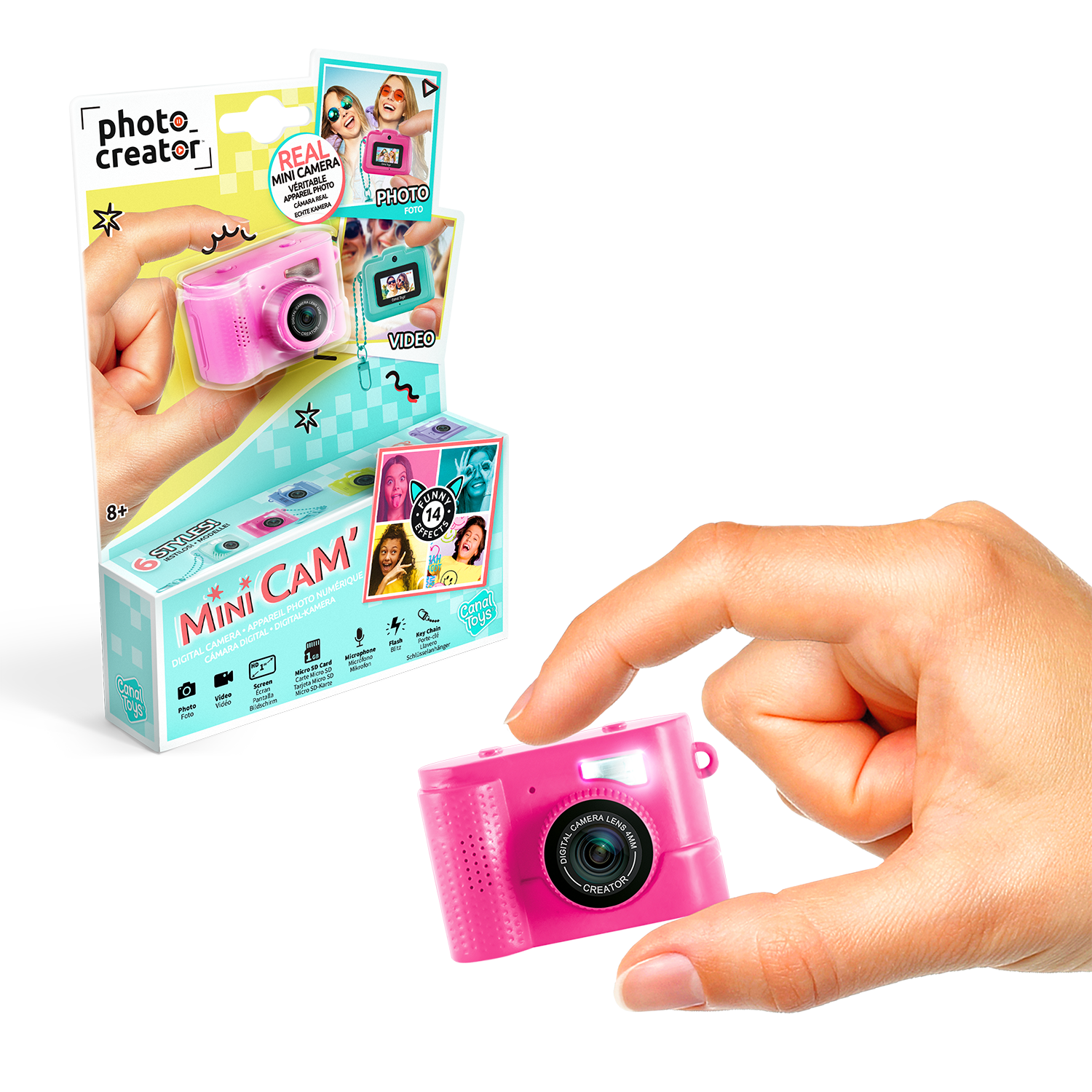 Disfruta de horas de diversión y creatividad con los 6 modernos modelos de Mini' Cam para elegir. Perfecta para capturar momentos cotidianos, esta minicámara digital te permite personalizar tus fotos y vídeos con 6 divertidos marcos y 8 coloridos filtros. Ultra compacta y ligera, cabe fácilmente en un bolsillo o se engancha al bolso gracias a su llavero incorporado. Con la tarjeta micro-SD de 1 GB incluida, podrás tener todas tus fotos y vídeos a mano y transferirlos fácilmente a tu ordenador, tableta u otro dispositivo mediante el cable USB-C. Desarrollada en Francia, esta cámara está diseñada para niños a partir de 8 años, en cumplimiento de las normas europeas de seguridad de los juguetes. La forma de la cámara y la disposición de los botones están diseñados para un uso intuitivo y un fácil manejo.
