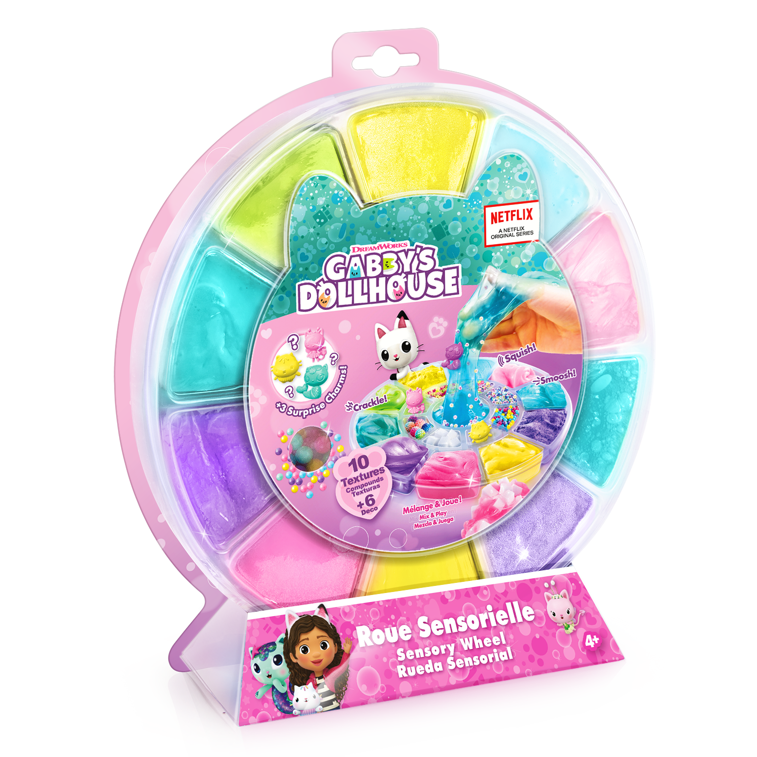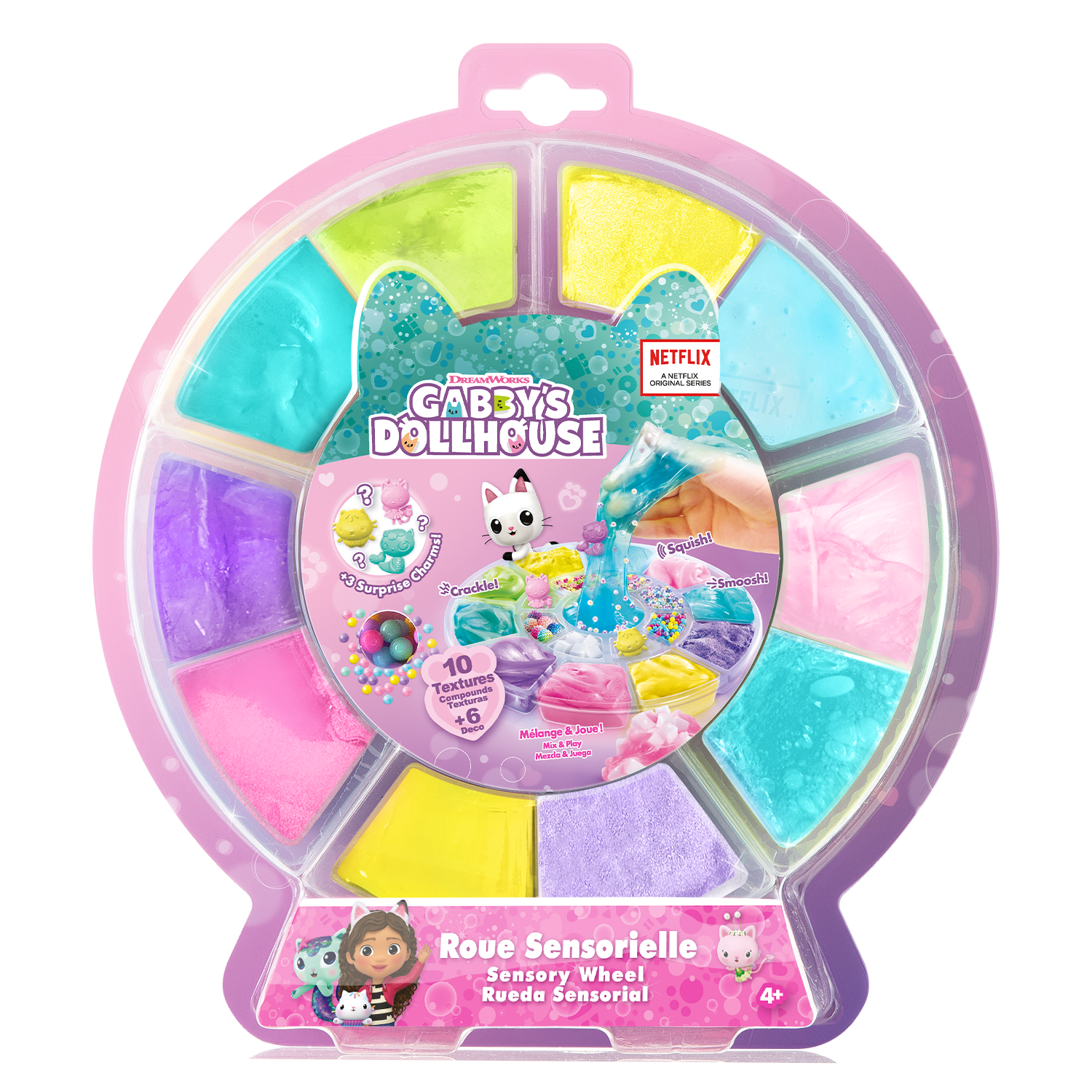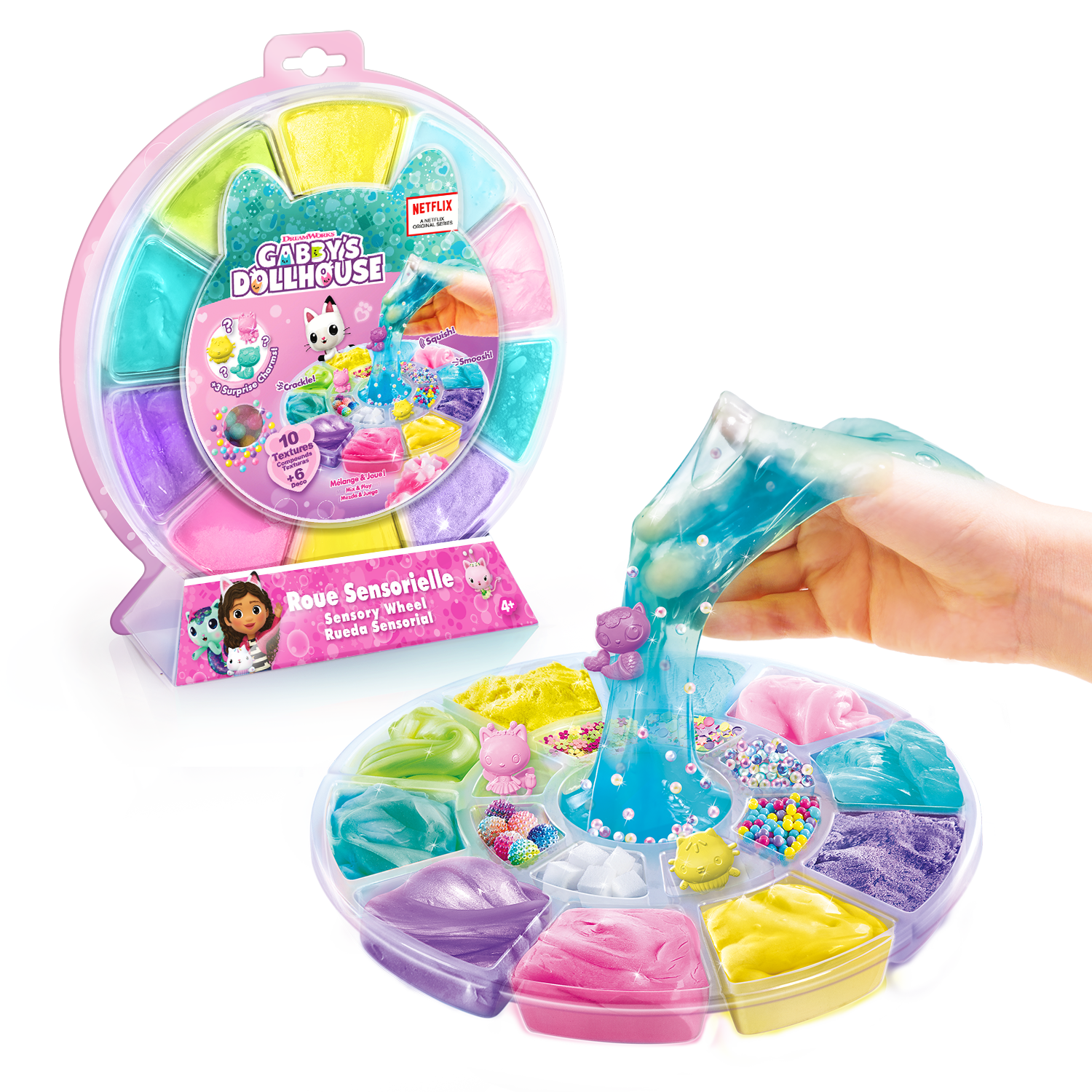 ¡Un kit con diferentes texturas y decoraciones para crear tu propia mezcla ASMR y descubrir nuevas sensaciones satisfactorias! El ASMR es una estimulación sensorial a la que dan vida sonidos suaves y repetitivos. Tienen un verdadero efecto relajante y calmante. Los personajes de La casa de muñecas de Gabby están escondidos en su rueda. ¡Ábrela y descubre qué encantos te esperan! Todos nuestros productos cumplen la normativa europea sobre juguetes.