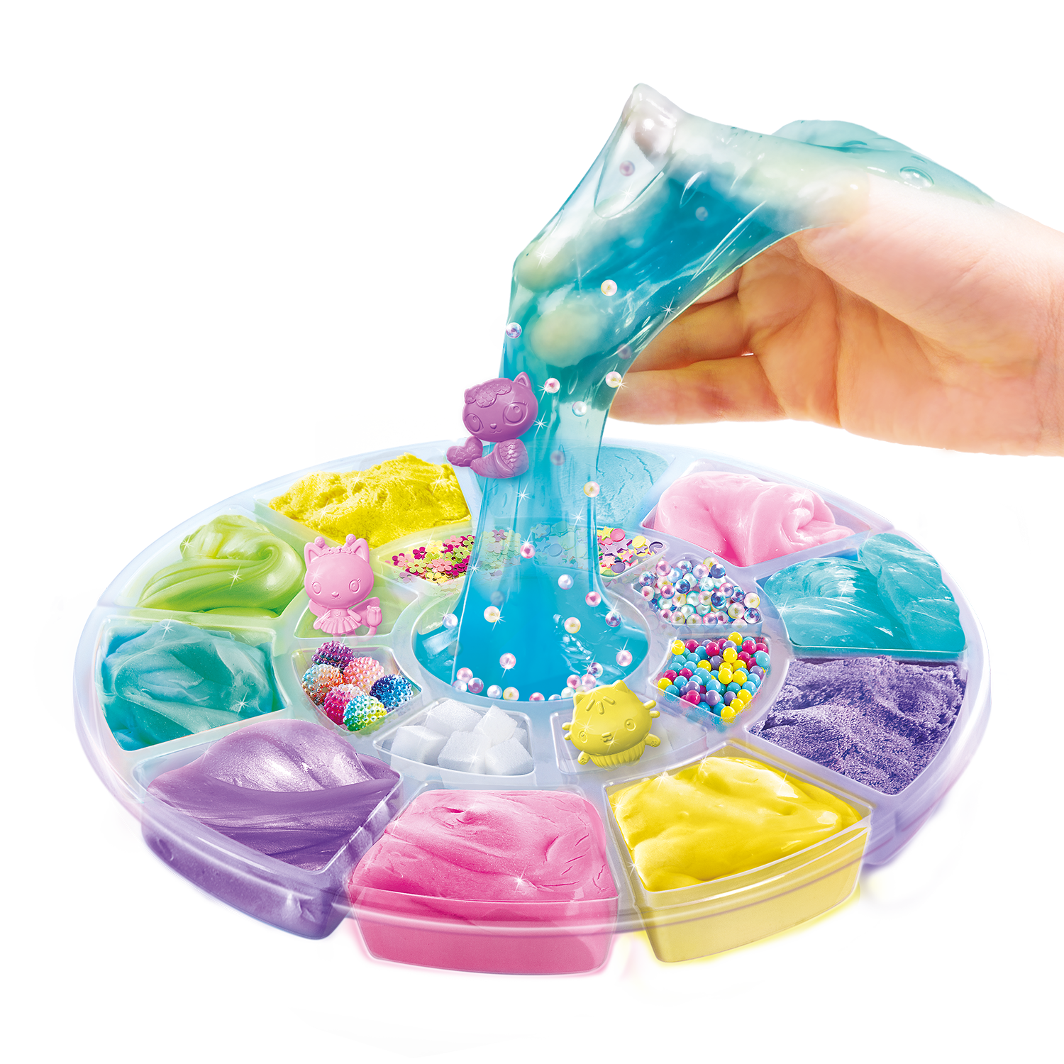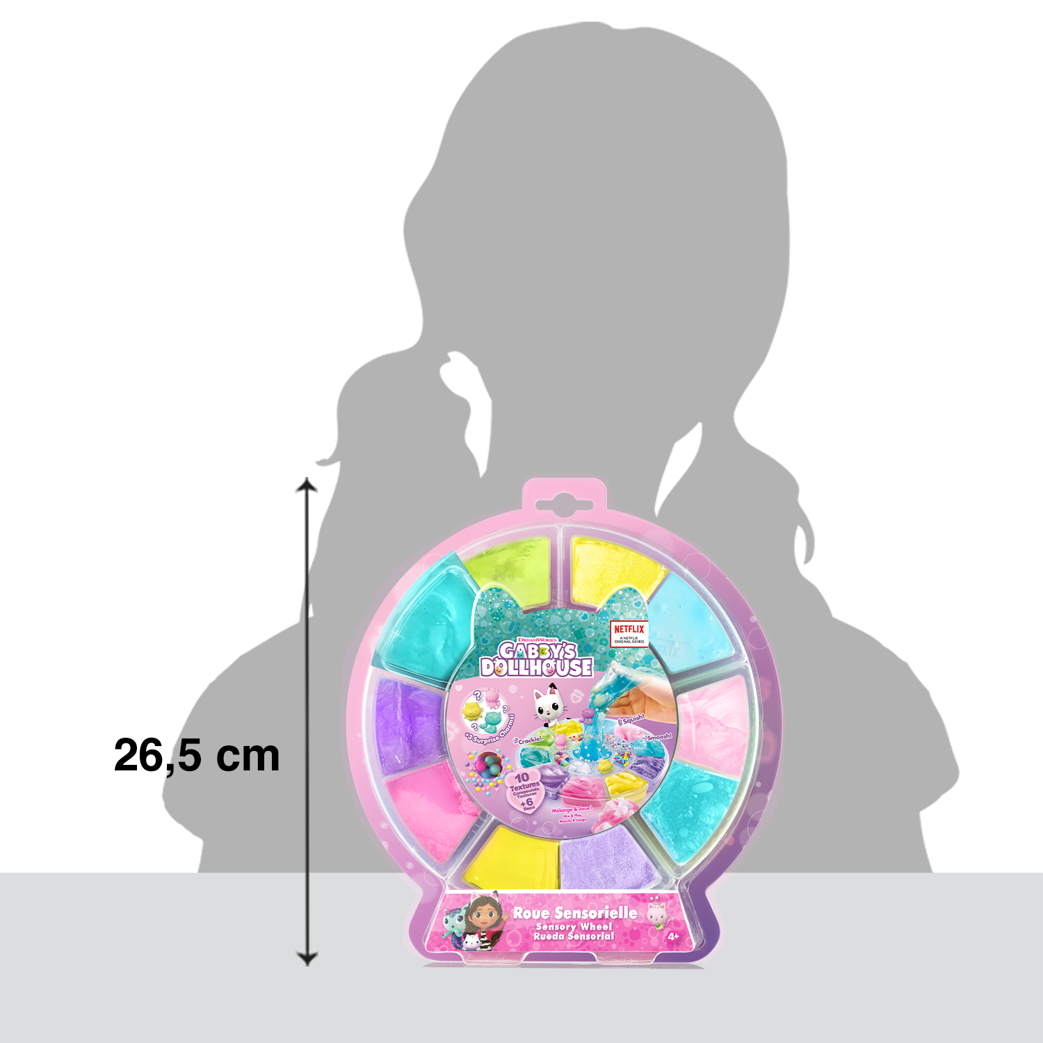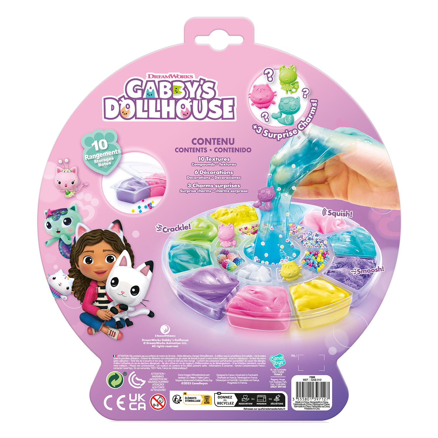 ¡Un kit con diferentes texturas y decoraciones para crear tu propia mezcla ASMR y descubrir nuevas sensaciones satisfactorias! El ASMR es una estimulación sensorial a la que dan vida sonidos suaves y repetitivos. Tienen un verdadero efecto relajante y calmante. Los personajes de La casa de muñecas de Gabby están escondidos en su rueda. ¡Ábrela y descubre qué encantos te esperan! Todos nuestros productos cumplen la normativa europea sobre juguetes.