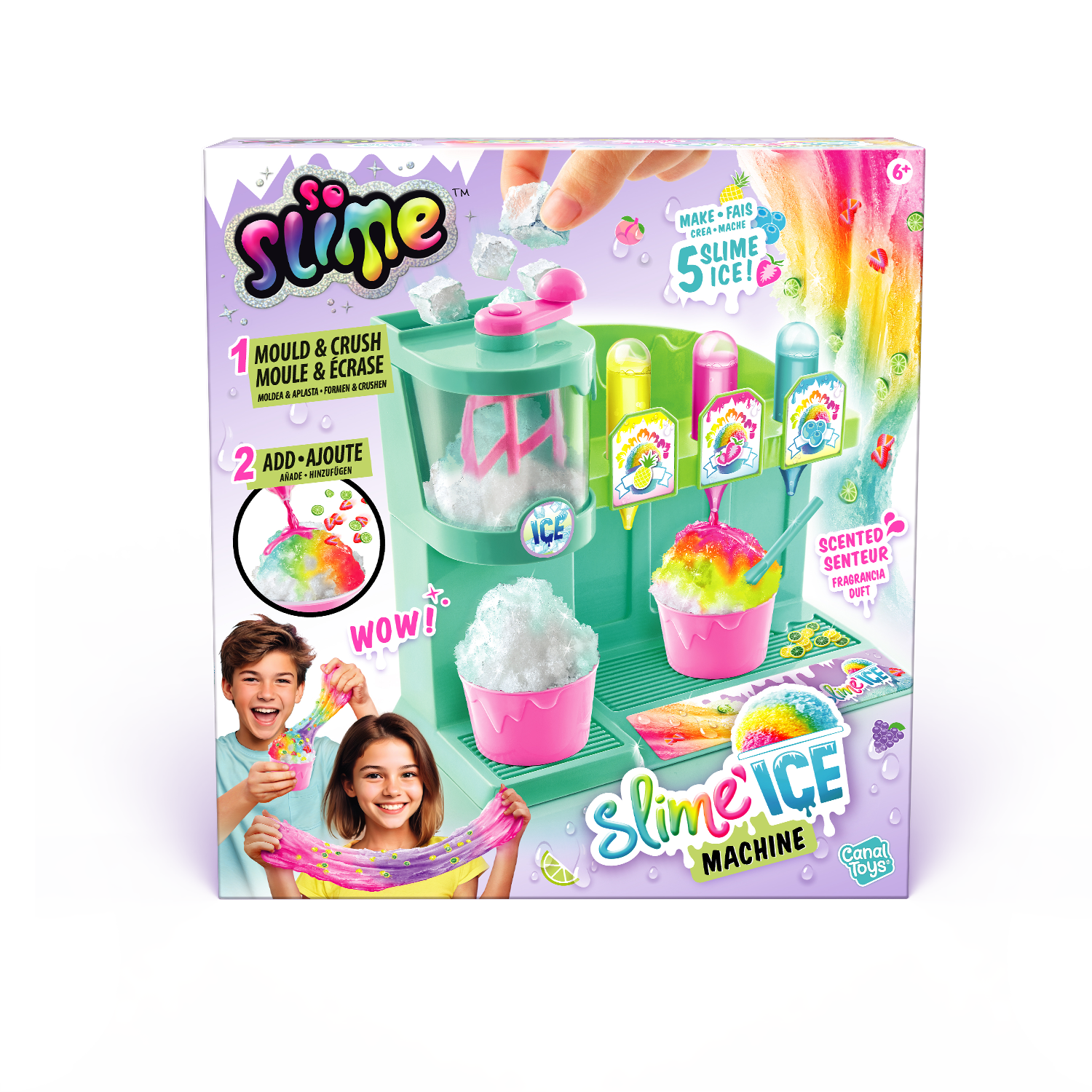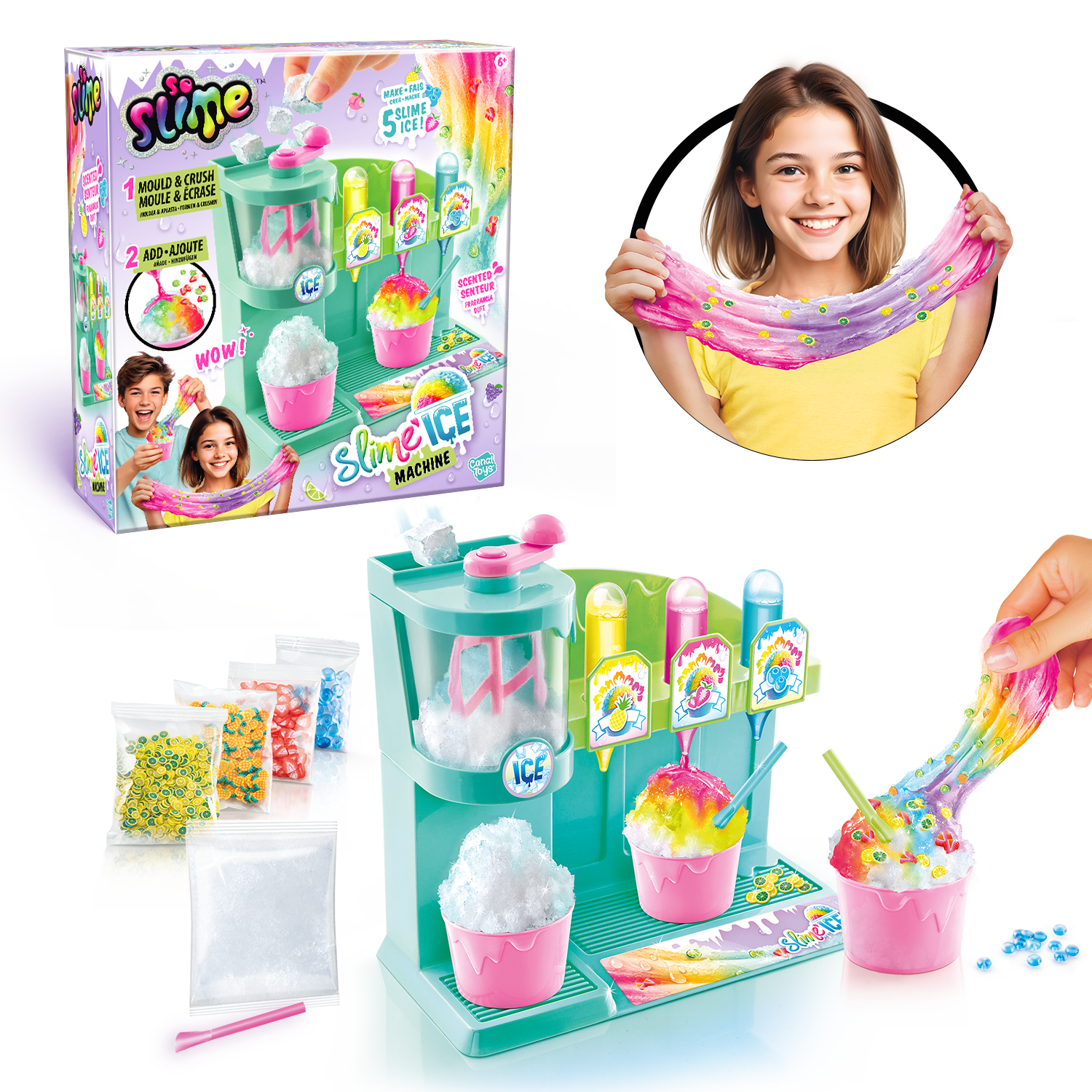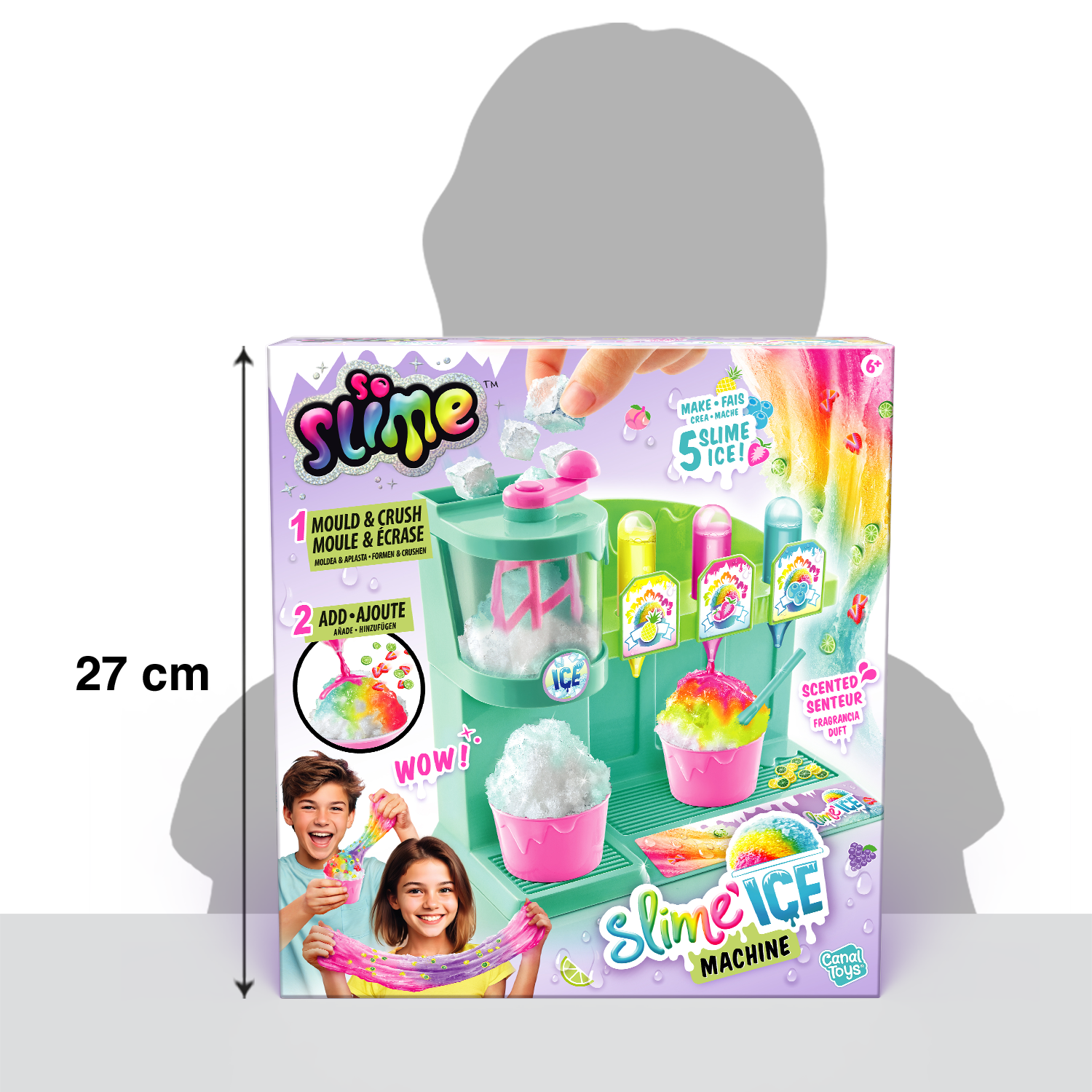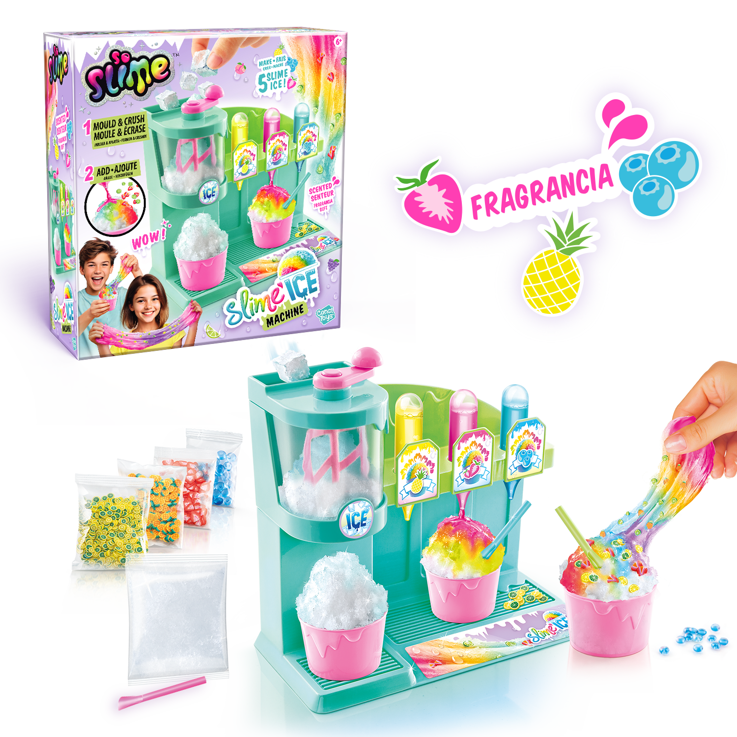 ¡La Máquina de Hielo Slime te permite crear helados slime únicos y divertidos! Para hacer los cubitos de hielo, coge un poco del material entre los dedos y presiona ligeramente por los 4 lados para formar un cubito. Cuando hayas hecho unos cuantos cubitos, colócalos dentro de la batidora. Para triturar el hielo, gira el mango. Pon tu Slime'Ice en una tarrina de helado. A continuación, puedes añadir colorantes aromatizados para obtener colores brillantes y decorar tus creaciones con los adornos y las pajitas suministradas .