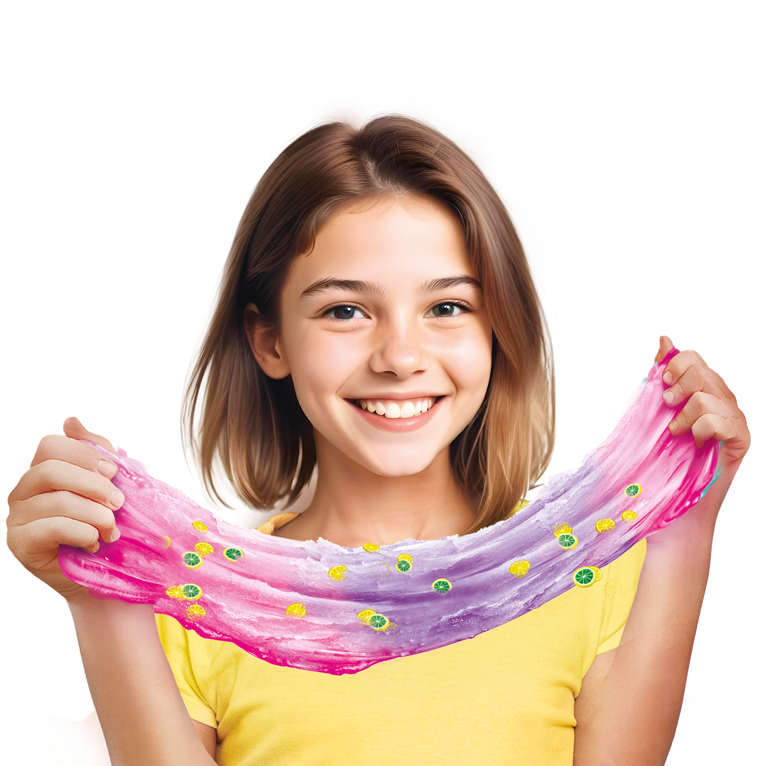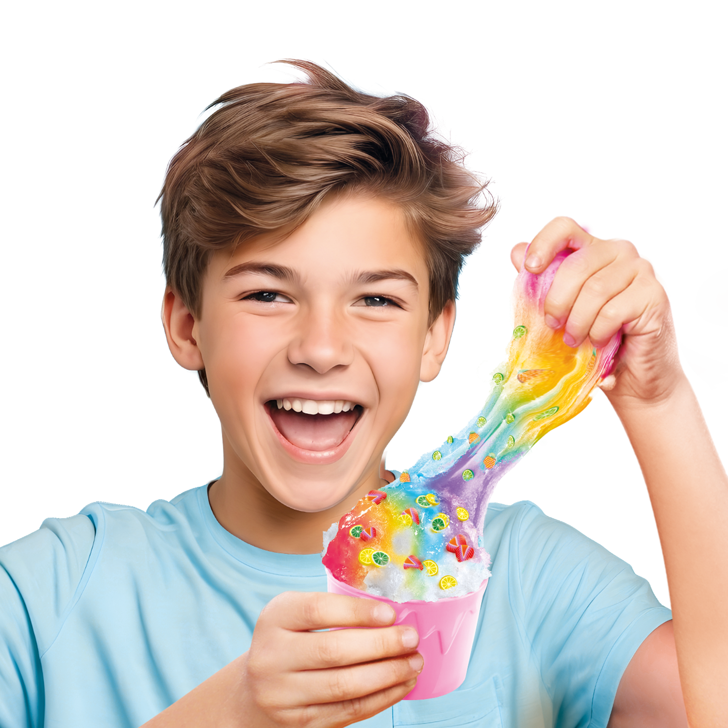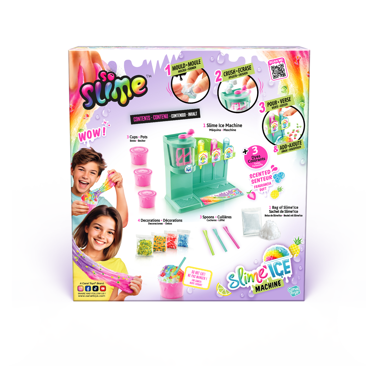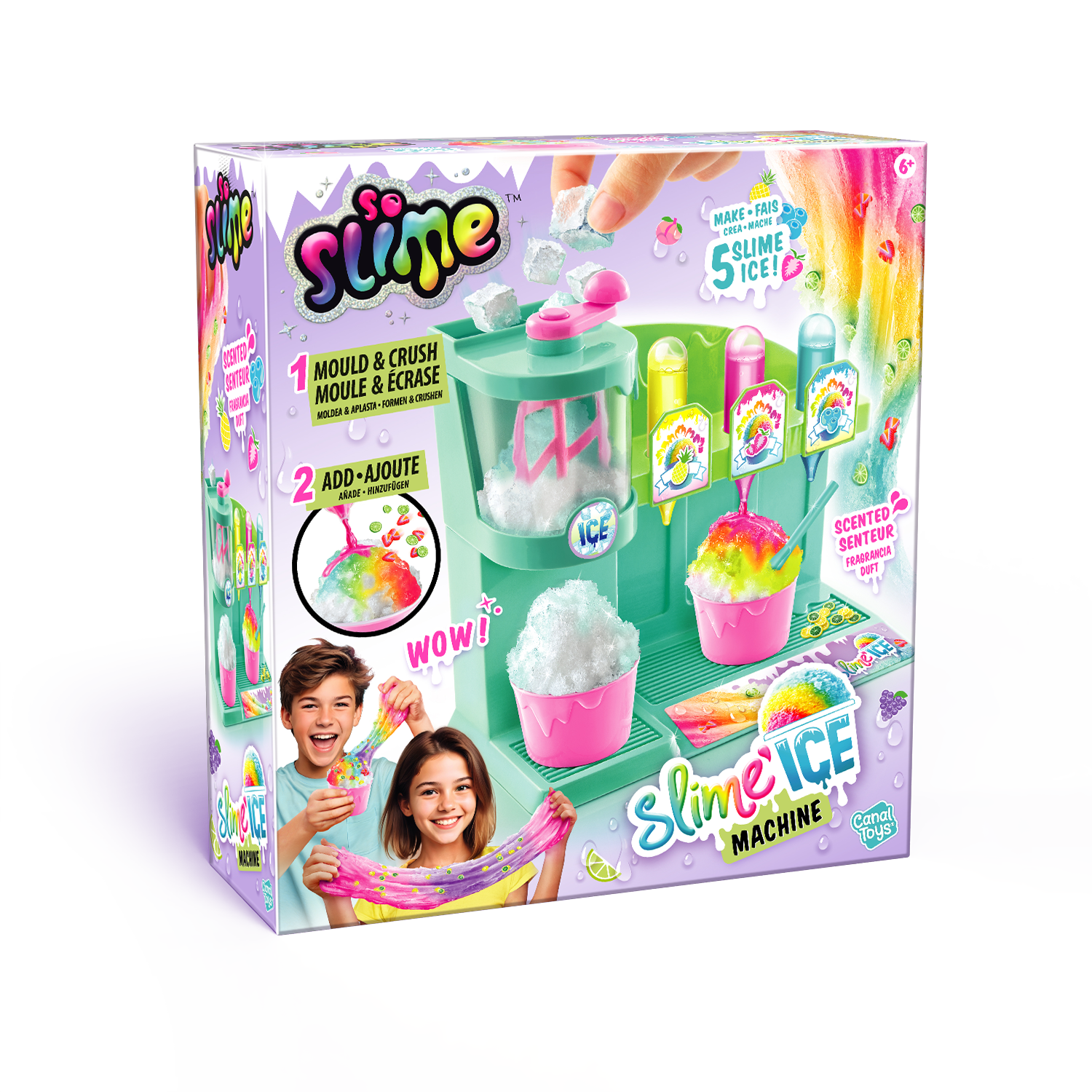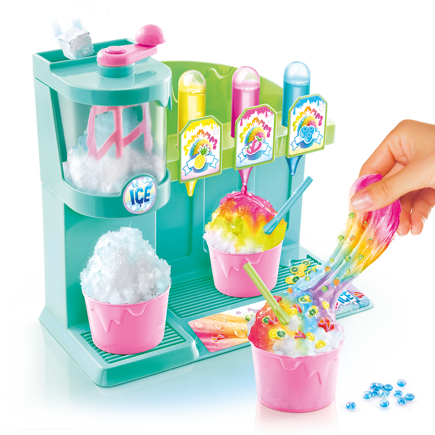 ¡La Máquina de Hielo Slime te permite crear helados slime únicos y divertidos! Para hacer los cubitos de hielo, coge un poco del material entre los dedos y presiona ligeramente por los 4 lados para formar un cubito. Cuando hayas hecho unos cuantos cubitos, colócalos dentro de la batidora. Para triturar el hielo, gira el mango. Pon tu Slime'Ice en una tarrina de helado. A continuación, puedes añadir colorantes aromatizados para obtener colores brillantes y decorar tus creaciones con los adornos y las pajitas suministradas .