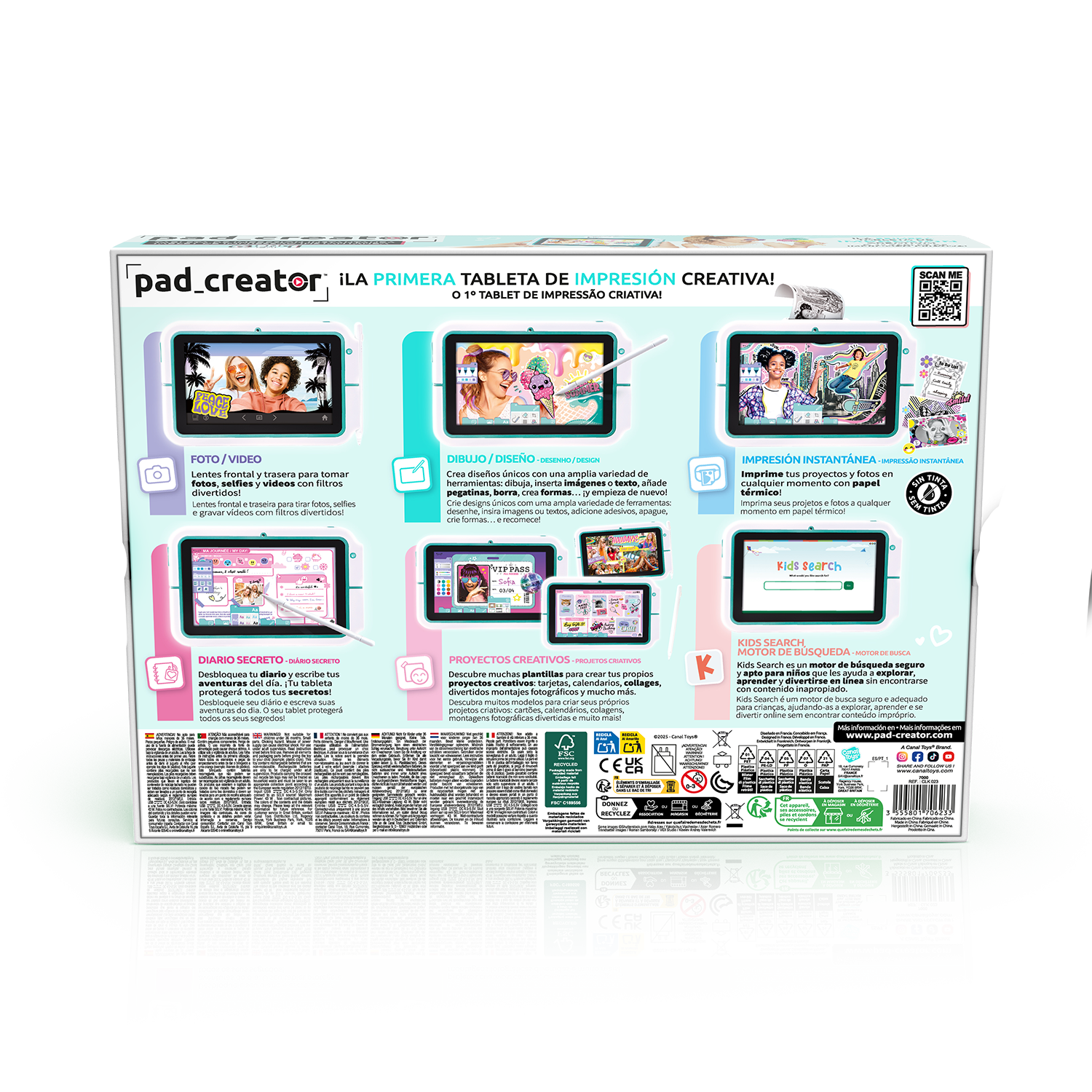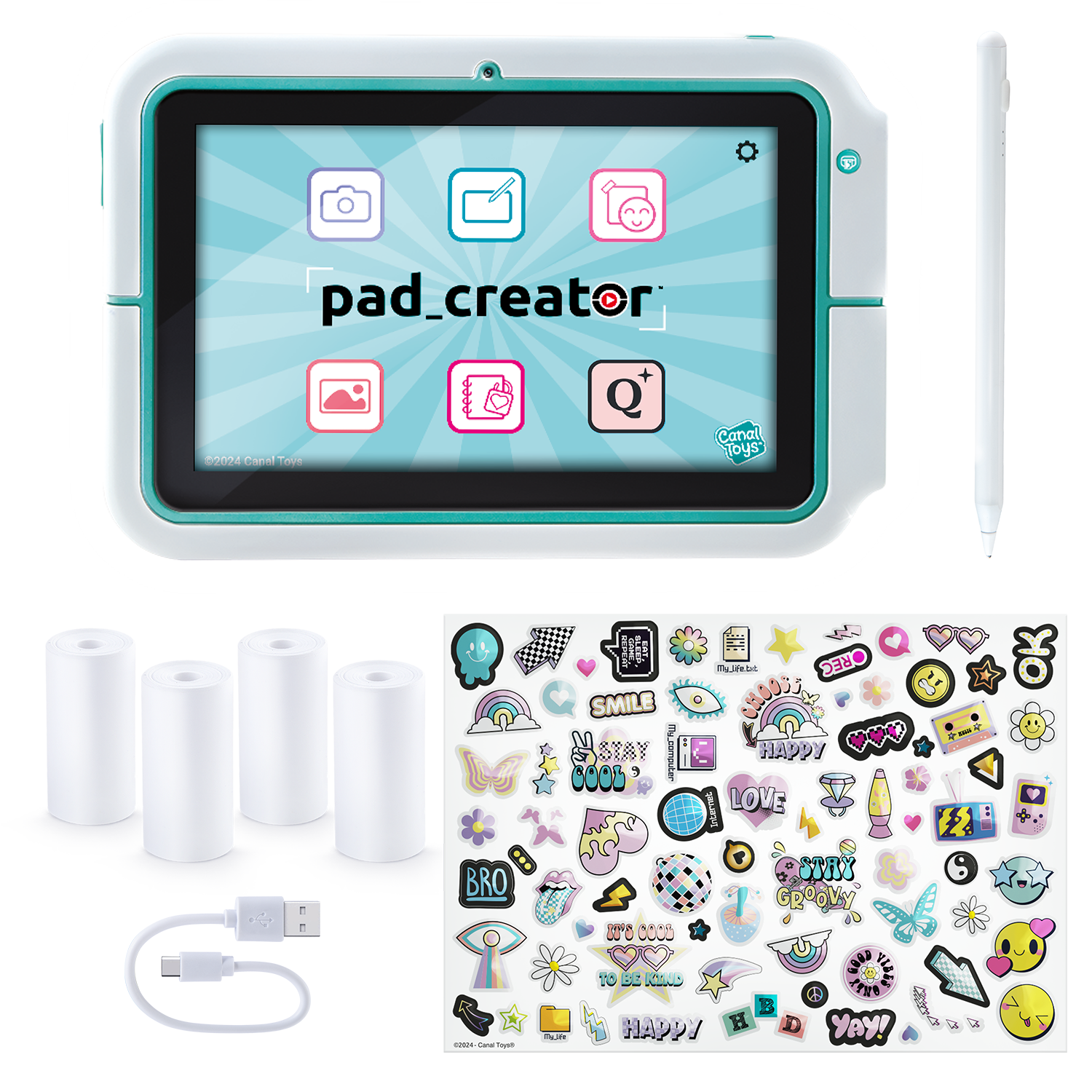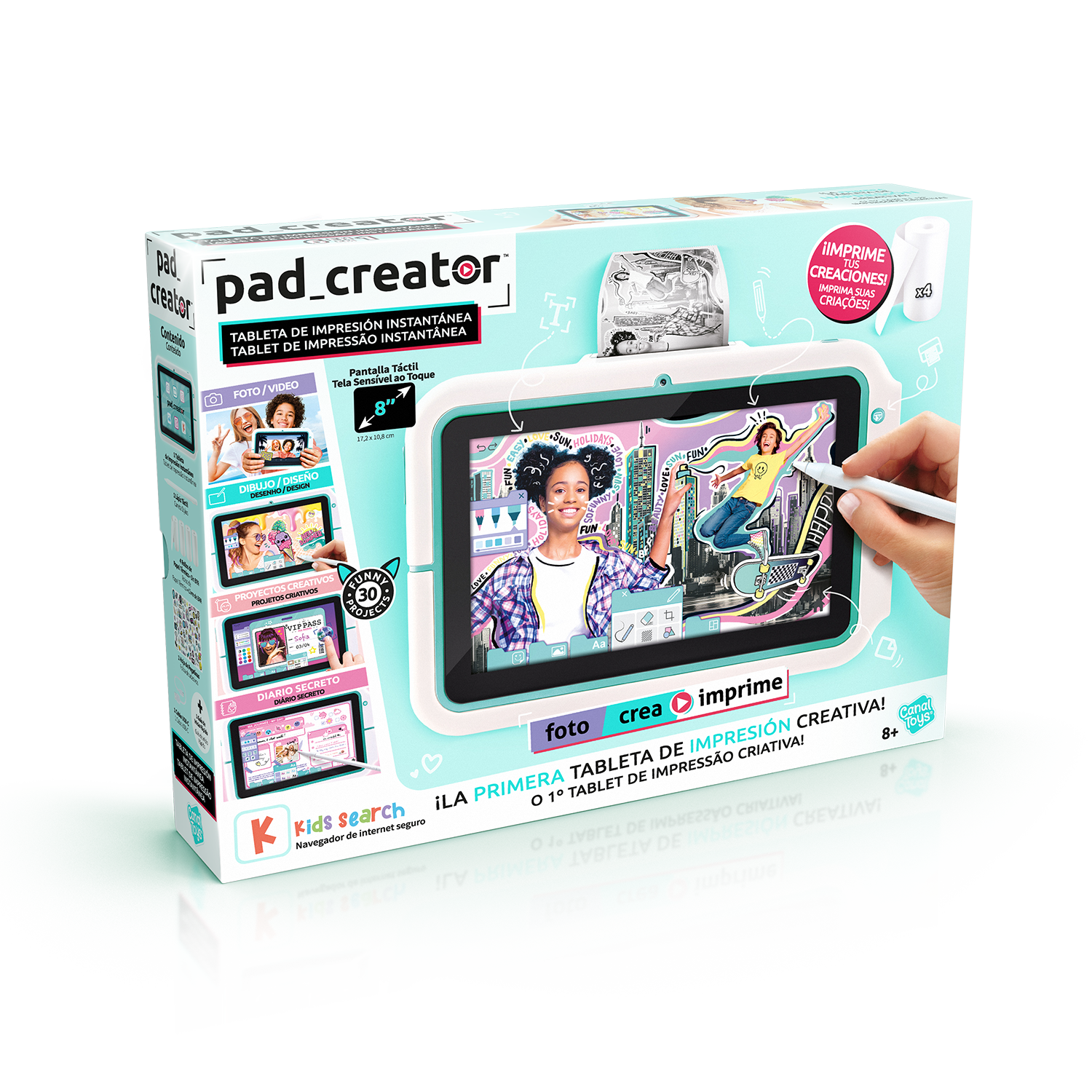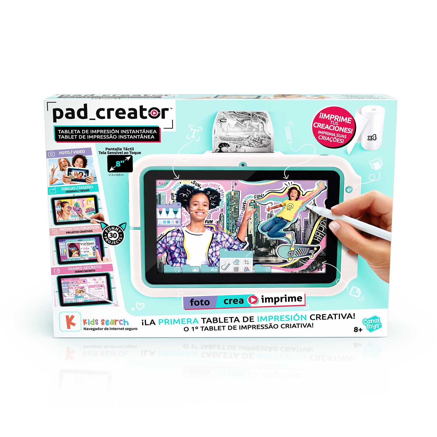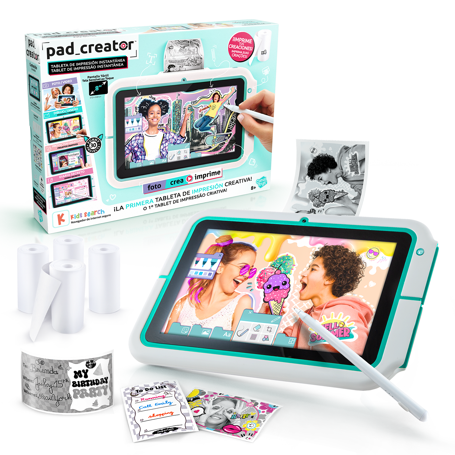 CONTENIDO Y DIMENSIONES: 1 tableta con impresora integrada, 1 lápiz óptico, 1 cable de carga USB-C, 4 rollos de papel térmico, 1 hoja de pegatinas y 1 manual de instrucciones. Este kit te permite imprimir más de 250 creaciones. Tamaño de la caja: L34 x W6 x H25,4 cm / Tamaño de la tableta: L23,5 x A4,3 x A15,8 cm. Producto desarrollado en Francia. Recomendado para niños y niñas a partir de 8 años.