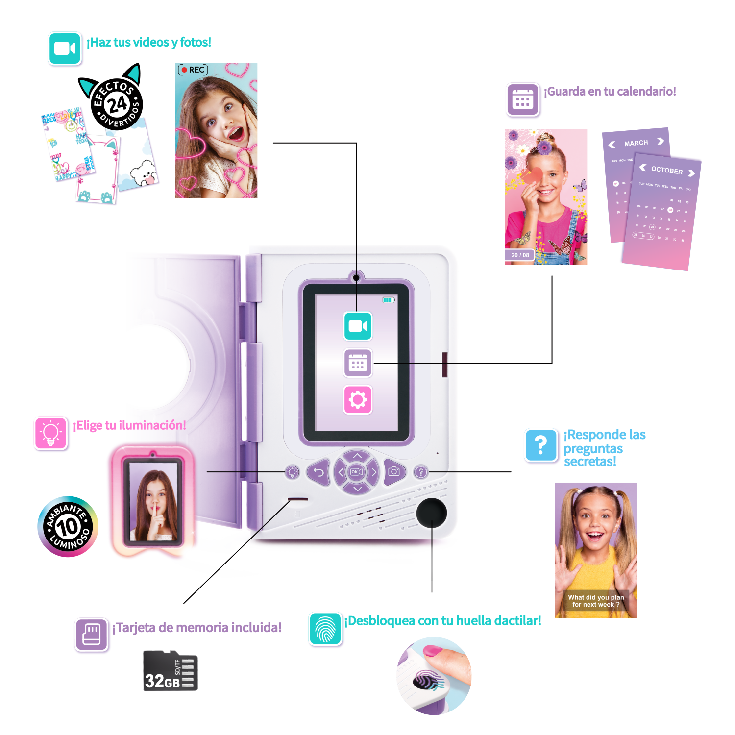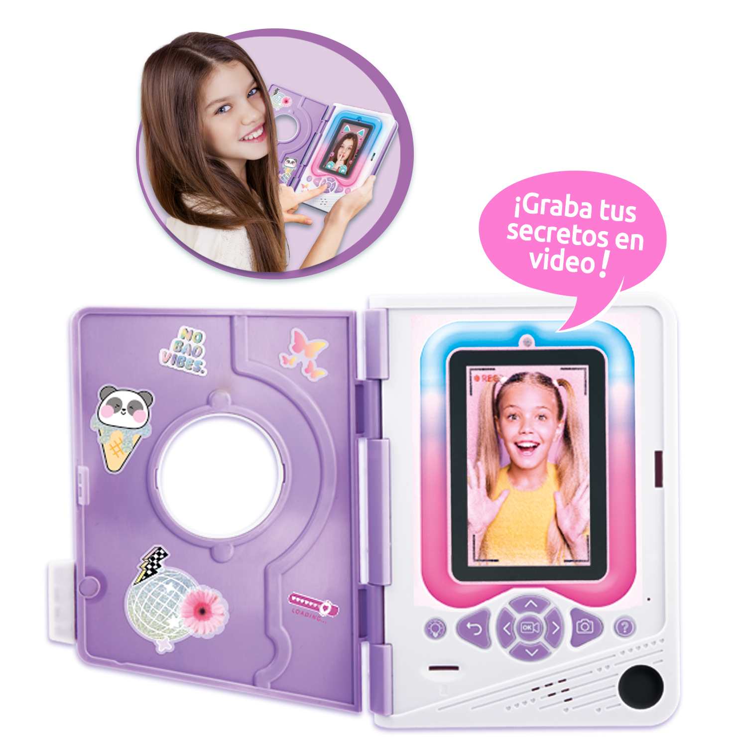 EL PRIMER VIDEO DIARIO SECRETO : ¡Graba tus secretos, momentos cotidianos y recuerdos favoritos en vídeo o foto con tu propio video diario secreto! Añade filtros divertidos para personalizar tus vídeos y contar tu historia a tu manera. La gran pantalla LCD en color te permite reproducir fácilmente todos los vídeos y fotos grabados, que podrás encontrar organizados en el calendario secreto. Incluye una tarjeta micro-SD de 32 GB para que puedas transferir tus secretos fuera de la agenda.