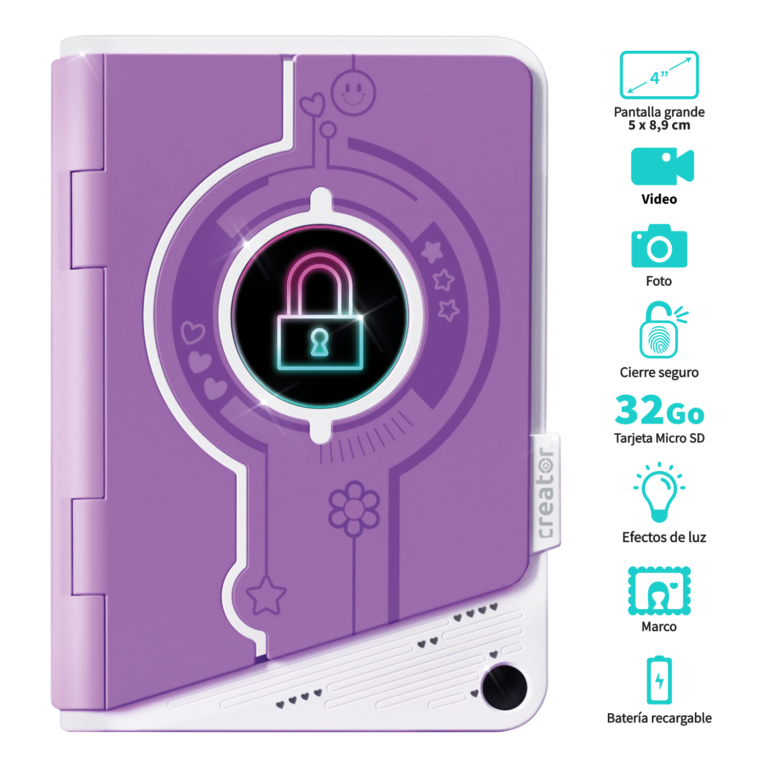 Un diario en vídeo para guardar todos tus secretos. Desbloquea tu diario con tu huella dactilar y graba tus aventuras de cada día en vídeo. Haz grabaciones geniales añadiendo filtros divertidos y bonitos efectos de luz alrededor de la pantalla. Con batería recargable.