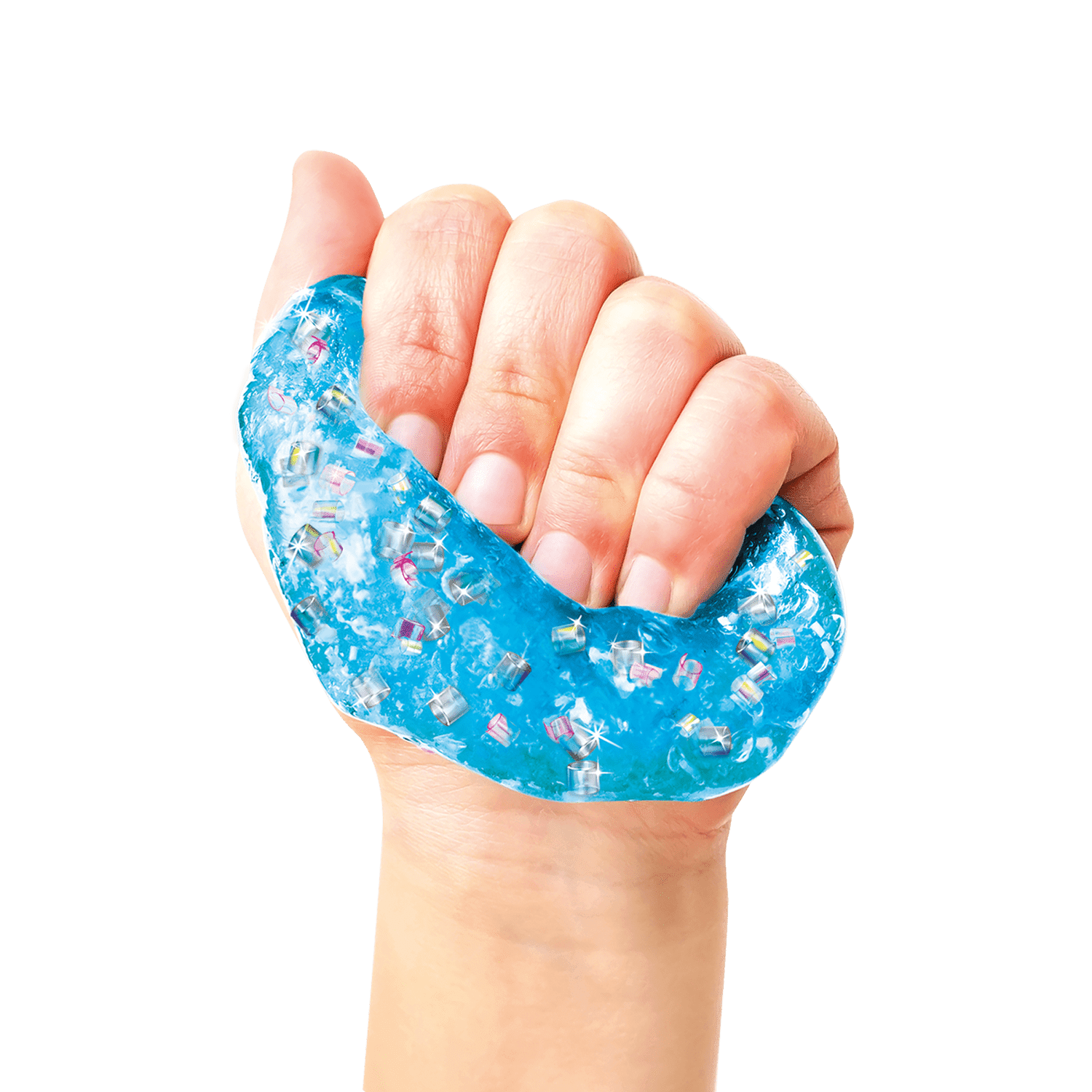 Mezcla en su contenedor el polvo de slime y un poco de agua. ¡Agítalo! Déjalo reposar unos minutos y añade la decoración a tu gusto.