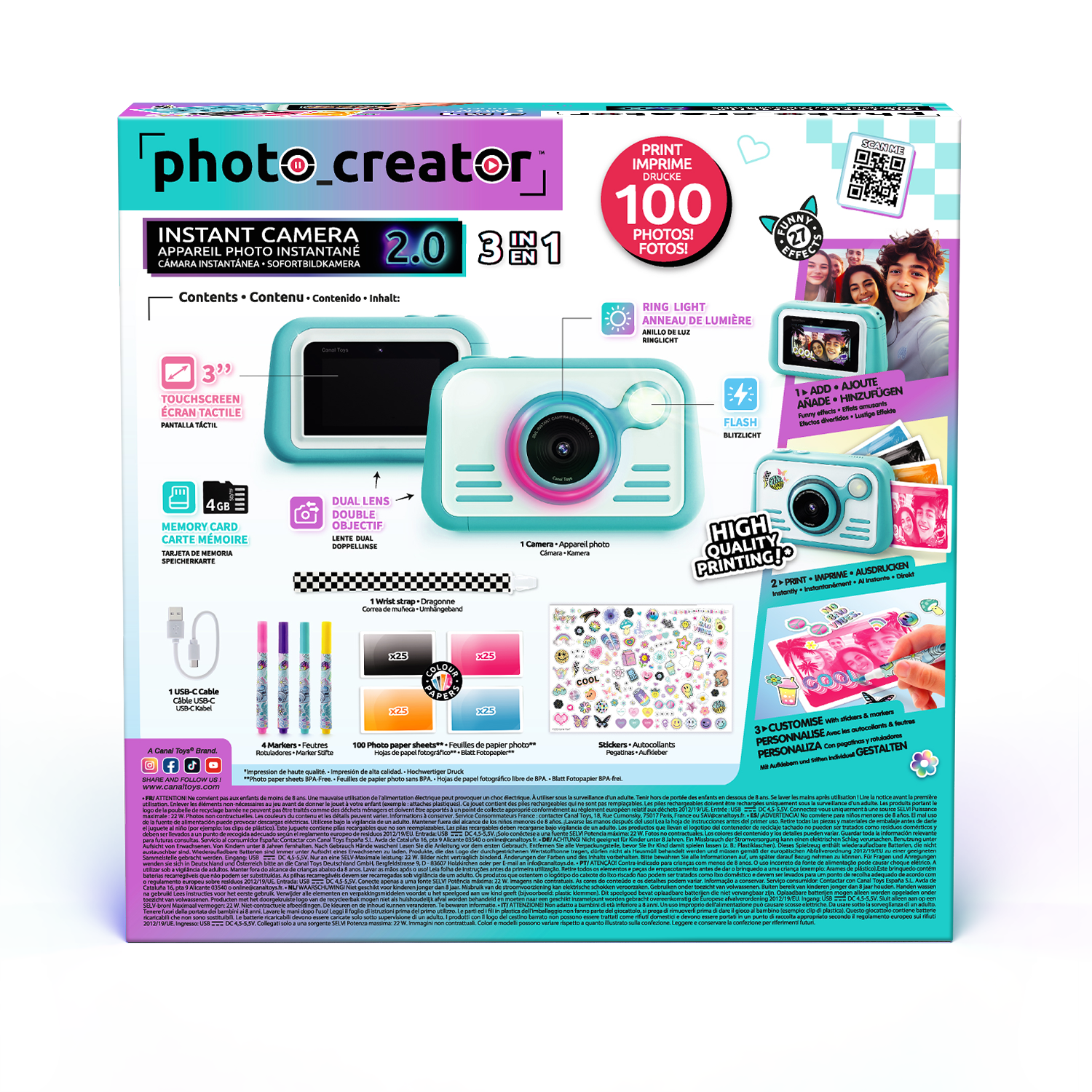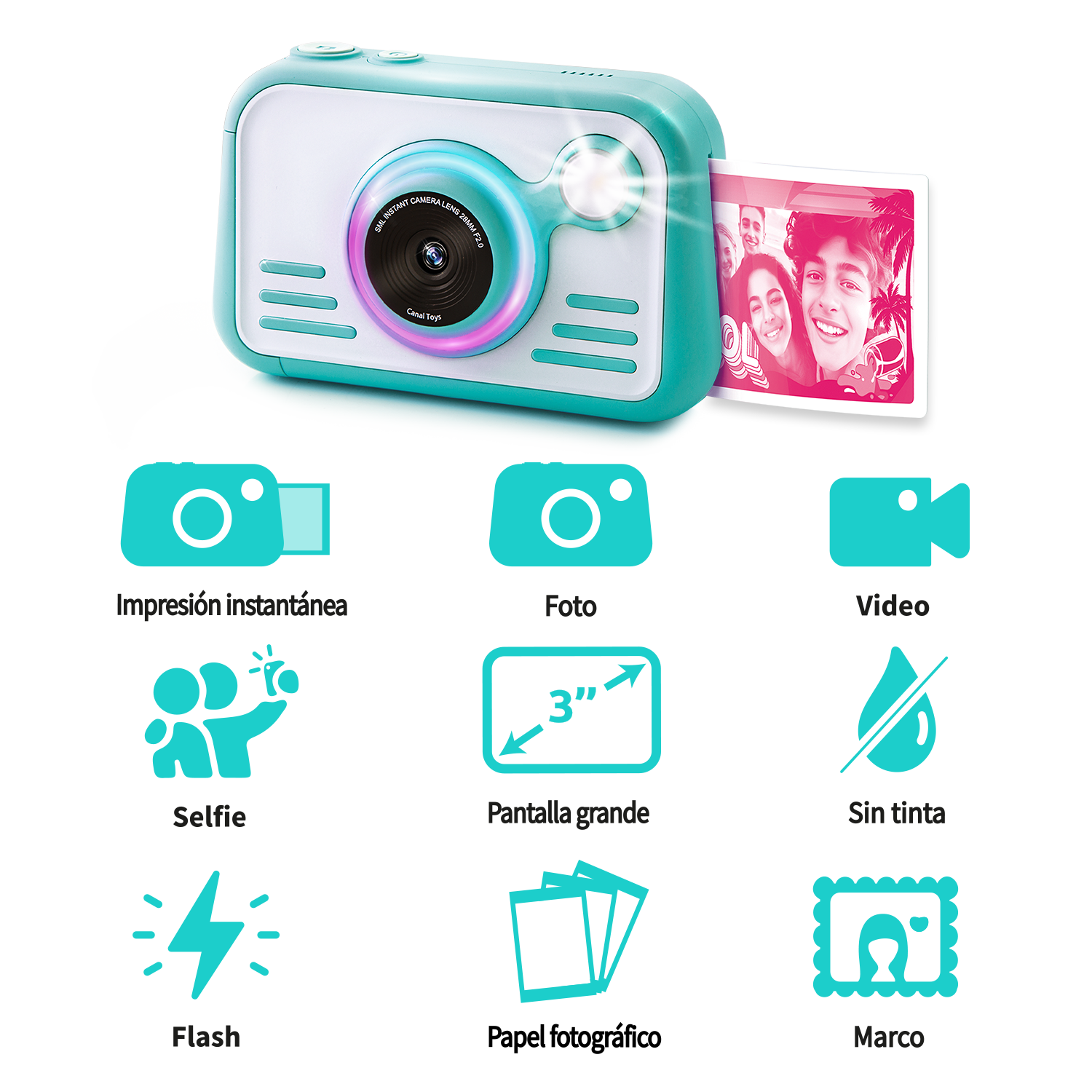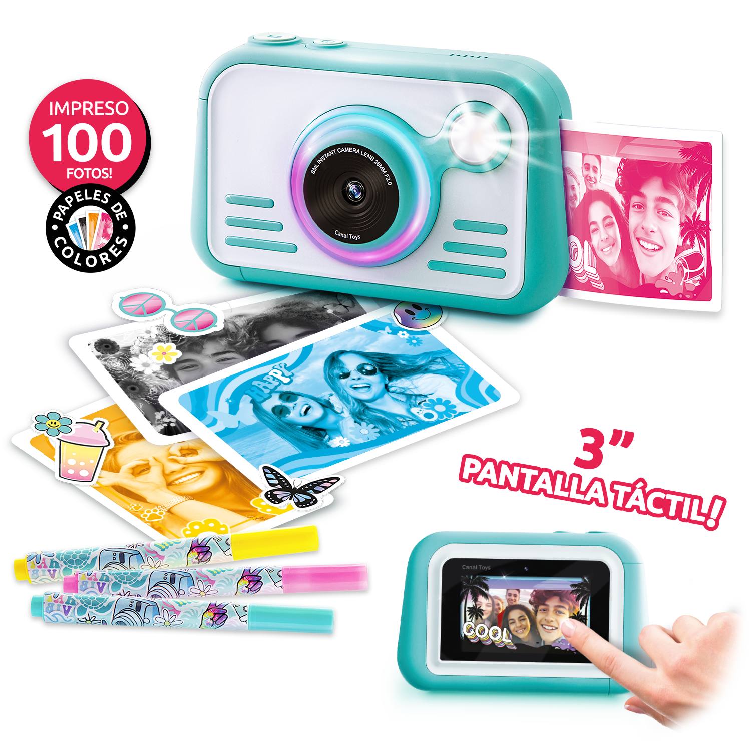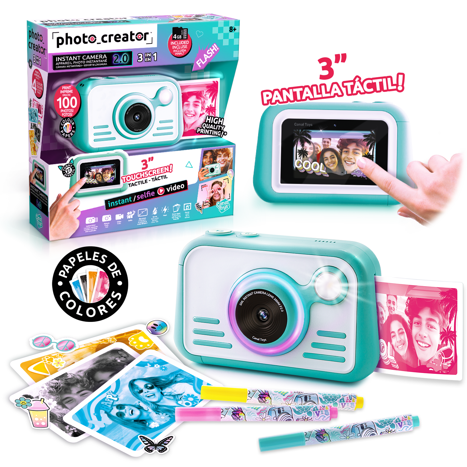 La innovadora y moderna cámara de impresión instantánea 2.0 está llena de creatividad y color. Con sus modos y controles fáciles de usar, es muy fácil tomar la foto perfectamente posicionada ya sea con la lente frontal o selfie. La exposición automática elimina la necesidad de perder el tiempo con la configuración, y una vez que hayas tomado, puedes ver tus fotos en una pantalla táctil HD de 3 pulgadas. Tu impresión de papel brillante de alta calidad se saldrá en pocos segundos y puedes elegir entre 4 colores. El flash y el anillo de luz LED son una característica genial. Personaliza tus fotos con pegatinas y marcadores. Imprime más de 100 fotos. Tarjeta Micro SD de 4 GB incluida.