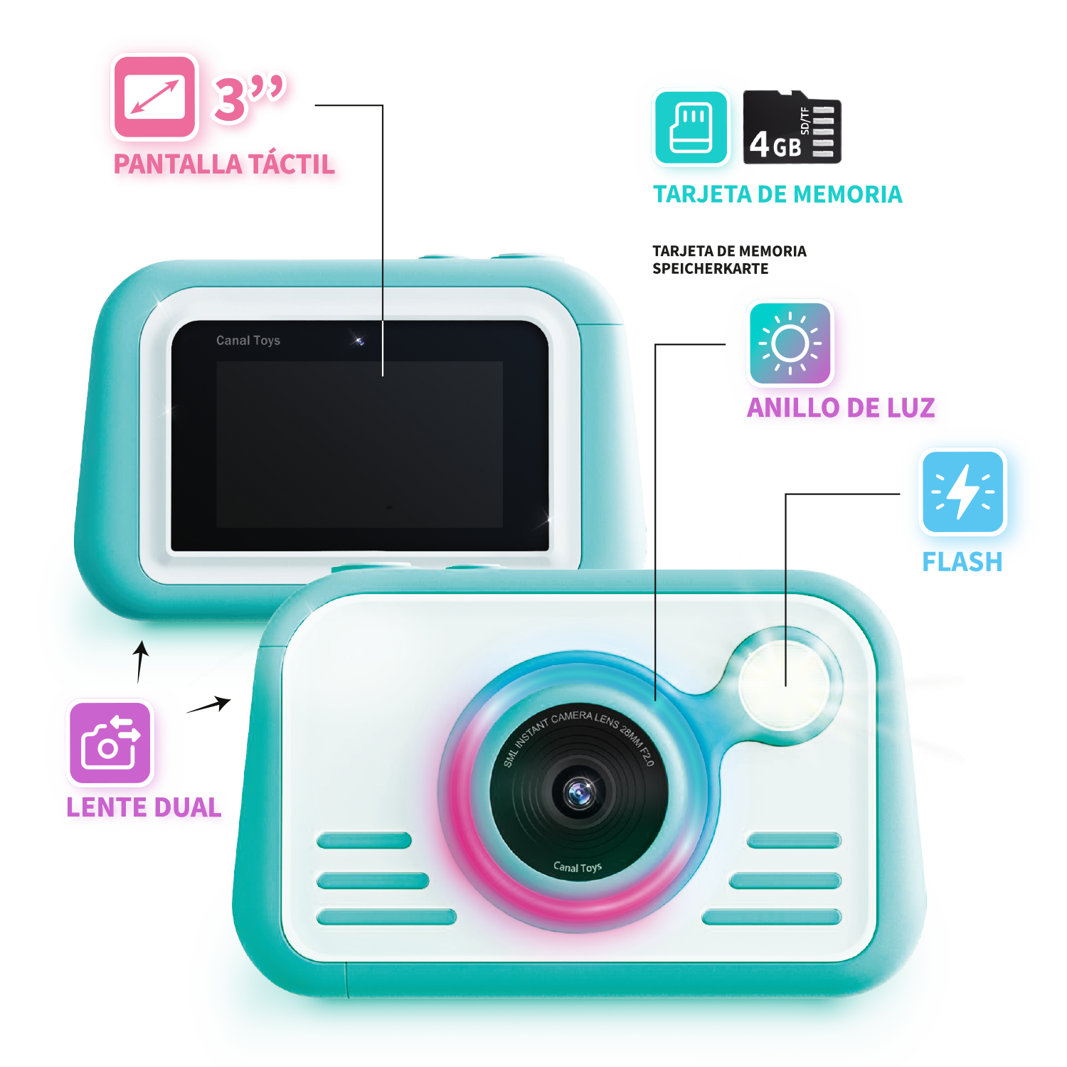 Características geniales: pantalla táctil grande de 3 pulgadas, lente frontal y selfie, flash y anillo de luz LED