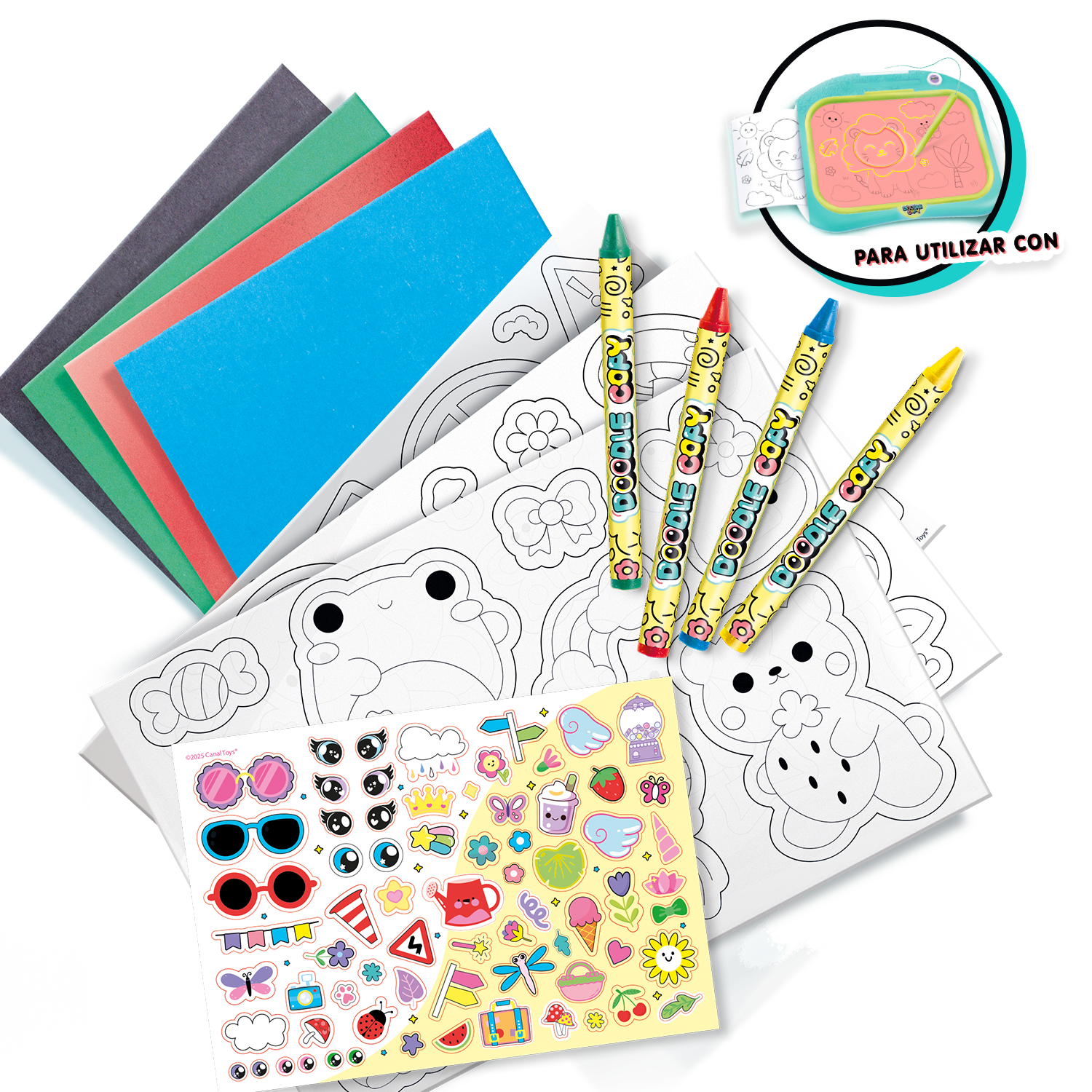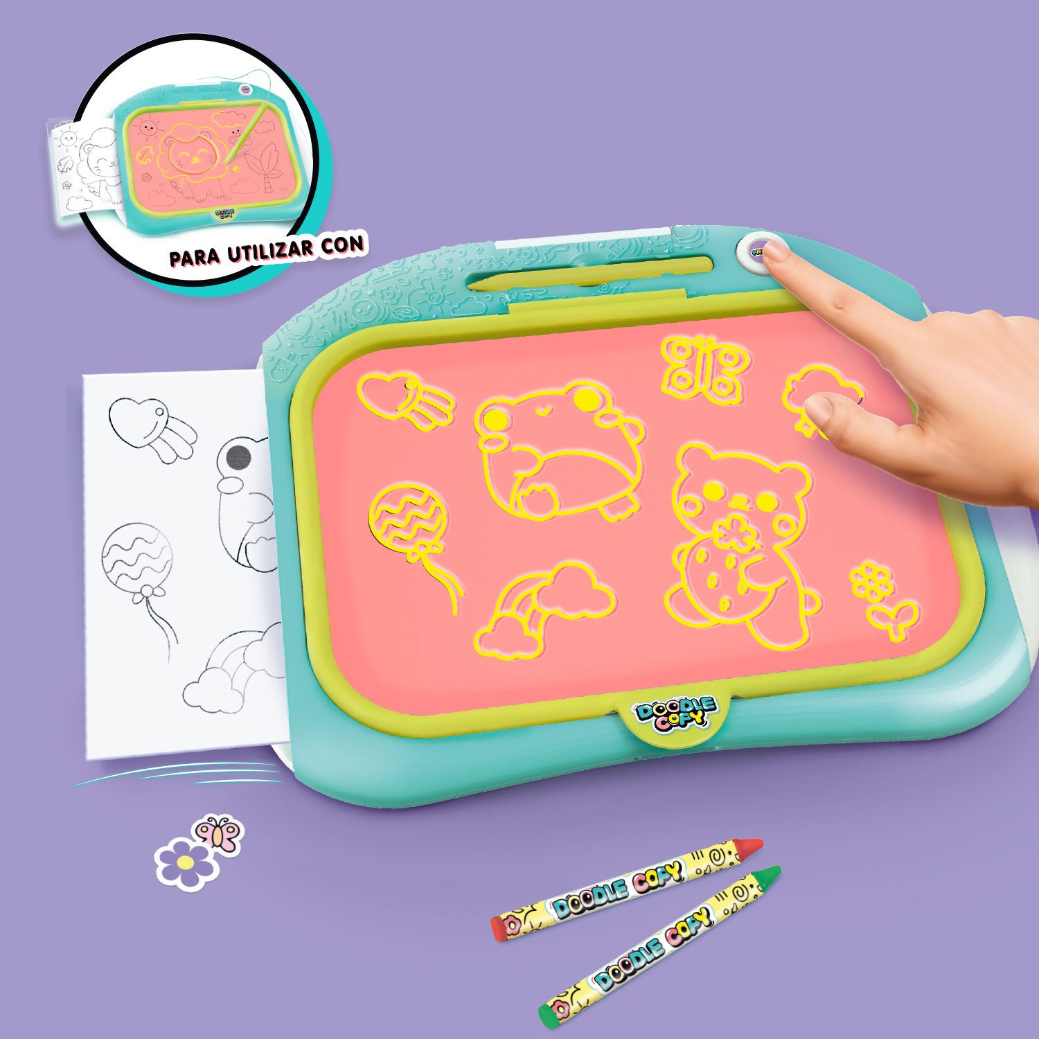 ¡Mantén viva tu creatividad con el kit de recambio Doodle Copy! Incluye 6 hojas de carbón, 10 hojas en blanco, 3 hojas con plantillas, 4 lápices de colores y 1 hoja de pegatinas: ¡todo lo que necesitas para seguir trazando, imprimiendo y coloreando con tu Doodle Copy!