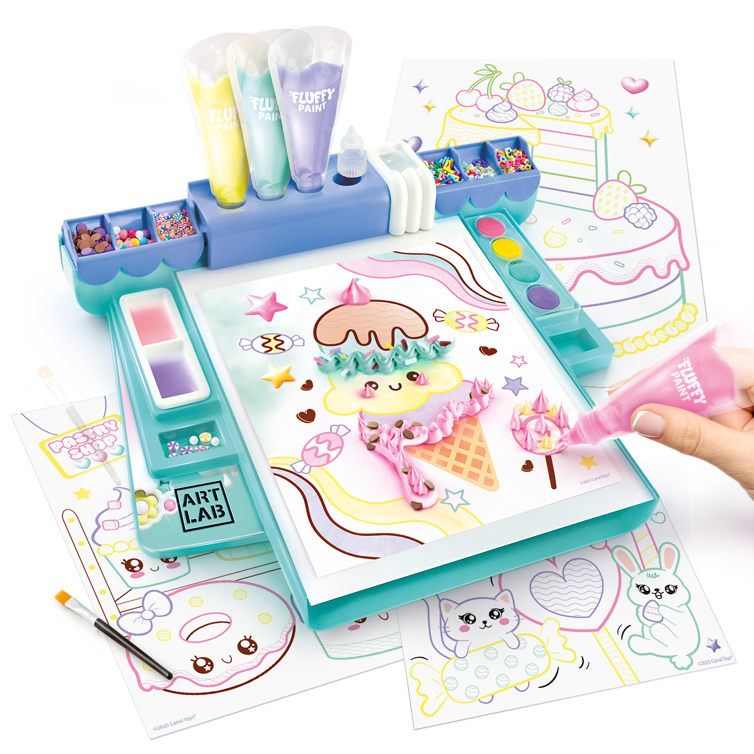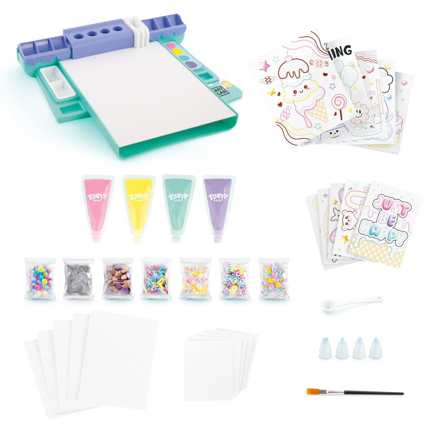 - CONTIENE: 1 Estudio de pintura, 4 Pinturas esponjosas, 4 Puntas, 4 Pinturas al agua, 10 Pósteres para pintar, 10 Hojas blancas, 1 Pincel, 1 Cuchara, 7 Bolsas de adornos.