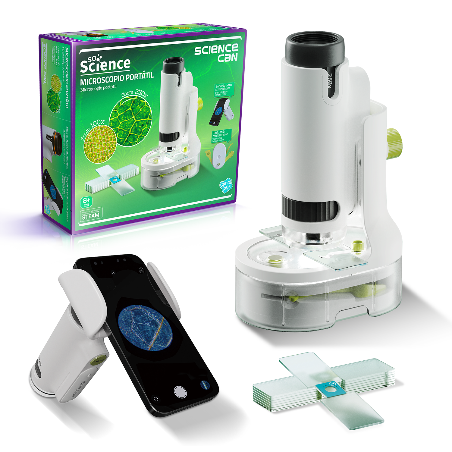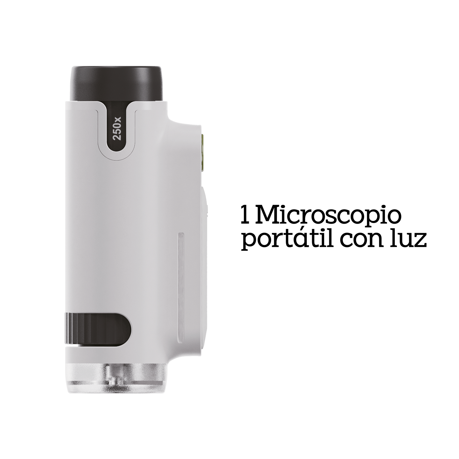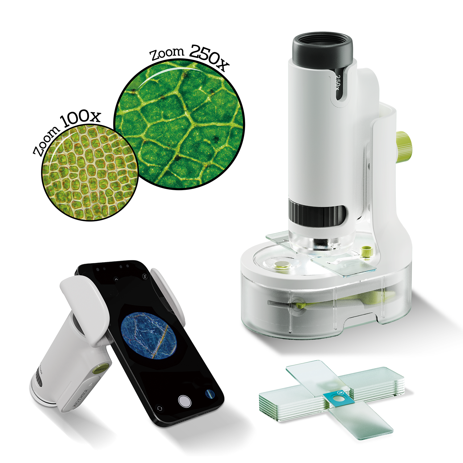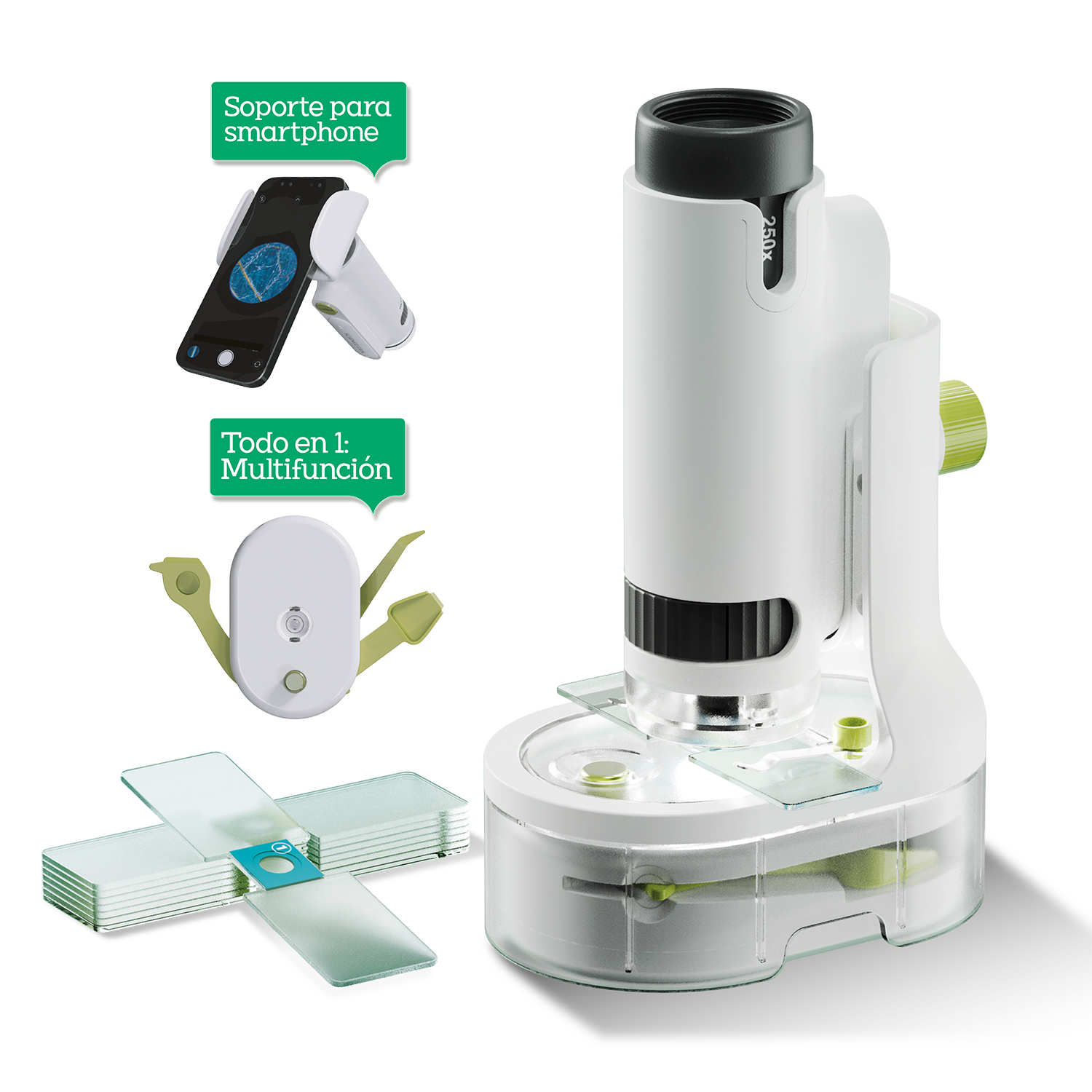 Portátil y desmontable, ¡este microscopio va a todas partes! Colócalo sobre su base para mayor precisión y personaliza tus diapositivas con las herramientas incorporadas. Aumenta el zoom hasta 250x para observar y captura fácilmente tus descubrimientos con un smartphone.