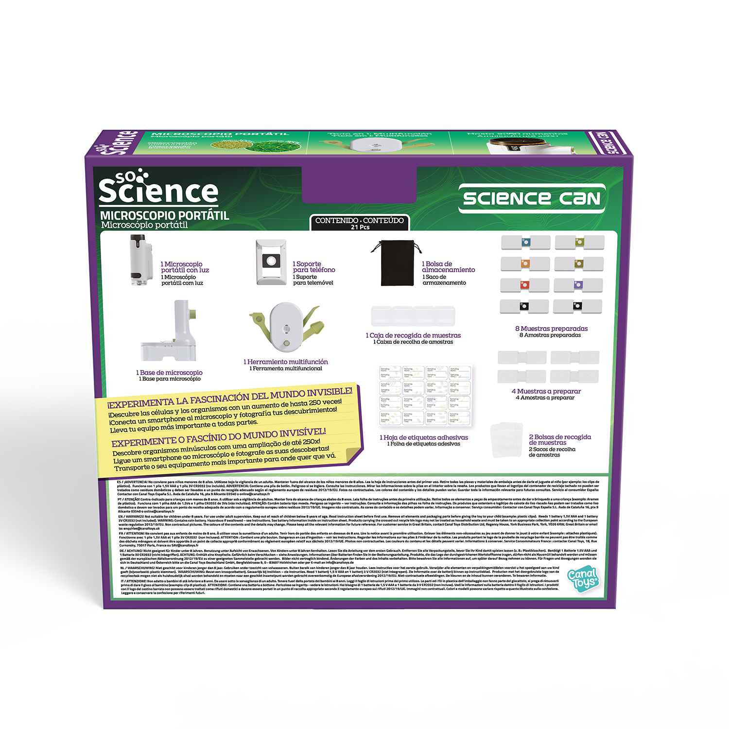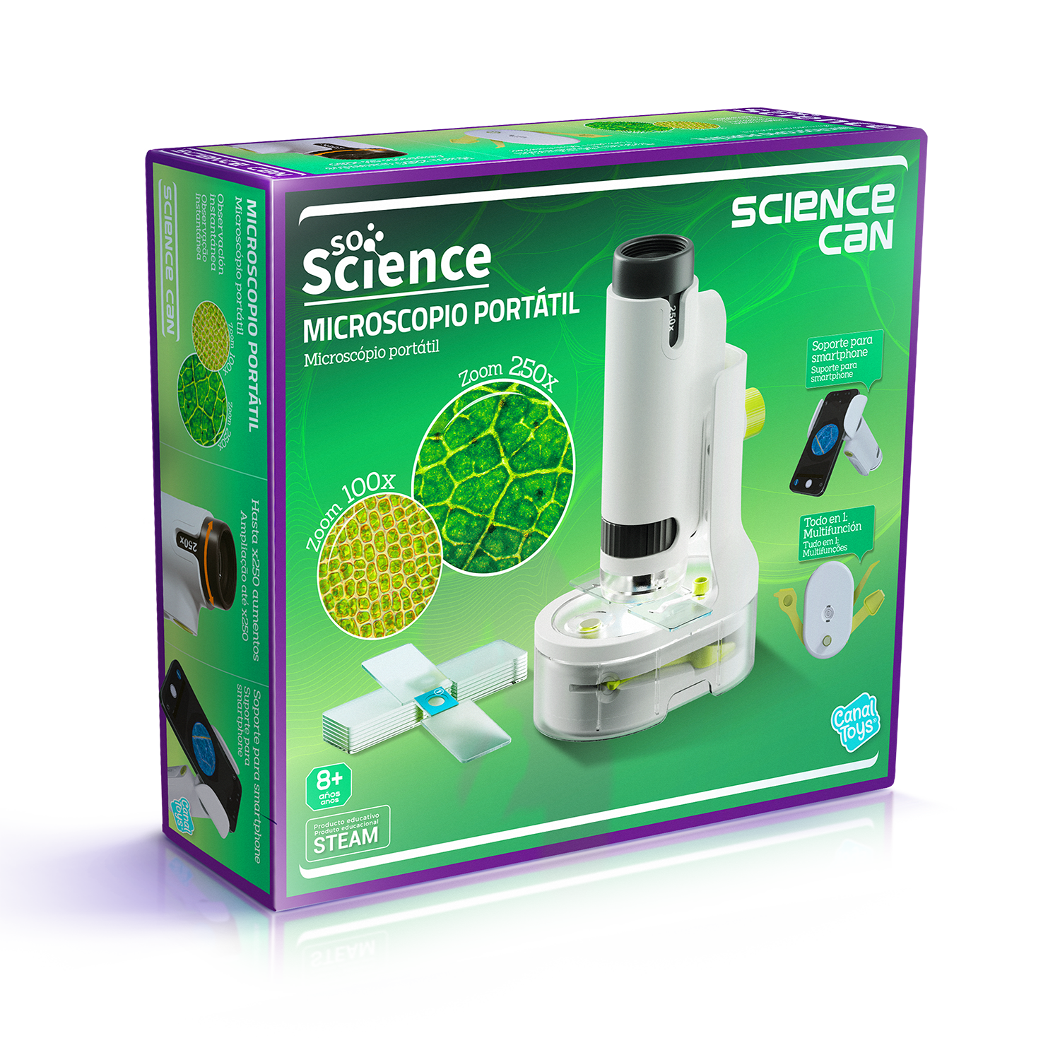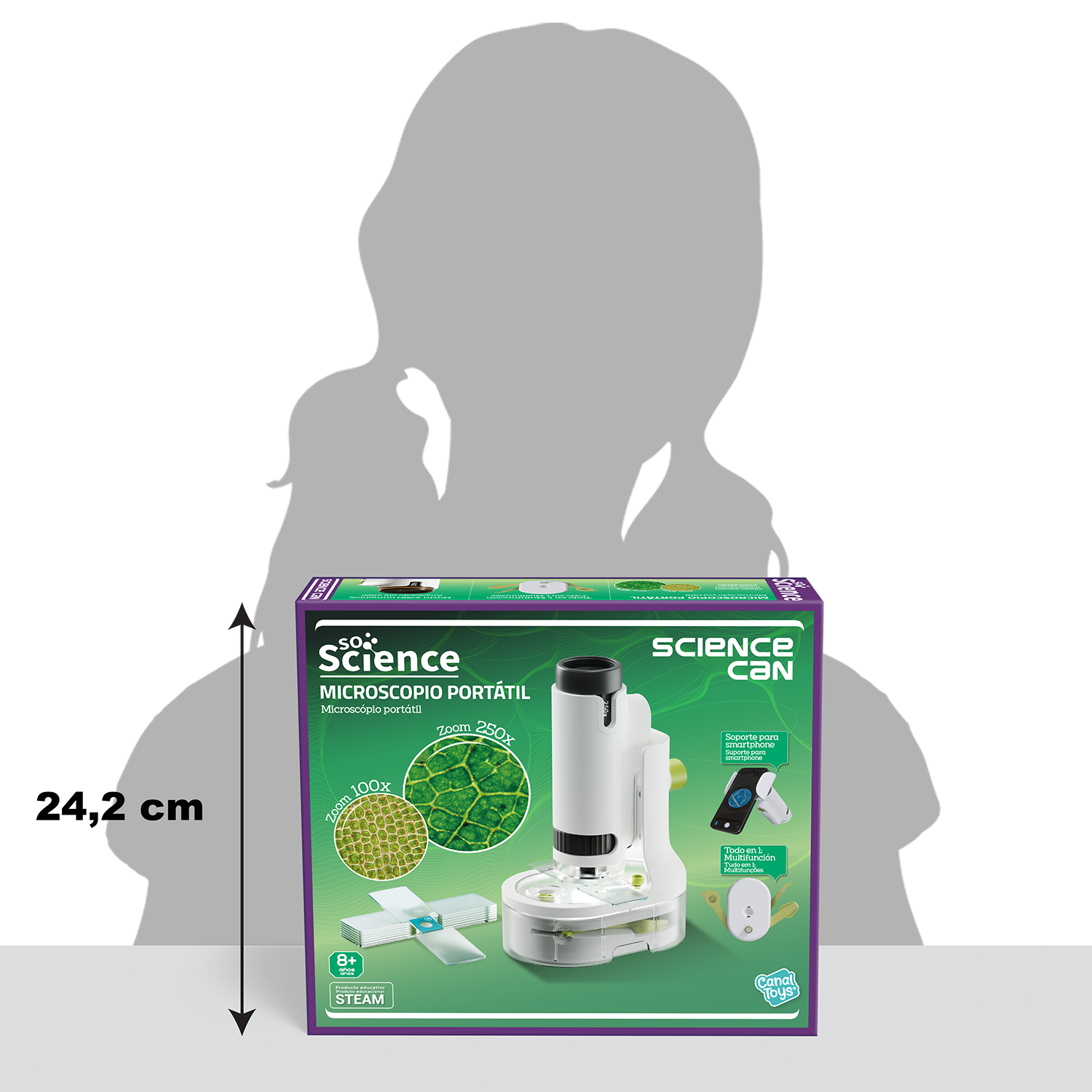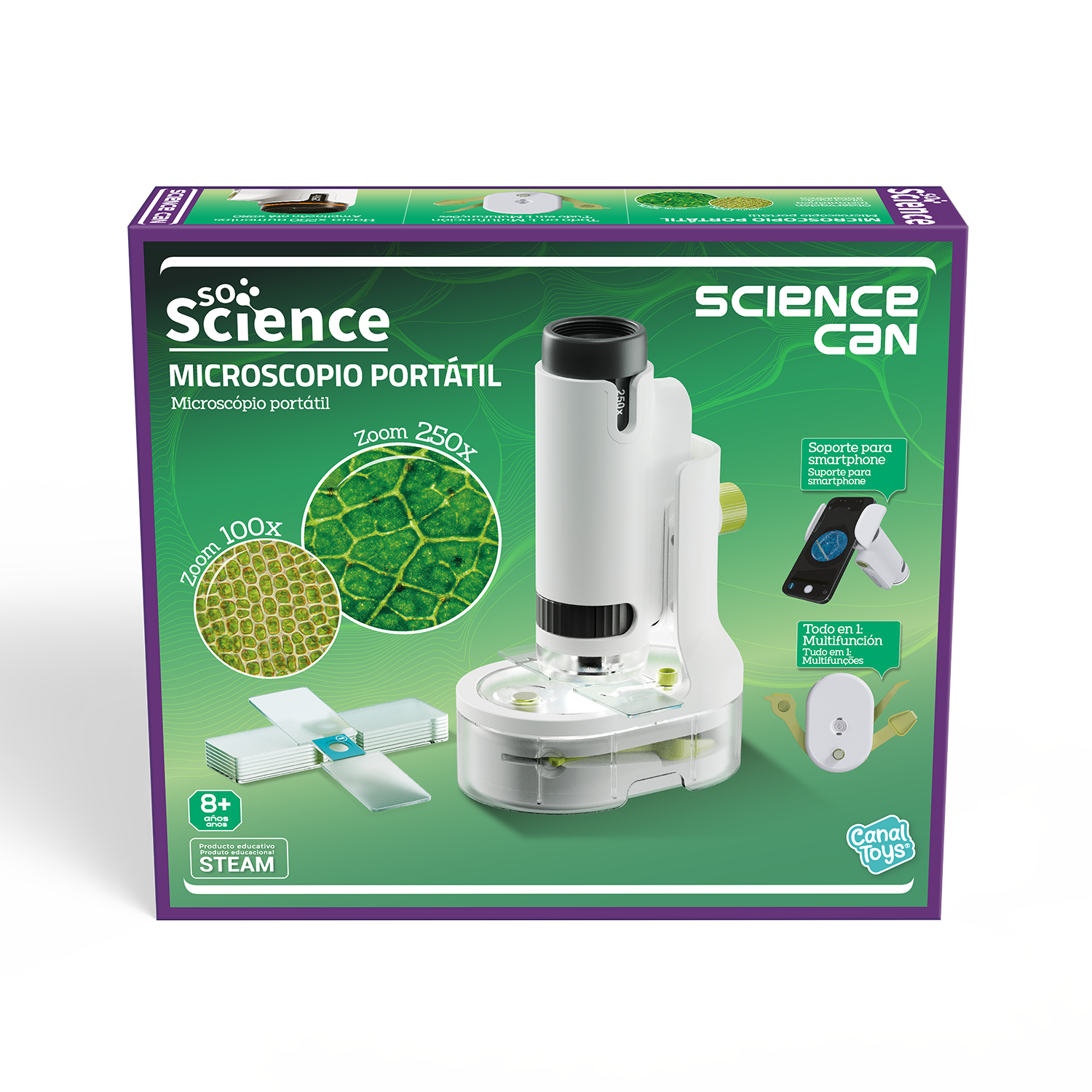 Portátil y desmontable, ¡este microscopio va a todas partes! Colócalo sobre su base para mayor precisión y personaliza tus diapositivas con las herramientas incorporadas. Aumenta el zoom hasta 250x para observar y captura fácilmente tus descubrimientos con un smartphone.