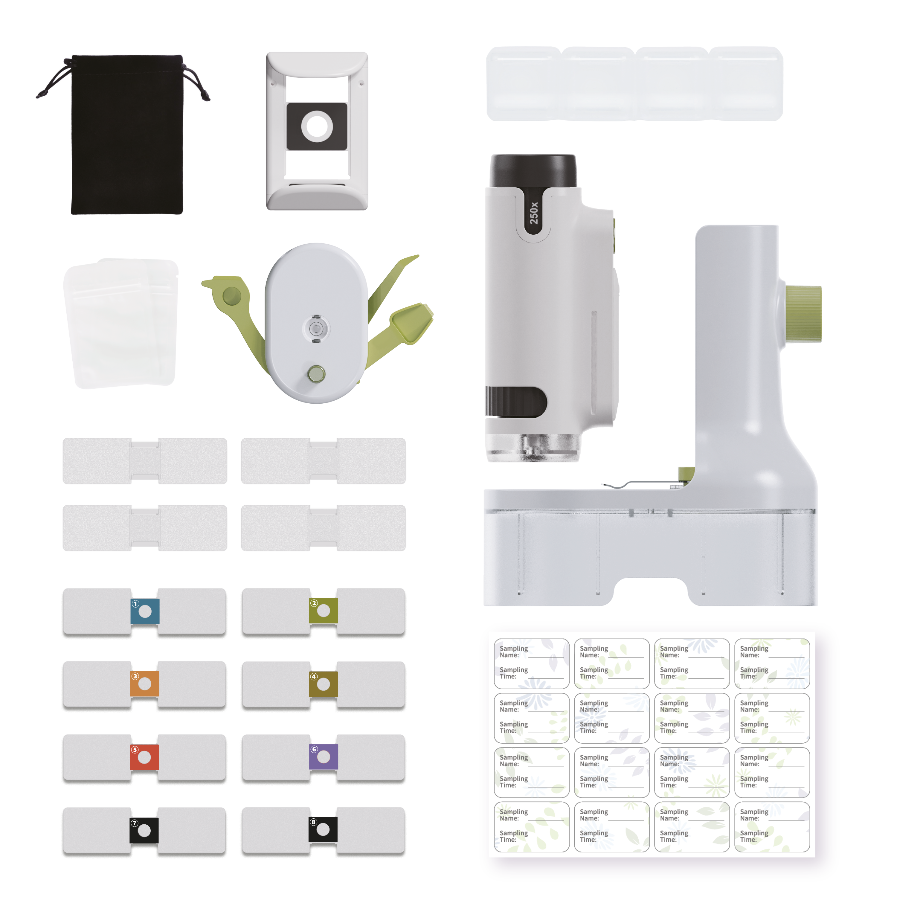 - Pie de microscopio - Microscopio - Soporte para teléfono móvil - Herramienta multifunción - 1 caja de recogida de muestras - 1 bolsa de terciopelo - 8 portaobjetos preparados - 4 portaobjetos en blanco - 2 bolsas de almacenamiento -Etiquetas autoadhesivas