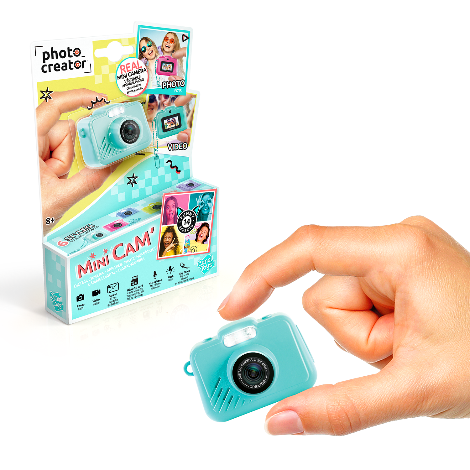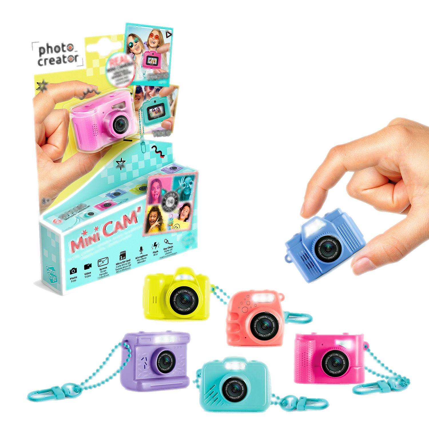 Disfruta de horas de diversión y creatividad con los 6 modernos modelos de Mini' Cam para elegir. Perfecta para capturar momentos cotidianos, esta minicámara digital te permite personalizar tus fotos y vídeos con 6 divertidos marcos y 8 coloridos filtros. Ultra compacta y ligera, cabe fácilmente en un bolsillo o se engancha al bolso gracias a su llavero incorporado. Con la tarjeta micro-SD de 1 GB incluida, podrás tener todas tus fotos y vídeos a mano y transferirlos fácilmente a tu ordenador, tableta u otro dispositivo mediante el cable USB-C. Desarrollada en Francia, esta cámara está diseñada para niños a partir de 8 años, en cumplimiento de las normas europeas de seguridad de los juguetes. La forma de la cámara y la disposición de los botones están diseñados para un uso intuitivo y un fácil manejo.
