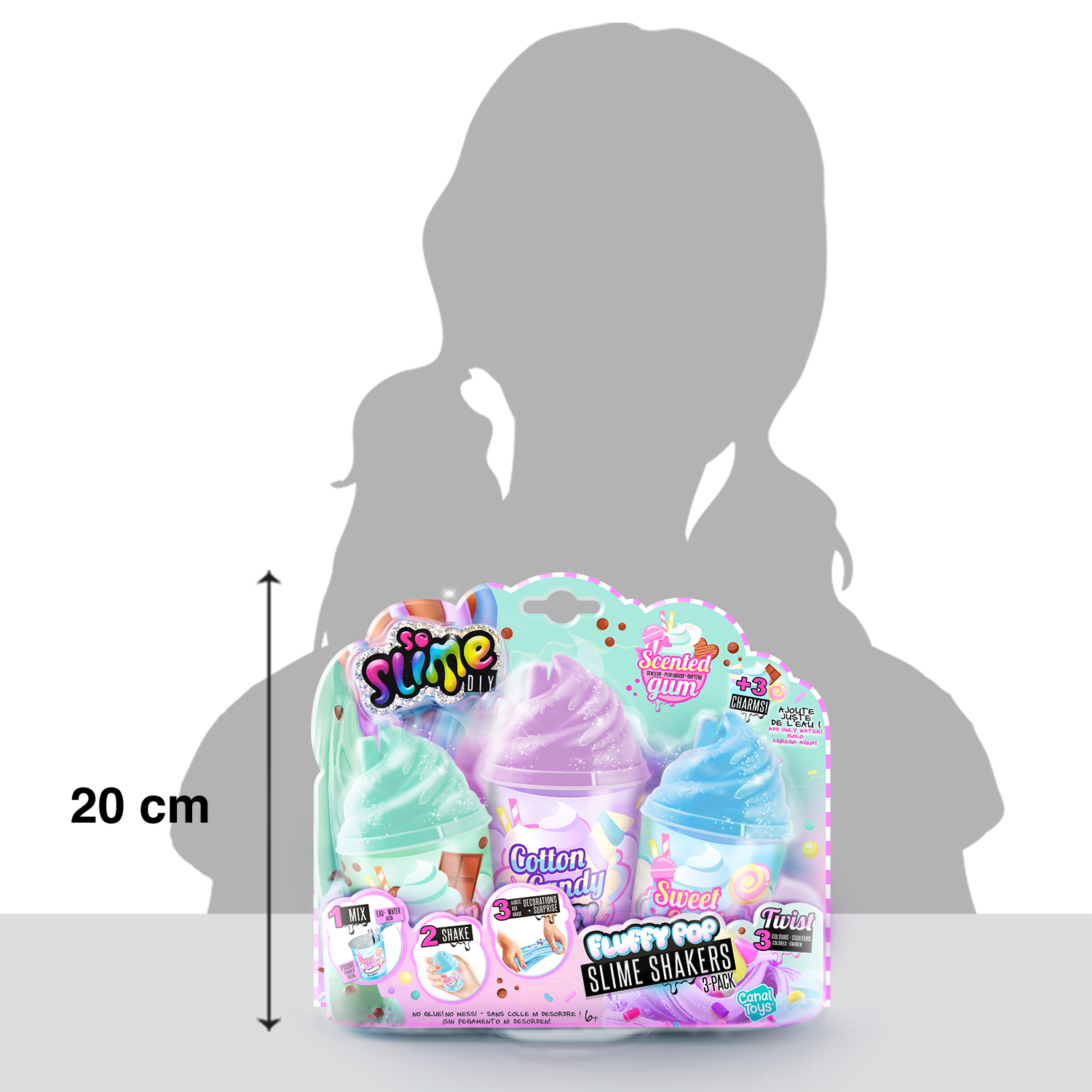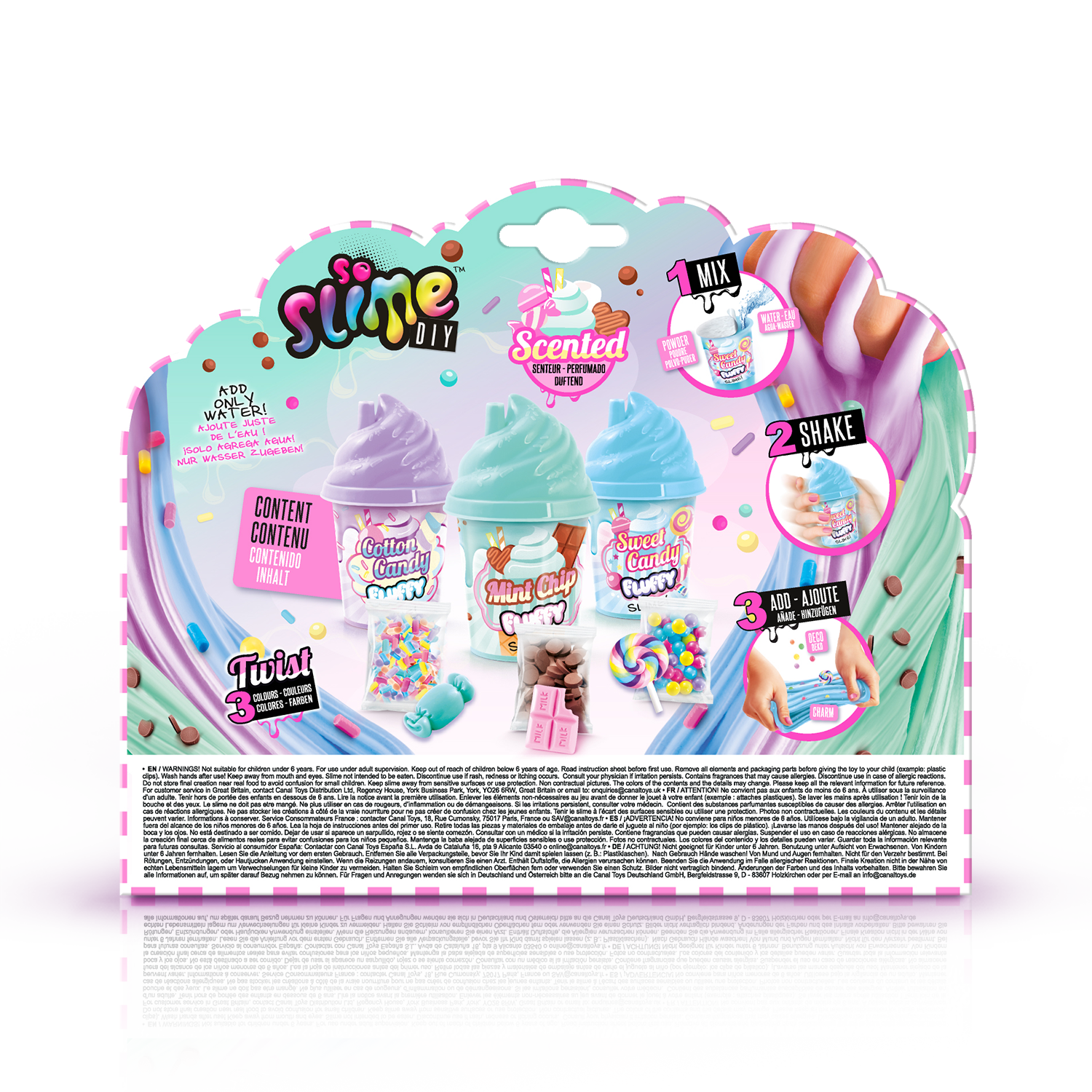 No apto para niños menores de 6 años. Utilizar bajo la supervisión de un adulto. Mantener fuera del alcance de los niños menores de 6 años. Lea la hoja de instrucciones antes del primer uso. Retire todos los elementos y partes del embalaje antes de dar el juguete a su hijo (ejemplo: clips de plástico). Lávese las manos después de usarlo. Mantener alejado de la boca y los ojos. El Slime no debe comerse. Suspenda su uso si aparece erupción, enrojecimiento o picor. Consulte a su médico si persiste la irritación. Contiene fragancias que pueden provocar alergias. Suspenda su uso en caso de reacciones alérgicas. No almacenar la creación final cerca de alimentos reales para evitar confusiones en los niños pequeños. Mantenga la baba alejada de superficies sensibles o utilice protección. Fotos no contractuales. Los colores del contenido y los detalles pueden cambiar. Conserve toda la información pertinente para futuras consultas.