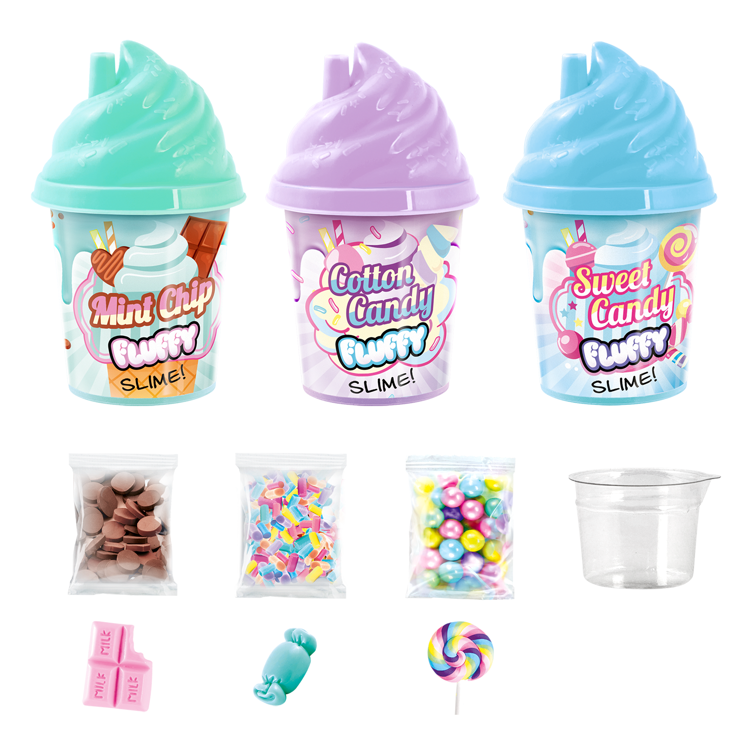 - 3 Agitadores con polvo de Slime - 1 Vaso medidor - 3 Bolsas de decoración - 3 Mini personajes - 1 Hoja de instrucciones