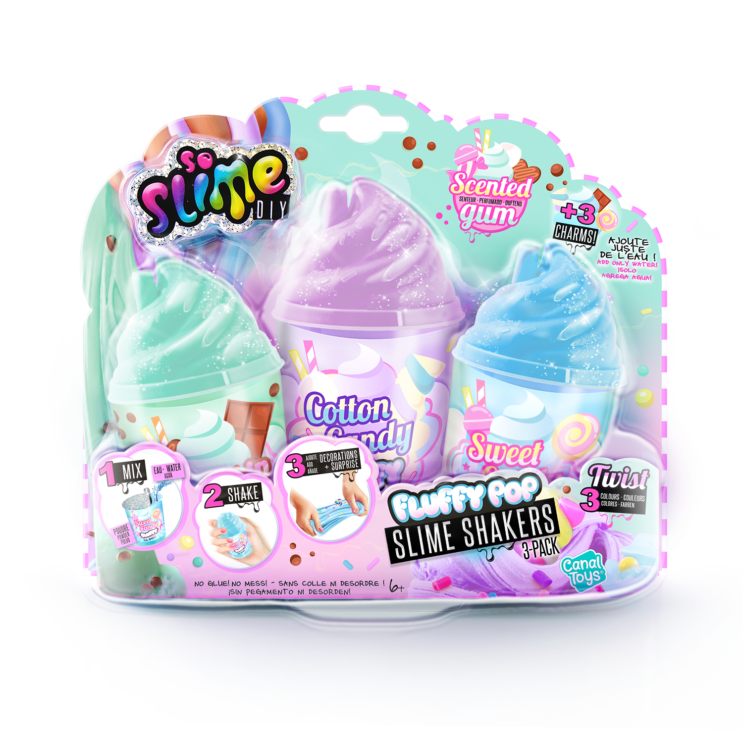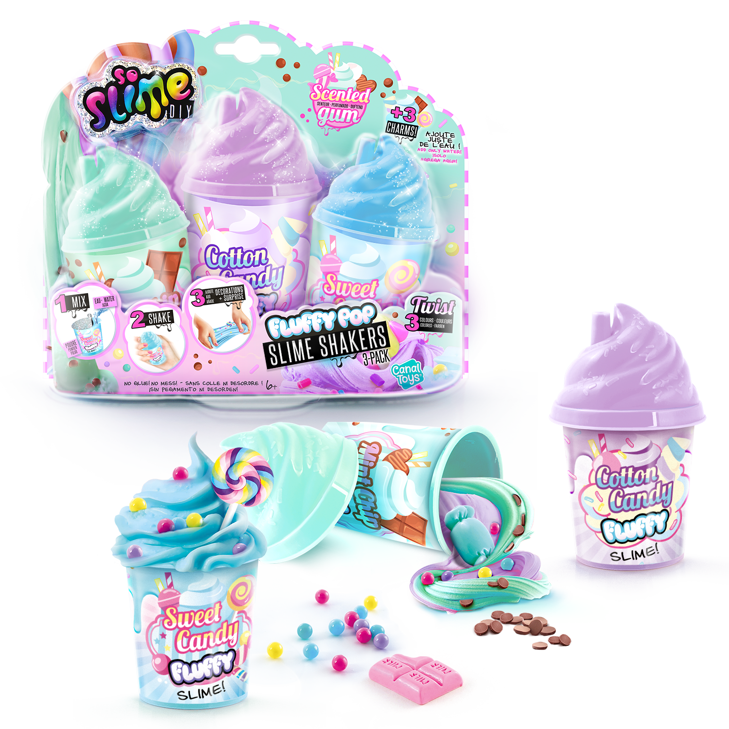 ¡Crea 3 slimes mezclando los polvos con agua y añadiendo después purpurina o confeti! ¡Y dentro hay 3 miniaturas sorpresa!