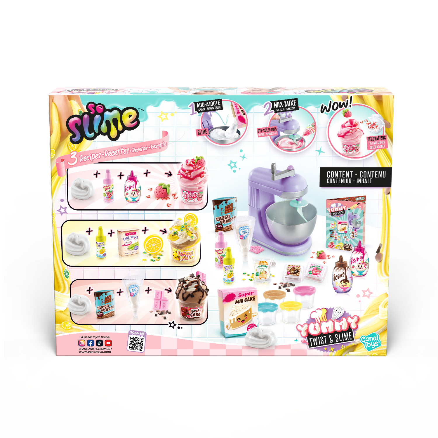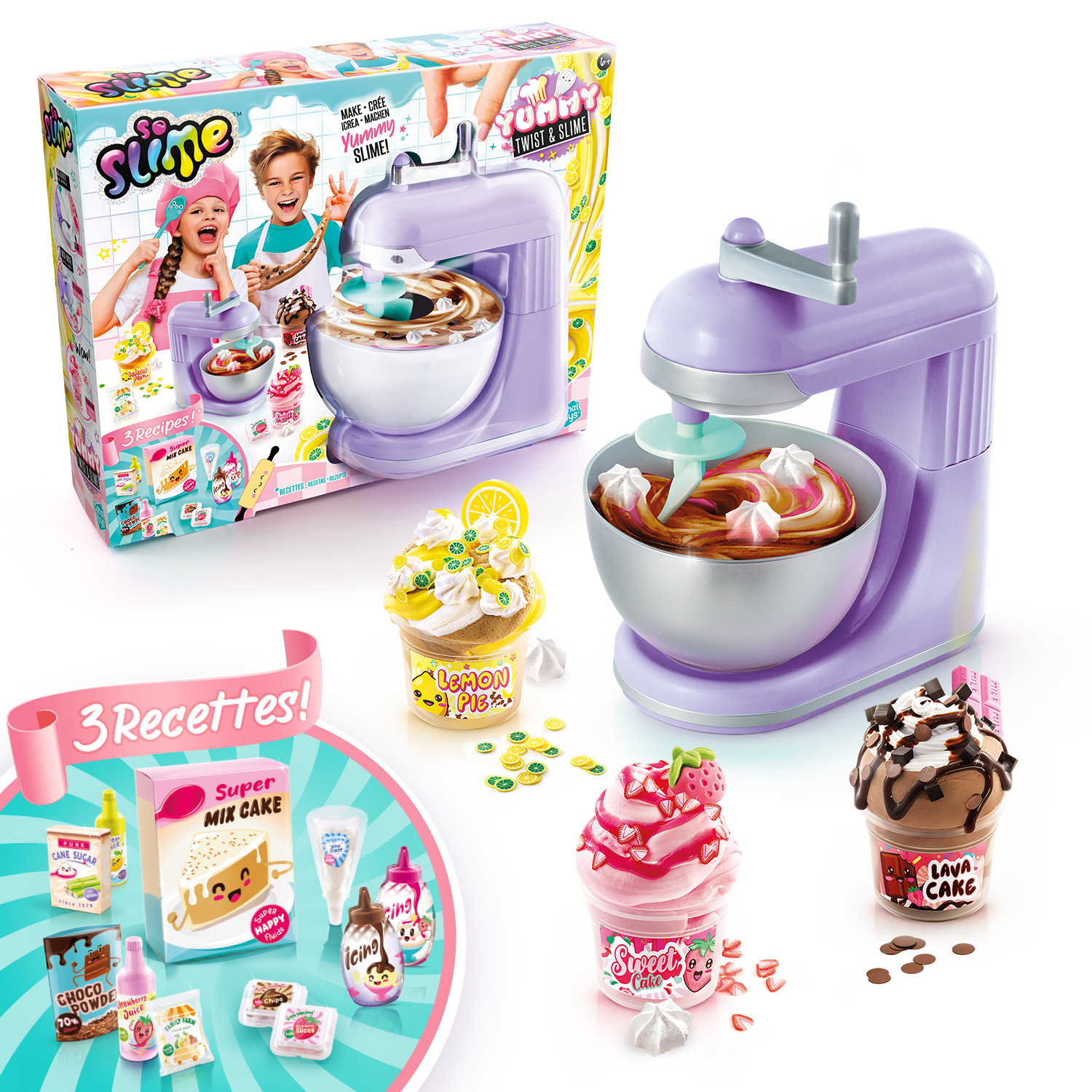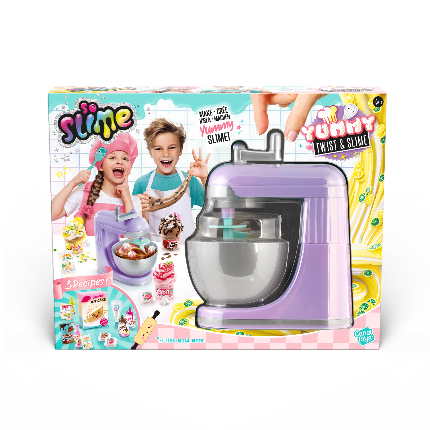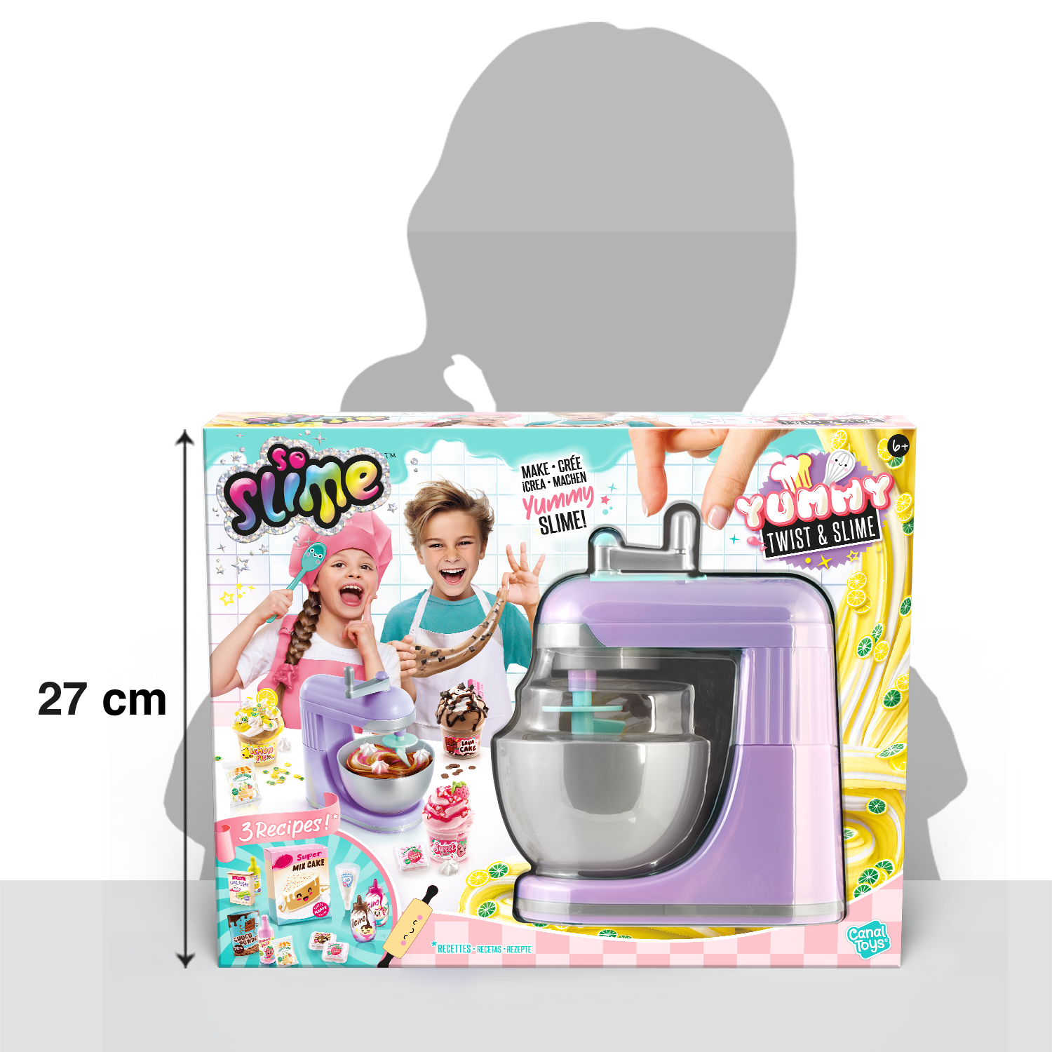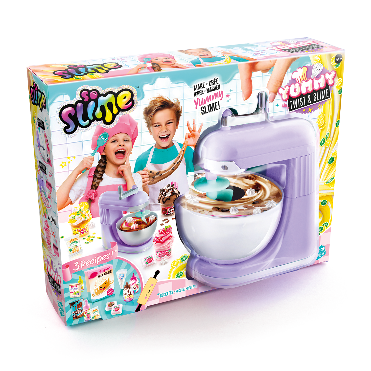 No apto para niños menores de 6 años. Utilizar bajo la supervisión de un adulto. Mantener fuera del alcance de los niños menores de 6 años. Lea la hoja de instrucciones antes del primer uso. Retire todos los elementos y partes del embalaje antes de dar el juguete a su hijo (ejemplo: clips de plástico). Lávese las manos después de usarlo. Mantener alejado de la boca y los ojos. El Slime no debe comerse. Suspenda su uso si aparece erupción, enrojecimiento o picor. Consulte a su médico si persiste la irritación. Contiene fragancias que pueden provocar alergias. Suspenda su uso en caso de reacciones alérgicas. No almacenar la creación final cerca de alimentos reales para evitar confusiones en los niños pequeños. Mantenga la baba alejada de superficies sensibles o utilice protección. Fotos no contractuales. Los colores del contenido y los detalles pueden cambiar. Conserve toda la información pertinente para futuras consultas